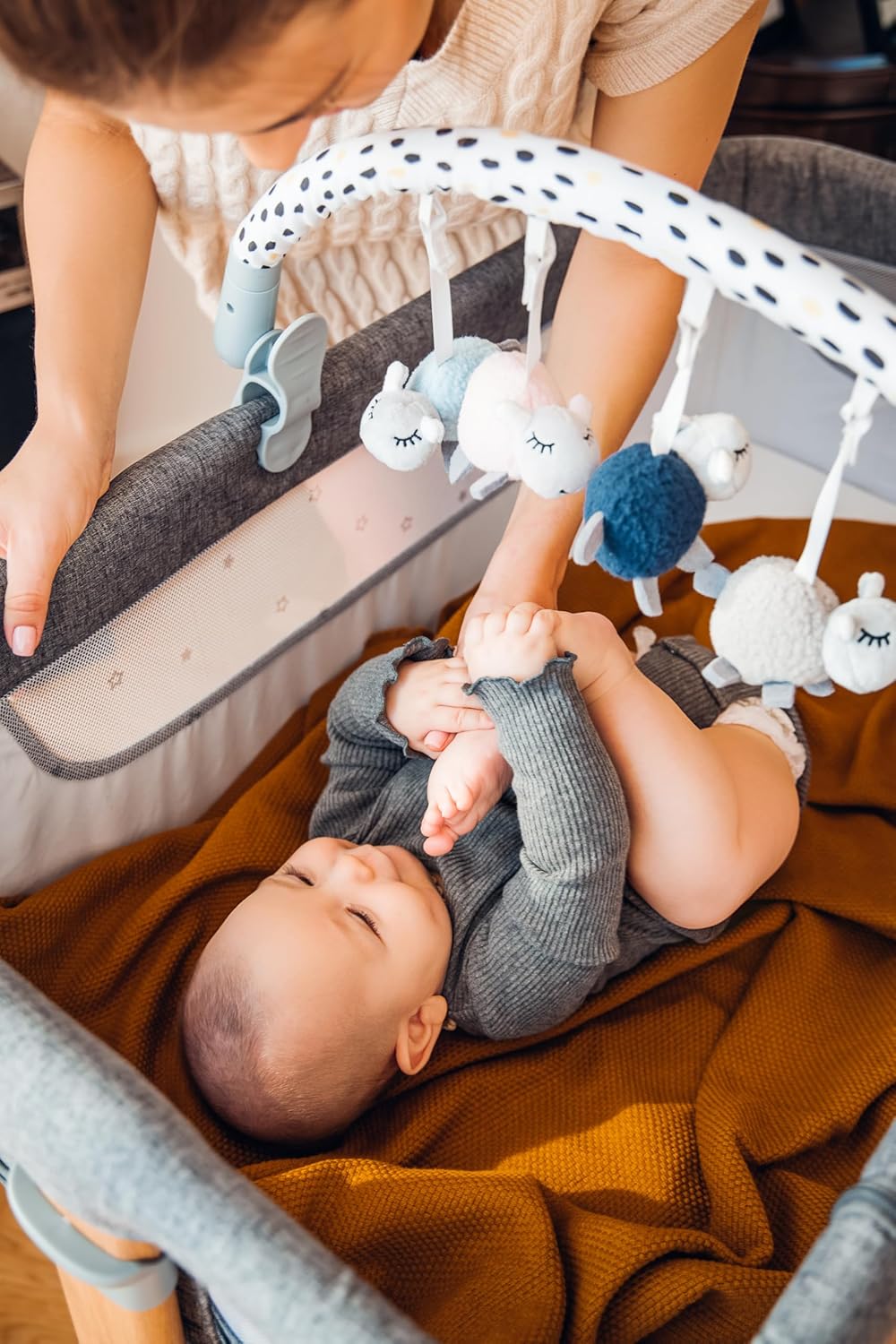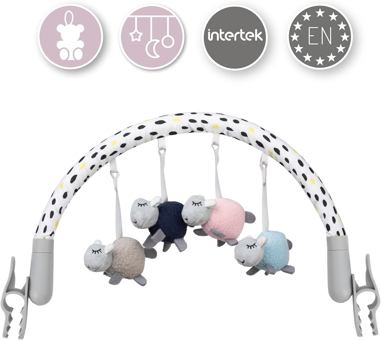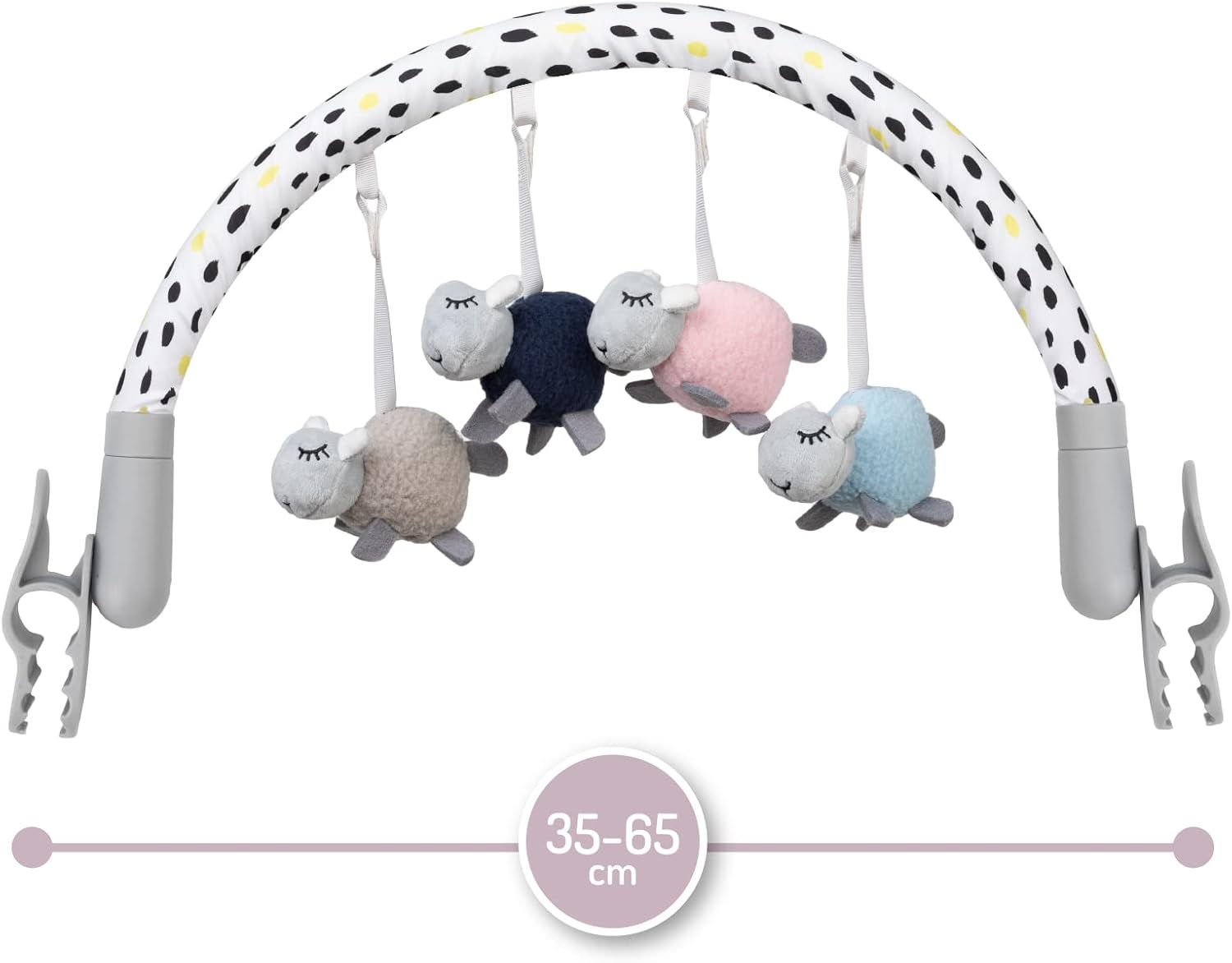 Da 0 a 5 mesi: la gruccia è adatta per neonati, neonati e bambini a partire dal primo giorno di vita fino a circa 5 mesi. Ha le dimensioni di 83 x 6,5 x 4,5 cm e pesa circa 500 g Facile da montare: l'arco è dotato di due pratici morsetti che consentono un facile montaggio a incastro in pochi secondi su una culla, un passeggino, un seggiolino per auto o una culla. Larghezza di montaggio: 35-65 cm Con 4 giocattoli sensomotori: i giocattoli stimolano lo sviluppo motorio e audiovisivo del bambino e la sua percezione nei primi mesi. I giocattoli possono essere rimossi dal gancio e utilizzati separatamente Angolo di inclinazione regolabile: l'archetto ha un angolo di inclinazione regolabile in modo continuo in modo da adattarsi perfettamente alla portata delle mani del bambino, così i giocattoli saranno sempre a portata di mano Igienico: i giocattoli e la custodia possono essere lavati in lavatrice con ciclo delicato. La staffa può essere pulita con un panno umido. Disinfettabile con disinfettanti in commercio