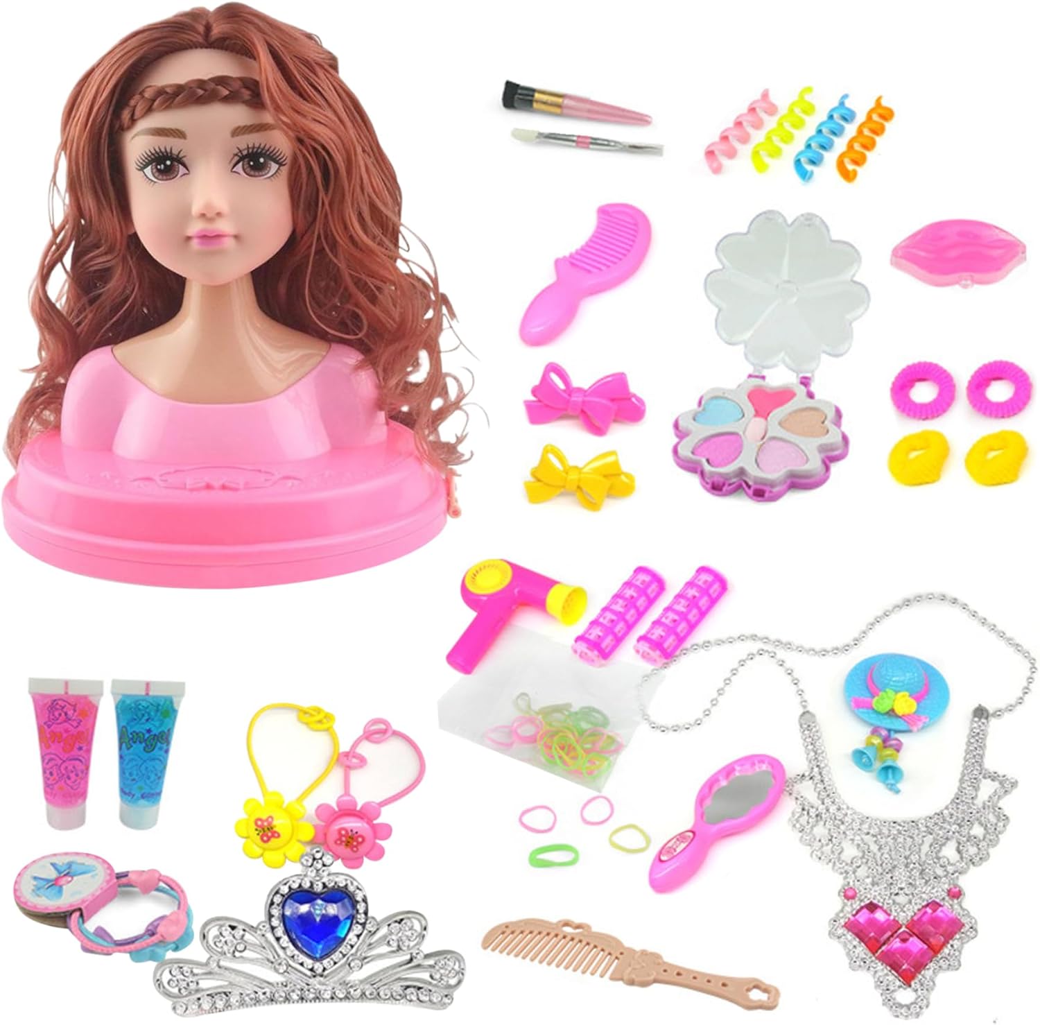 Set Testa Bambola da Truccare: Questo set Testa della bambola da pettinare contiene 58 accessori per hairstyling e makeup: una testa per acconciature, specchio, pettine, phon simulato, ferro per arricciare, accessori per capelli, pennelli da trucco, palette per fard, rossetto, palette per ombretti, adesivi e altri accessori decorativi. La Testa da Pettinare è stata sviluppata specificamente per le bambine e contiene tutto ciò di cui hanno bisogno per sperimentare acconciature creative e trucchi sulla testa della bambola. Testa per Acconciature per Bambini di Alta Qualità: Questa Testa da Pettinare Bambina ha una pelle liscia, occhi splendenti e lunghe ciglia che creano un effetto affascinante. I capelli lunghi, folti e morbidi possono essere facilmente trasformati in diverse acconciature. I piccoli talenti della hairstyling possono intrecciare trecce, fare code di cavallo o creare eleganti chignon con ogni tipo di accessorio. La testa per acconciature è lavabile e può essere ri-stylata più volte, offrendo così ore di divertimento creativo durante l'acconciatura e il design! Testa Truccabile Lavabile per Bambine: I cosmetici per bambini sono realizzati con materiali idrosolubili e ipoallergenici, sono delicati sulla pelle e appositamente adatti ai bambini. Inoltre, sono facili da pulire e non macchiano i vestiti. I bambini possono non solo truccare la bambola, ma anche truccarsi da soli. Così si immergono con entusiasmo nel gioco di ruolo offerto da questo testa giocattolo. Promuove la Creatività: I ricchi accessori per capelli e per il makeup permettono ai bambini di creare liberamente acconciature secondo la loro immaginazione e di combinare makeup. Ciò non solo promuove l'immaginazione, la creatività e il senso estetico dei bambini, ma allena anche le loro abilità pratiche. Lascia che i bambini giochino insieme agli amici e godano dell'esperienza immersiva di un salone di parrucchiere! Regalo Ideale per Bambine: Questa testa di bambola per acconciature è il regalo perfetto per ogni occasione: ideale come regalo di compleanno, regalo di Natale, regalo per la figlia o regalo per feste per bambine di 3,4,5,6,7,8 anni. È perfetta per le bambine che amano la bellezza, l'artigianato e i giochi di ruolo, permettendo loro di esprimere i propri talenti artistici.