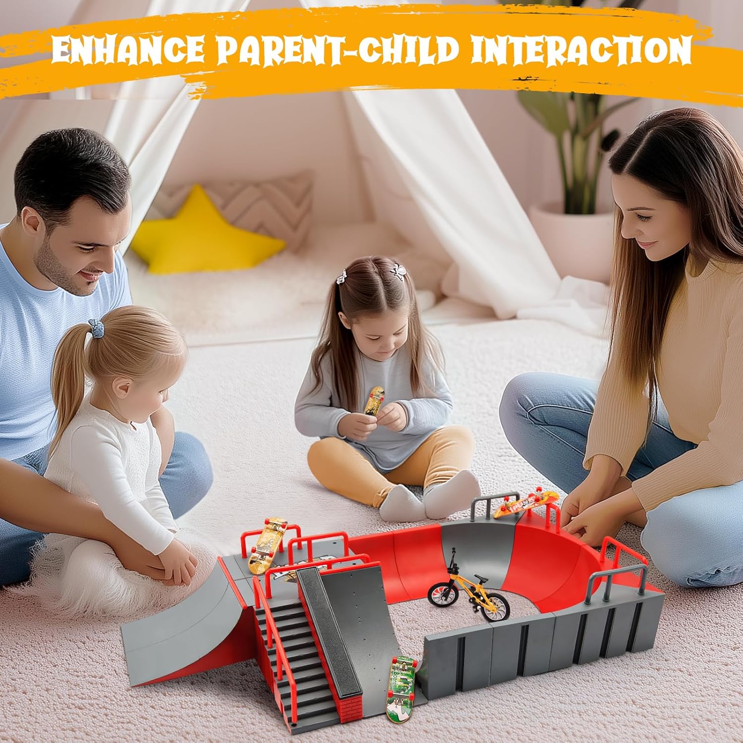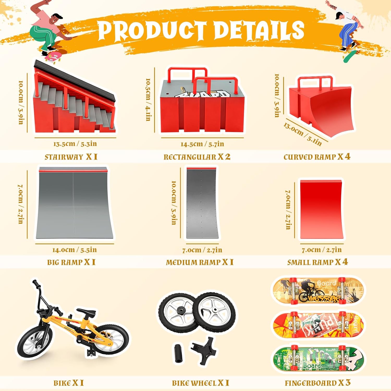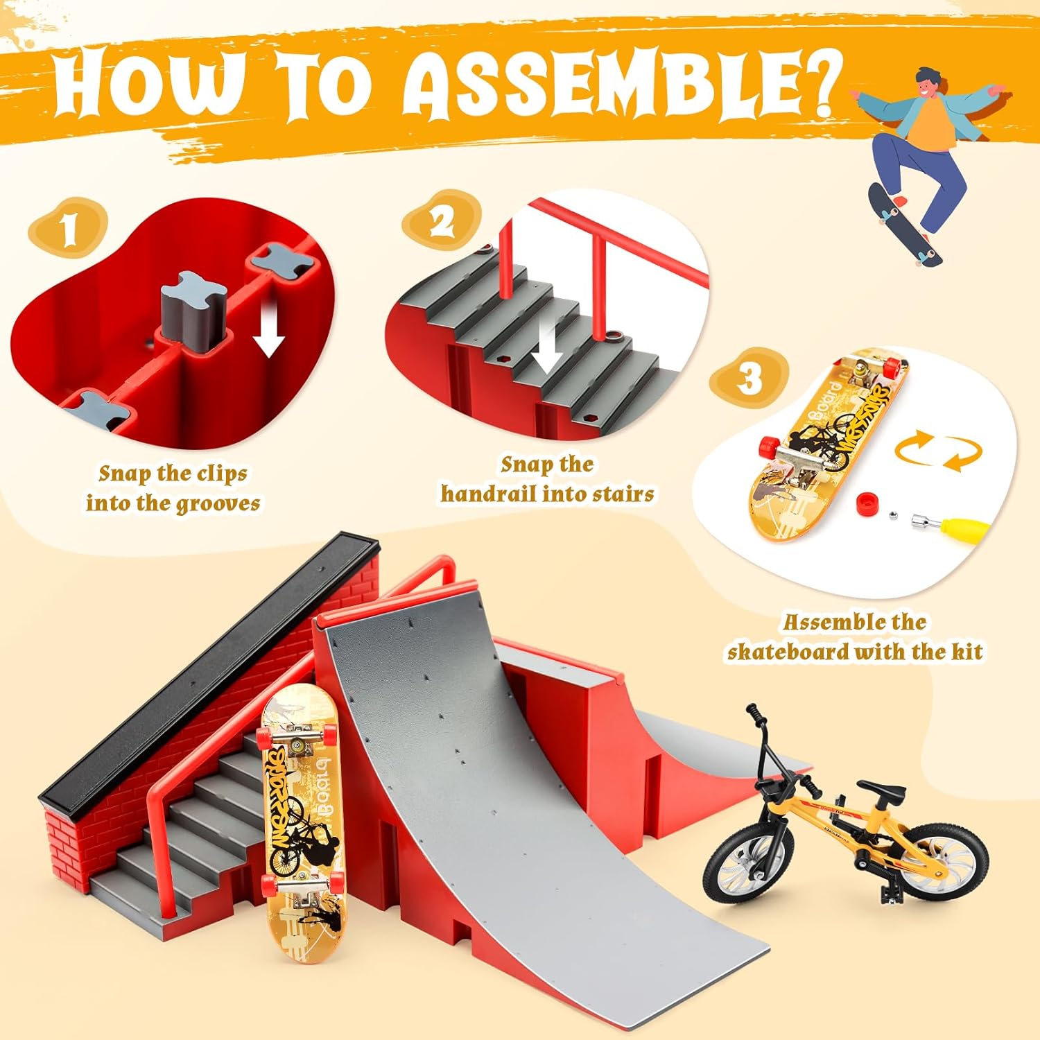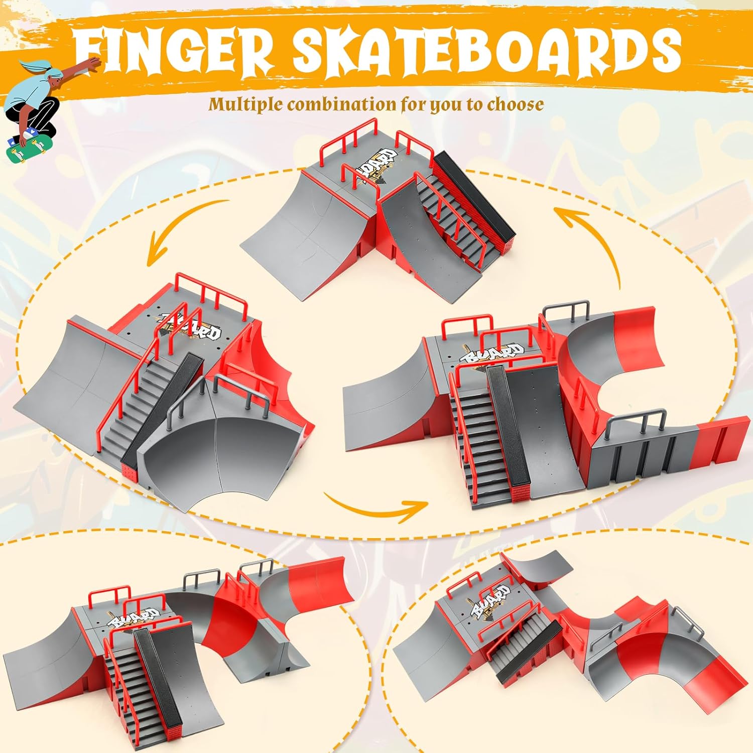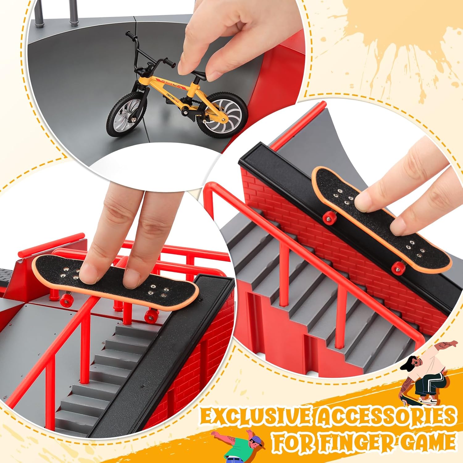 Il finger skateboard è realizzato in materiale plastico ABS durevole ed ecologico di alta qualità. È uno skateboard speciale per la prima educazione dei bambini. Il mini skateboard da dito è dotato di ruote con cuscinetti chiusi, riduce l'attrito e dura a lungo. Può aiutare a portare le abilità di fingerboarding a un livello completamente nuovo. La serie di rampe è composta da quattro scene in totale, che i bambini possono combinare tra loro in base alla propria immaginazione, in modo da migliorare l'abilità manuale del bambino. Il set di accessori per mini skateboard e rampa comprende una scena di rampa + una bicicletta + 3PCS mini fingerboard (colore casuale). Grazie ad esso, è possibile esercitare liberamente la capacità di coordinamento delle dita e sviluppare il cervello. È perfetto come regalo di Halloween, Natale, compleanno e altre festività per i vostri amici o bambini. Molto popolare tra gli appassionati di skateboard.