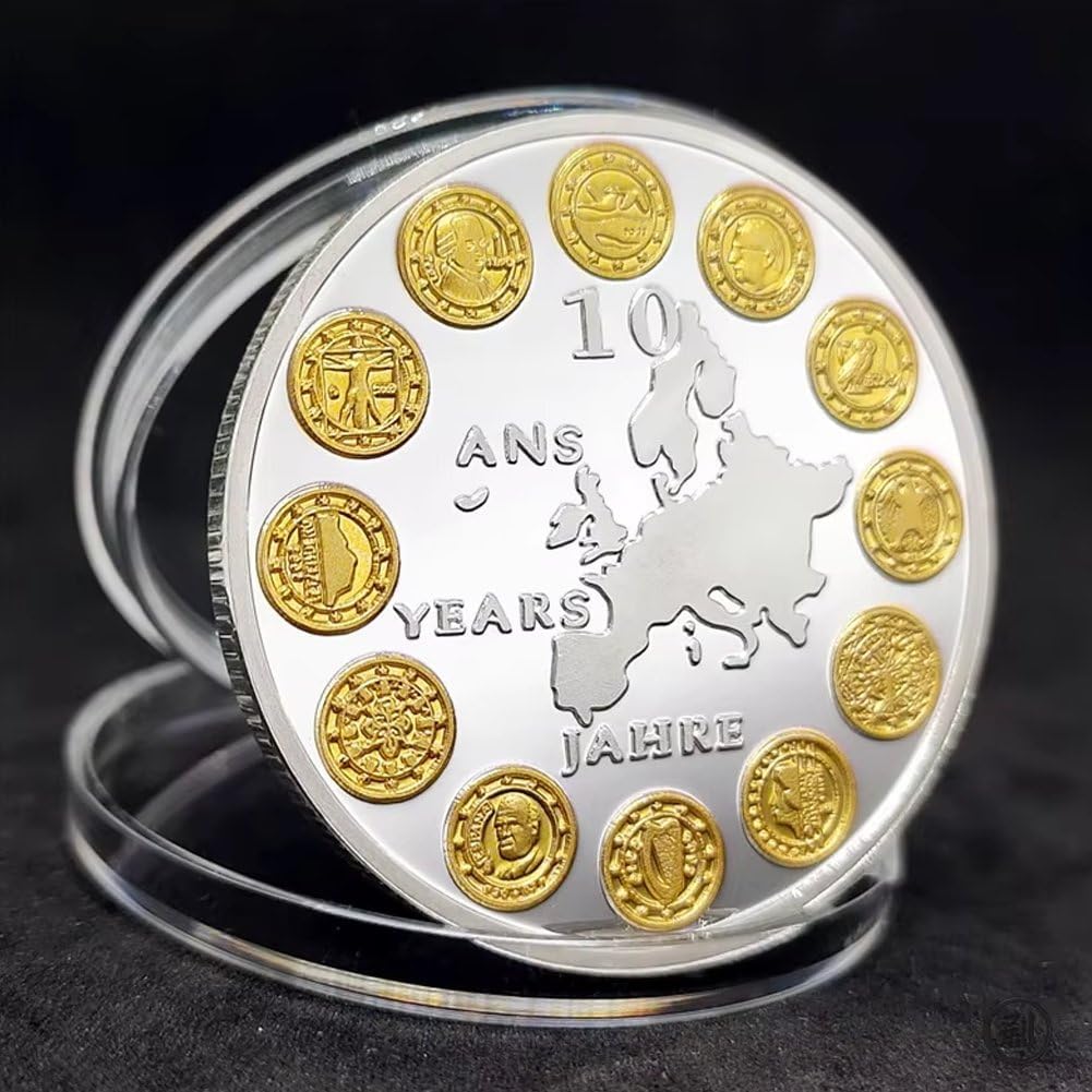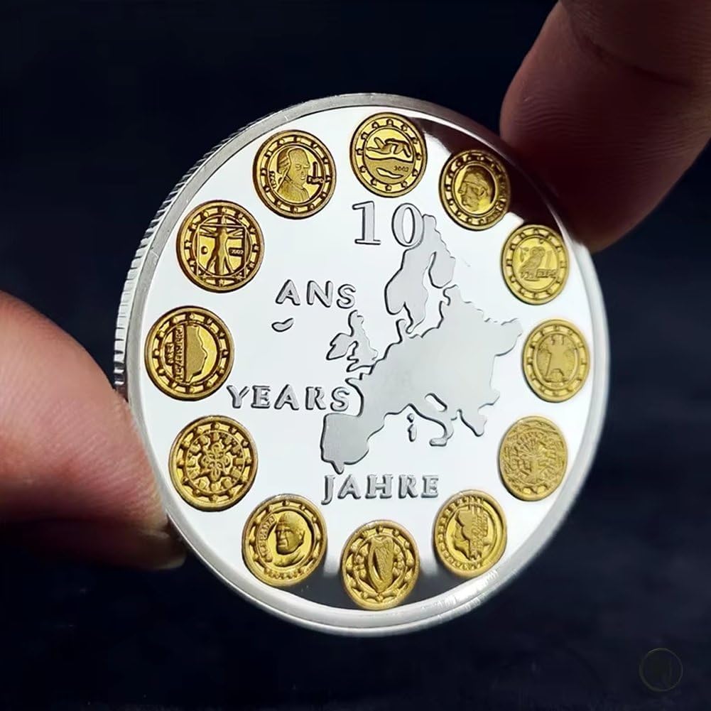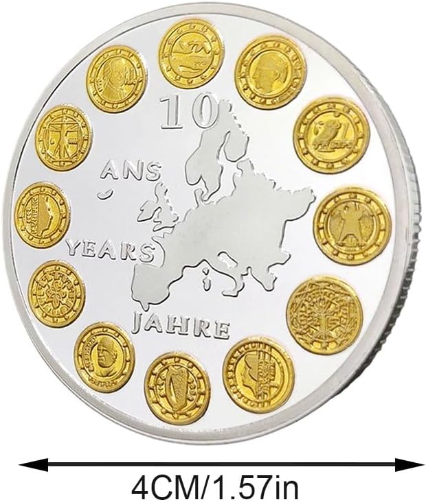 Moneta commemorativa in euro, moneta collezione ', moneta in euro per 10 anni, souvenir 'Unione Europea, moneta in euro di 12 paesi, moneta regalo per anniversario, moneta con mappa 'Europa, moneta bicolore, moneta collezione per collezionisti, moneta in euro in edizione limitata Regalo ideale per collezionisti: un regalo significativo per collezionisti di monete, appassionati di euro e chiunque apprezzi storia e cultura europea. Design esclusivo delle 12 nazioni: presenta gli emblemi dei dodici paesi fondatori 'Eurozona disposti attorno alla mappa 'Europa, a simboleggiare unità e cooperazione. Commemorazione dei 10 anni 'euro: celebra pietra miliare della moneta unica 'euro con questa moneta che celebra il 10° anniversario della moneta unica 'Unione europea. Lavorazione bicolore: splendidamente placcato in **oro e argento**, che gli conferisce un aspetto elegante e accattivante, perfetto per l'esposizione o collezione.