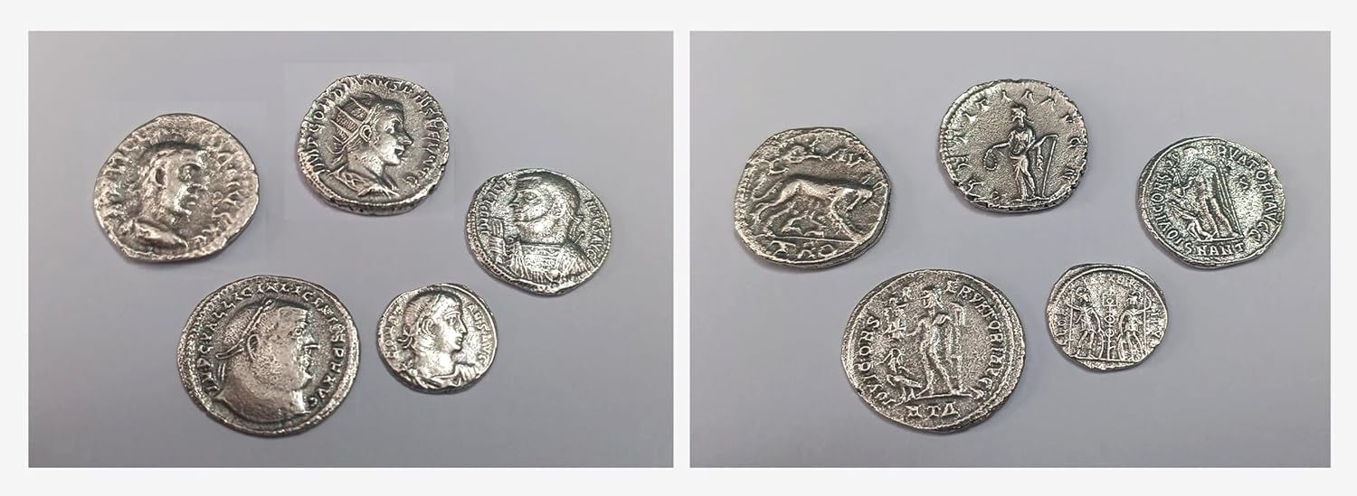 🪙 Replica fedele - Set di 5 monete imperiali romane del III e IV secolo d.C. 📜 Riproduzioni dettagliate delle 5 monete incluse nel set: 1. Licinio I (308-324 d.C.), AE Follis, Antiochia 2. Licinio I (308-324 d.C.), AE Follis, Eraclea 3. Gordiano III (238-244 d.C.), Antoniniano, Roma 4. Costante (337-350 d.C.), AE Follis, Antiochia 5. Valeriano I (253-260 d.C.), AE, Troas, Alessandria Troas 🥈 Metallo placcato argento antico - Ogni moneta è realizzata con cura per un aspetto storico autentico 📦 Set da collezione - Ideale per gli appassionati di storia, collezionisti di monete o come regalo originale 🏛️ Autentico stile romano - I dettagli riflettono fedelmente le antiche incisioni 🎁 Elegante e significativo - Un oggetto decorativo e culturale per ogni collezione ✨ Un viaggio nella storia romana - Con il fascino senza tempo degli antichi imperatori