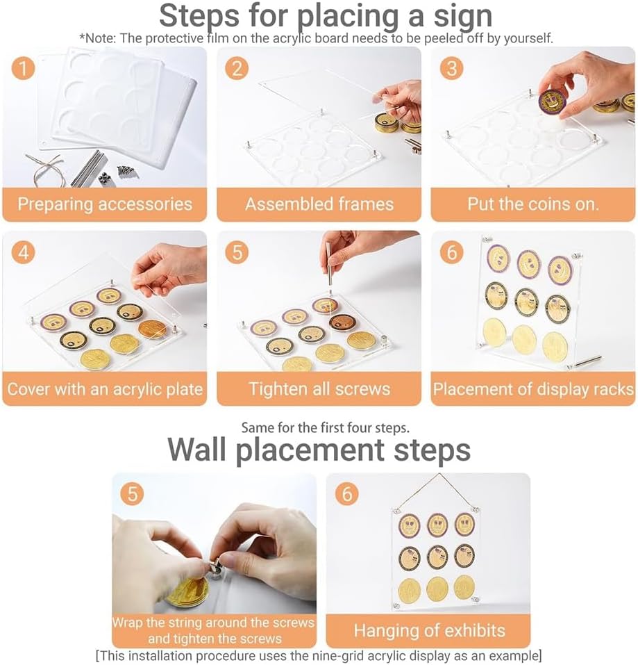 Il display è realizzato in materiale acrilico trasparente di eccellente qualità ed è garantito per essere trasparente e durevole, il tuo display brillerà con qualsiasi luce. Questo espositore trasparente, sigillato e antipolvere non solo fornisce una piattaforma espositiva ideale, ma garantisce anche che la tua collezione sia protetta dall'umidità. Questo versatile espositore per monete da sfida militare è progettato in modo intelligente come espositore da parete salvaspazio e accattivante o può essere facilmente posizionato su un tavolo per una visione ravvicinata. In questo modo, la tua collezione di monete diventerà in molti modi il pezzo forte del tuo arredamento. Mostra il tuo esercito e rendi l'individuo un simbolo d'onore. Le monete possono essere visualizzate chiaramente, rimosse individualmente e conservate per una comoda visualizzazione, raccolta o condivisione con gli amici.
