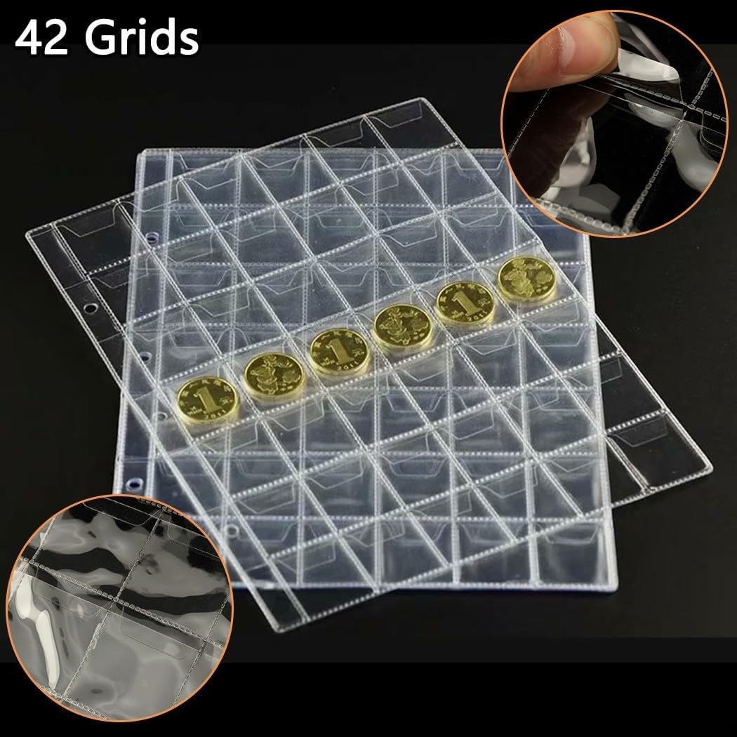 Collezione di monete: 10 monete in plastica trasparente per portafogli con 42 tasche ciascuna per organizzare e proteggere il tuo mentre viaggi o a casa Spazio sufficiente: ogni pagina misura 250 x 200 mm con tasche da 28 x 28 mm che offrono ampio spazio per monete di varie dimensioni nella tua collezione per pagine trasparenti Materiale di lunga durata: realizzati in PVC, questi porta monete resistono all'erosione e mantengono la tua collezione come nuova Per una facile organizzazione: il design a 3 fori consente di inserire le pagine in raccoglitori generali rendendo rapido l'ordinamento e l'accesso nella tua collezione di archiviazione Per display cristallino: le pagine trasparenti offrono visibilità immediata su entrambi i lati per una facile identificazione ed evitare danni