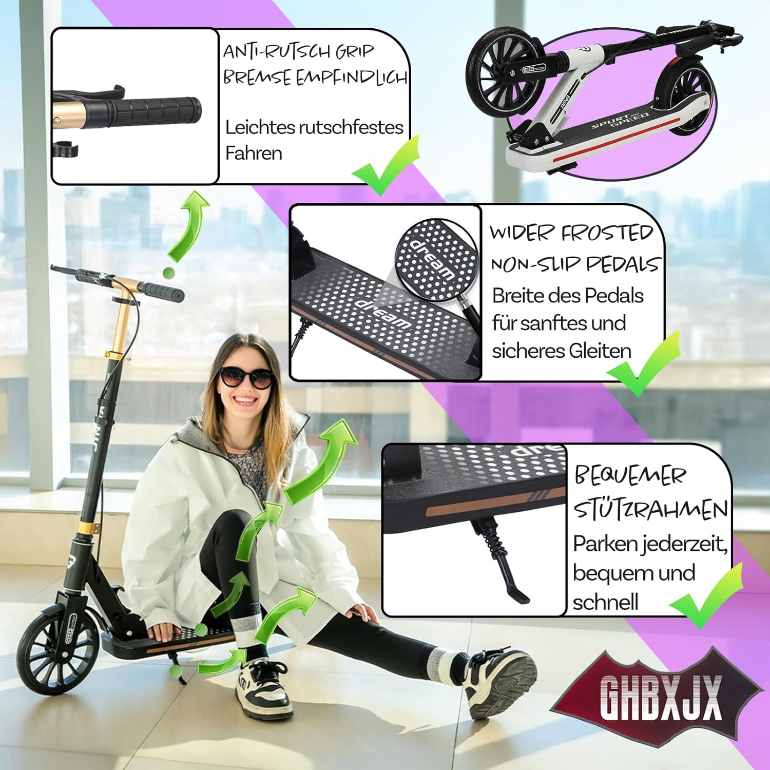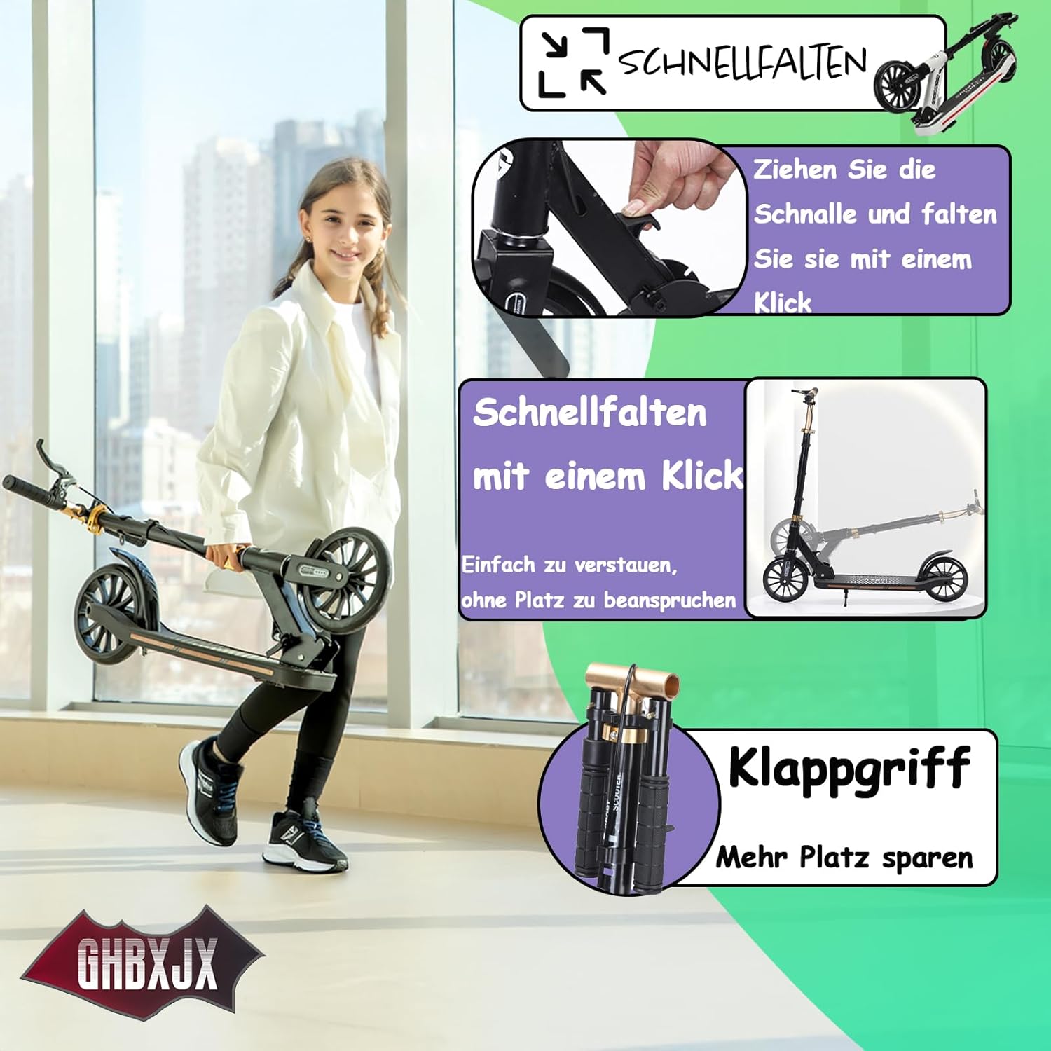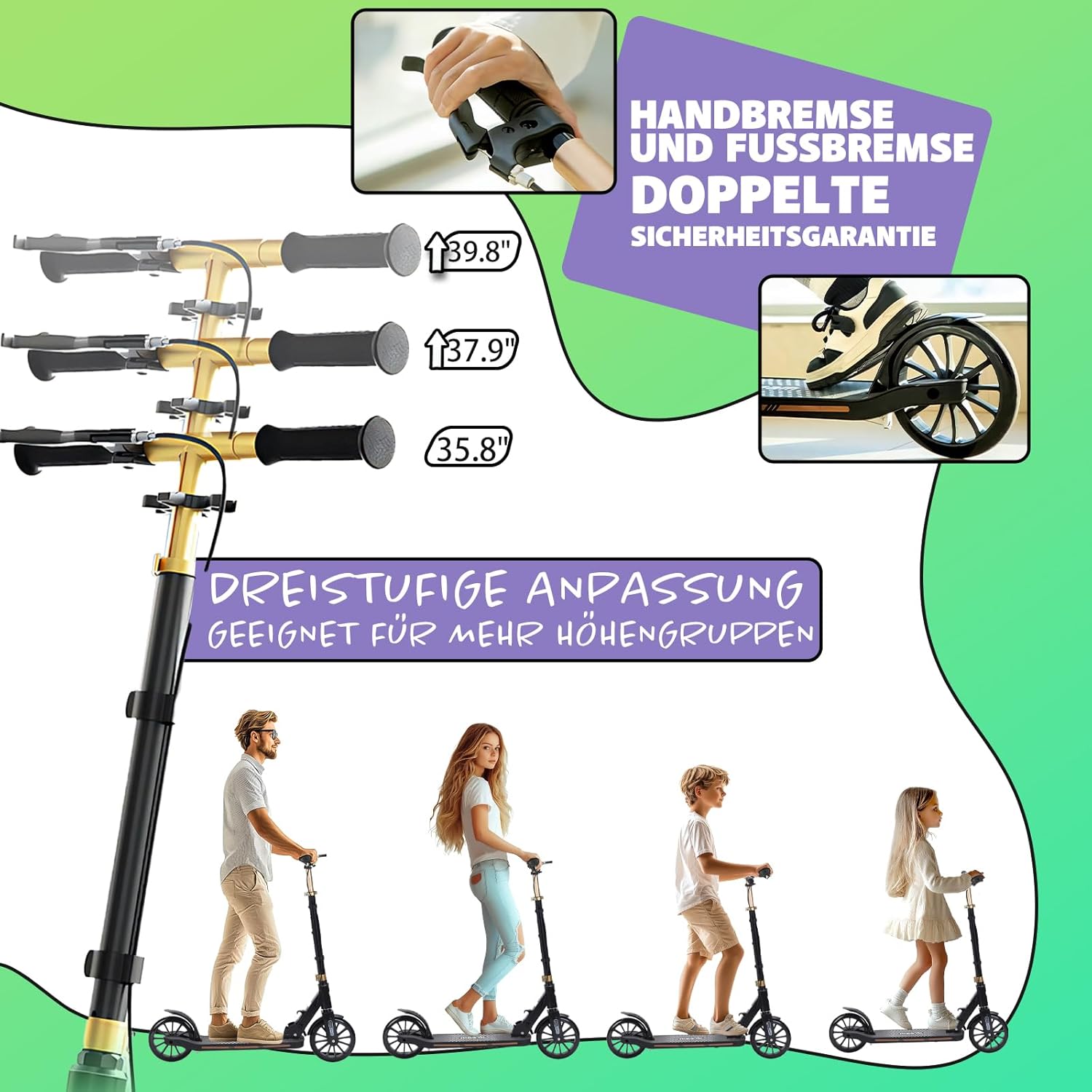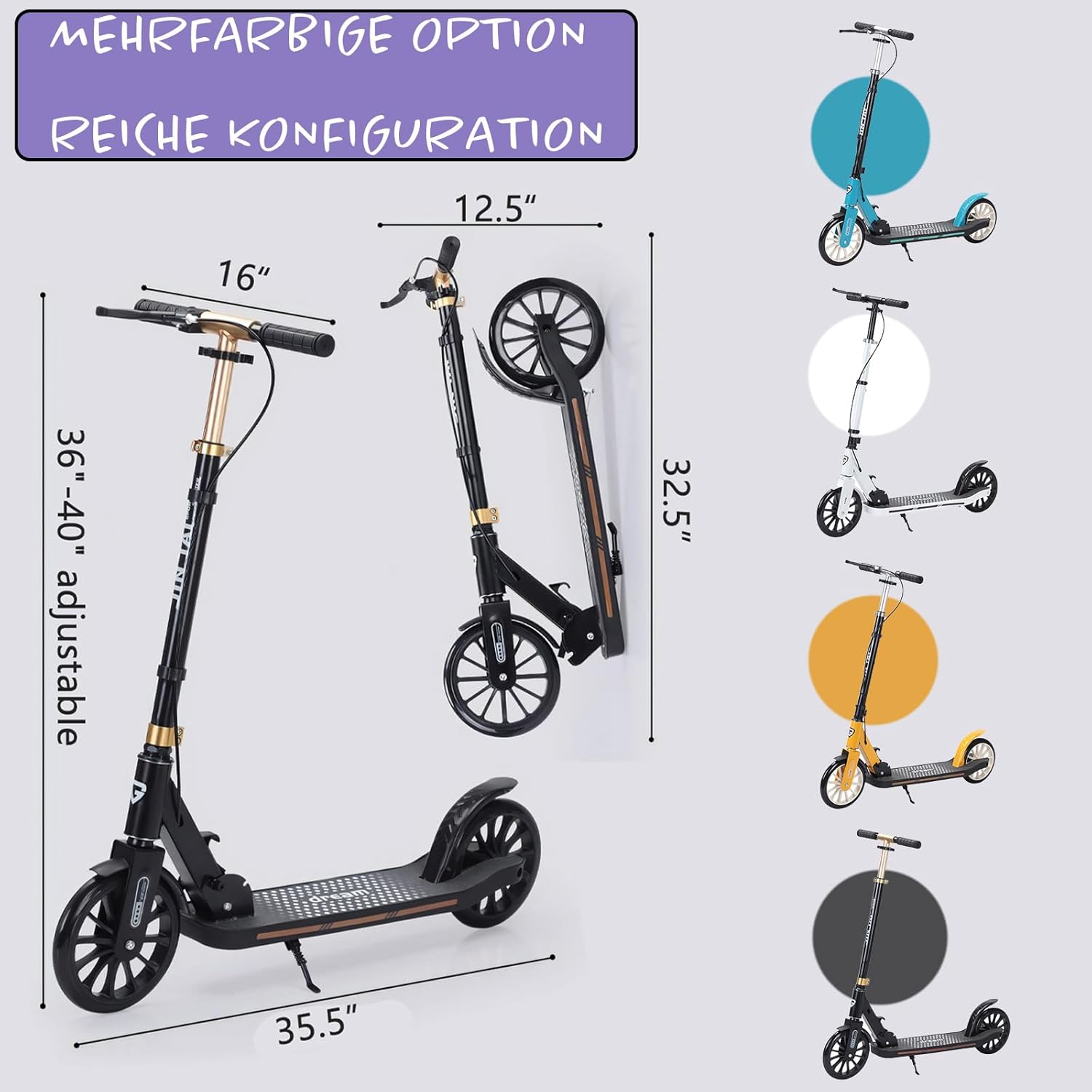 1.[GUIDA FACILE E VELOCE]: questo scooter ha una guida più fluida rispetto ad altri scooter grazie ai suoi grandi pneumatici da 20 cm e al doppio sistema di sospensione ammortizzante, adatto a tutti i tipi di strade sconnesse, consentendo al ciclista di ridurre le vibrazioni e le oscillazioni. 2. [IL TUO SCOOTER PREFERITO]:Questo scooter si caratterizza anche per la sua leggerezza, facilità di guida e regolazione in altezza a tre vie! Offre la stessa sicurezza ad alta visibilità e divertimento infinito per i bambini più grandi e gli adolescenti! Incoraggia i bambini a uscire e fare esercizio divertendosi. 3. [LEGGERO E PORTATILE]: questo scooter è compatto e portatile con un sistema di piegatura rapida. Puoi piegarlo in dimensioni compatte e anche il manubrio può essere piegato, il processo di piegatura rapida senza attrezzi è molto semplice per i bambini. È facile da trasportare da un luogo all'altro ed è un trasporto super portatile. 4. [CARATTERISTICHE LEGGERE E PORTATILI]: l'altezza del nostro manubrio regolabile varia da 36 pollici a 40 pollici con 3 livelli di regolazione, puoi regolare l'altezza in base alle tue esigenze. Con una capacità di carico di 150 kg, ha una buona capacità di carico ed è uno strumento di mobilità ideale per tutti. 5. [REGALO PROGETTATO]: il regalo perfetto per il tuo bambino o la persona amata. Che sia un regalo di compleanno, un regalo di laurea o un regalo di Natale, sarà un regalo da sogno per chiunque dai 7 anni in su. Dai loro una risposta soddisfacente.