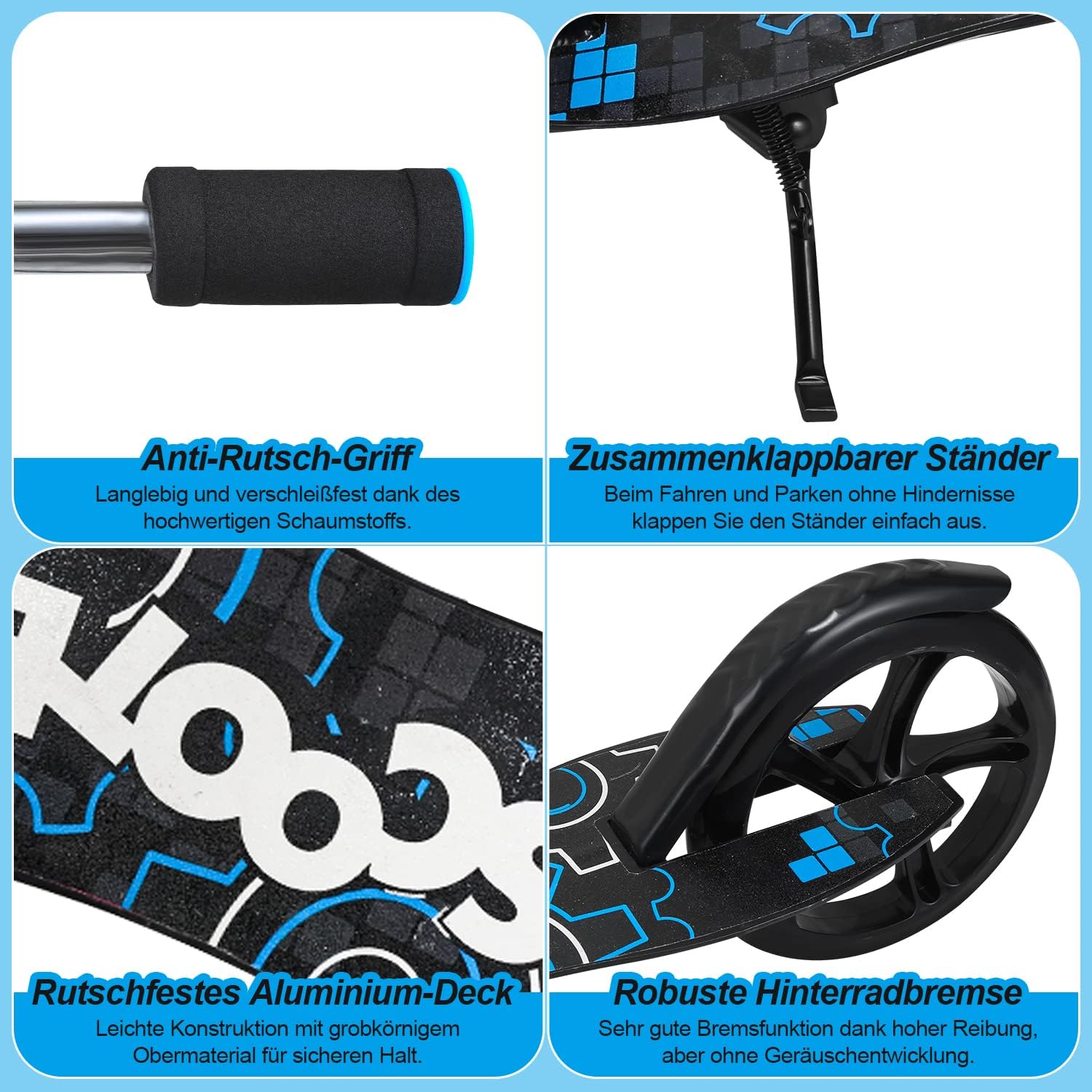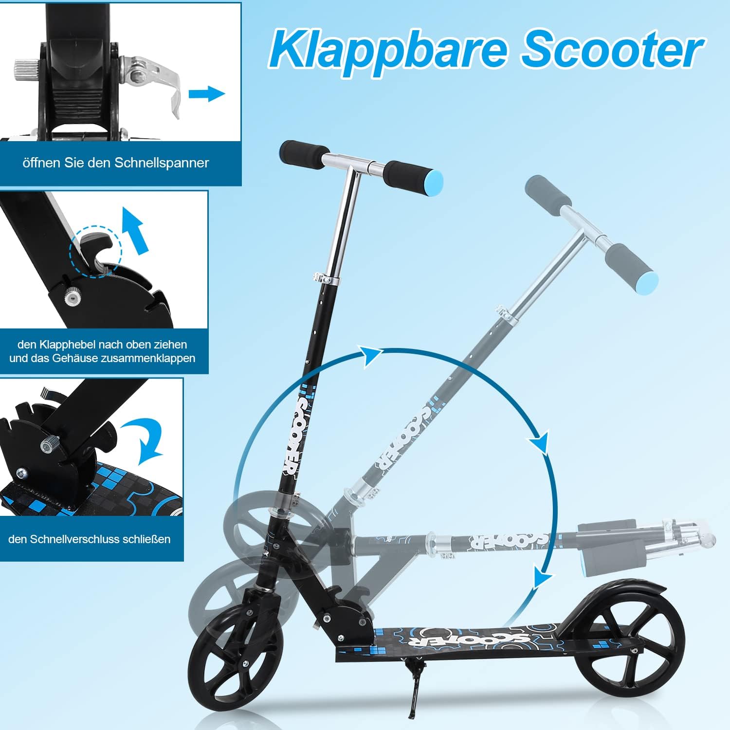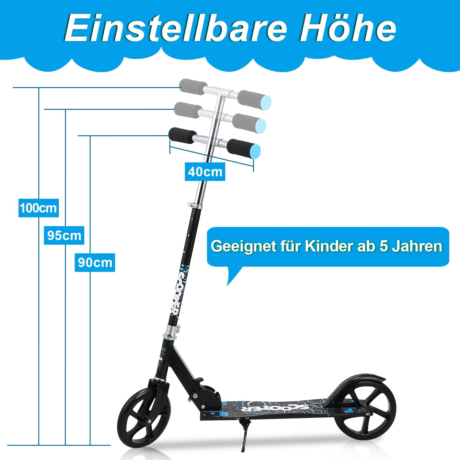 Guida sicura: le ruote in poliuretano di grandi dimensioni da 190 mm hanno un'elevata capacità di carico e si adattano per guidare senza problemi su strade dure e irregolari. Il freno a frizione posteriore avvolge completamente la ruota e fornisce un efficace effetto frenante. Può anche essere usato come parafango per evitare schizzi d'acqua. Altezza regolabile: manubrio regolabile in tre livelli (90-100 cm), che può regolare la posizione comoda in base alla forma e alle dimensioni del corpo del bambino. Il peso massimo dello scooter è di 100 kg, adatto per bambini/adulti oltre i 5 anni. Materiale premium: il monopattino per bambini ha un robusto telaio in alluminio di alta qualità, un manubrio ergonomico e una struttura. La morbida schiuma antiscivolo avvolge il manico e garantisce una buona presa. Facile da usare e da trasportare: basta appoggiare il meccanismo pieghevole per abbassarlo, premere il meccanismo pieghevole e far scorrere la barra a T in avanti per aprirla. Questo monopattino si adatta perfettamente all'auto e utilizza la cinghia in dotazione per un facile trasporto. ✅【Tavola extra larga e antiscivolo】 L'ampia tavola può offrire un buon equilibrio. Tavola satinata, sicurezza antiscivolo per evitare scivolamenti sulla tavola. Un ponte vicino al pavimento consente di spingere più facilmente lo scooter senza dover piegare le gambe nelle ginocchia.