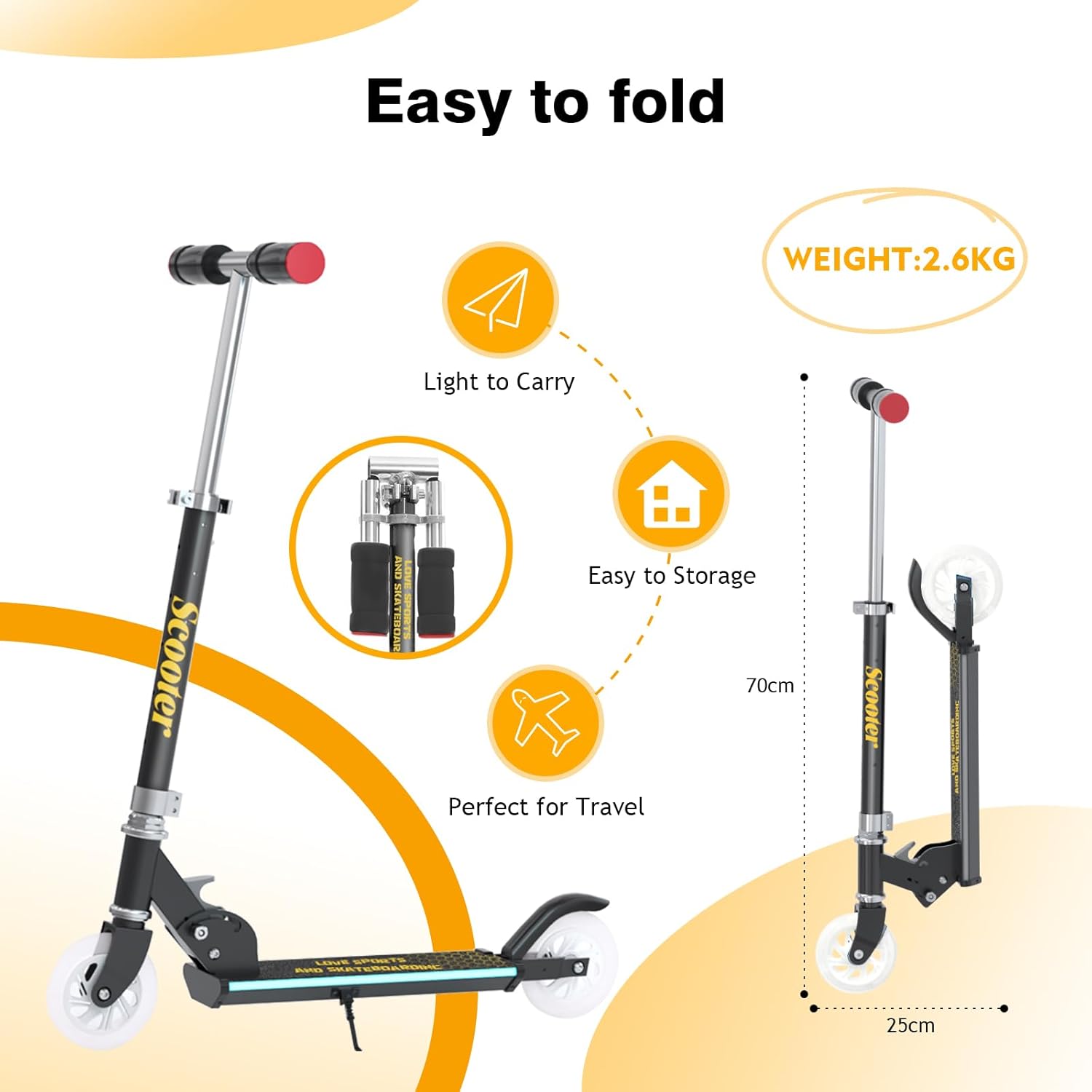 LUCI BRILLANTI: lo scooter per bambini YEE RUN è dotato di molteplici luci a LED, con ruote lampeggianti a LED, crea effetti di luce impressionanti e rende divertente la guida, che è un'esperienza affascinante per ogni bambino! (Nota: le batterie non sono incluse nella confezione!) CRESCI CON IL TUO BAMBINO: Progettato per scooter per bambini di 3-12 anni, tre manubri regolabili (68-74-80 cm) I bambini possono facilmente trovare la giusta altezza per la guida, possono soddisfare le esigenze di diverse età e tipi di corporatura, godersi il divertimento della guida. LEGGERO E PORTATILE: lo scooter per bambini è realizzato con un tubo a T in lega di alluminio leggero, lo scooter pesa solo 2,6 kg, il che lo rende facile da guidare. Pieghevole con un pulsante, facile da piegare senza attrezzi, facile da trasportare e riporre. Molto leggero e facile da trasportare, può essere portato ovunque. GUIDA VELOCE: il monopattino è realizzato con ruote in PU e un robusto corpo in alluminio, che può essere utilizzato su varie superfici stradali per una guida più sicura/fluida, e le morbide maniglie antiscivolo non ti stancheranno anche se guidi a lungo. TEAM DI ASSISTENZA CLIENTI PROFESSIONALE: Il team di assistenza clienti professionale gestirà tutte le domande e i dubbi e fornirà una garanzia del produttore di 1 anno per garantire che lo scooter per bambini acquistato sia durevole e funzioni sempre al meglio. Il nostro obiettivo è fornire a tuo figlio un compagno di viaggio duraturo, sicuro e affidabile