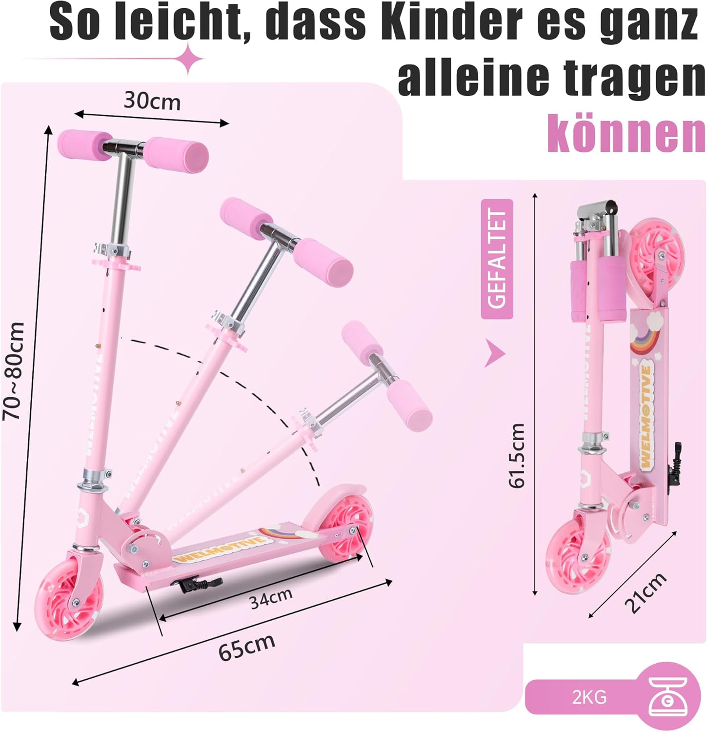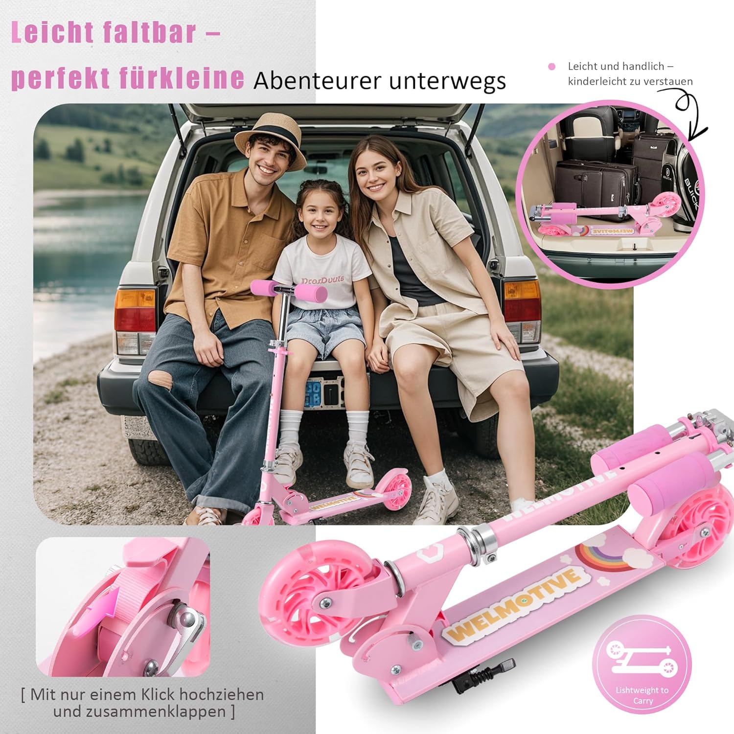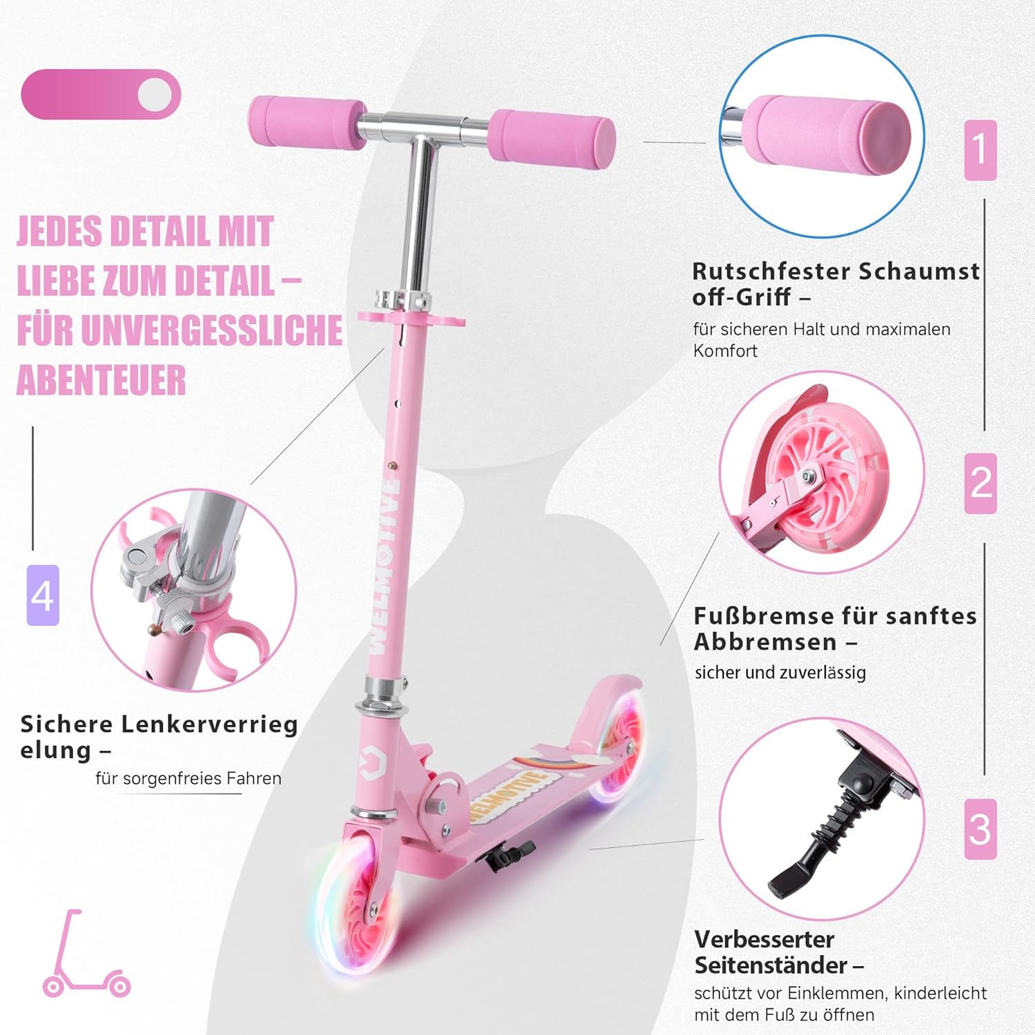 🛡️ La sicurezza che convince Il nostro monopattino per bambini è realizzato in alluminio stabile e di alta qualità: robusto, durevole e accuratamente assemblato a mano. Le impugnature in morbida schiuma sono comode da impugnare e smorzano le vibrazioni. La superficie del battistrada antiscivolo garantisce una presa sicura, anche durante la guida veloce. Con il freno a pedale scorrevole lo scooter può essere frenato in modo controllato e affidabile: basta salire e fermarsi in sicurezza. 🌈 Divertimento di guida con effetto luminoso Un highlight per i bambini: entrambe le bici sono dotate di luci LED luminose - senza batterie! Iniziano a lampeggiare durante la guida e non solo rendono lo scooter un vero e proprio eye-catcher, ma garantiscono anche una migliore visibilità al crepuscolo e al buio. Che sia bello o carino, il look entusiasma sia i bambini che i genitori. Lo scooter viene fornito in una confezione robusta e dal design accattivante ed è quindi ideale come regalo. 🎒 Leggero, pieghevole, pratico Lo scooter si ripiega con una sola mano: perfetto per il bagagliaio, le scale o per mettere in ordine la casa. Con un peso di poco più di 2 kg, è così leggero che anche i bambini possono trasportarlo facilmente da soli. L'altezza del manubrio è regolabile individualmente: ideale per bambini in crescita o fratelli che condividono lo scooter. 🤸♀️ Promuovere le capacità motorie in modo giocoso. Gli scooter a due ruote promuovono specificamente l'equilibrio e la coordinazione: rispetto ai modelli a tre ruote sono più mobili e agili. Che si tratti di spingere, mantenere l'equilibrio o frenare, tutto ciò rafforza la consapevolezza del corpo, la capacità di reazione e il pensiero spaziale. Un fantastico attrezzo da gioco che è divertente e incoraggiante allo stesso tempo. ℹ️ Nota per i genitori Lo scooter è progettato per i bambini e può sostenere fino a 50 kg. Non adatto per adulti o come scooter elettrico. Si prega di controllare che tutte le parti siano ben fissate e funzionanti prima del primo utilizzo. Se hai domande o problemi, saremo felici di aiutarti: contattaci semplicemente utilizzando il pulsante "Contatta il venditore" sulla pagina del prodotto. Tieni a portata di mano il numero dell'ordine in modo che possiamo aiutarti rapidamente.