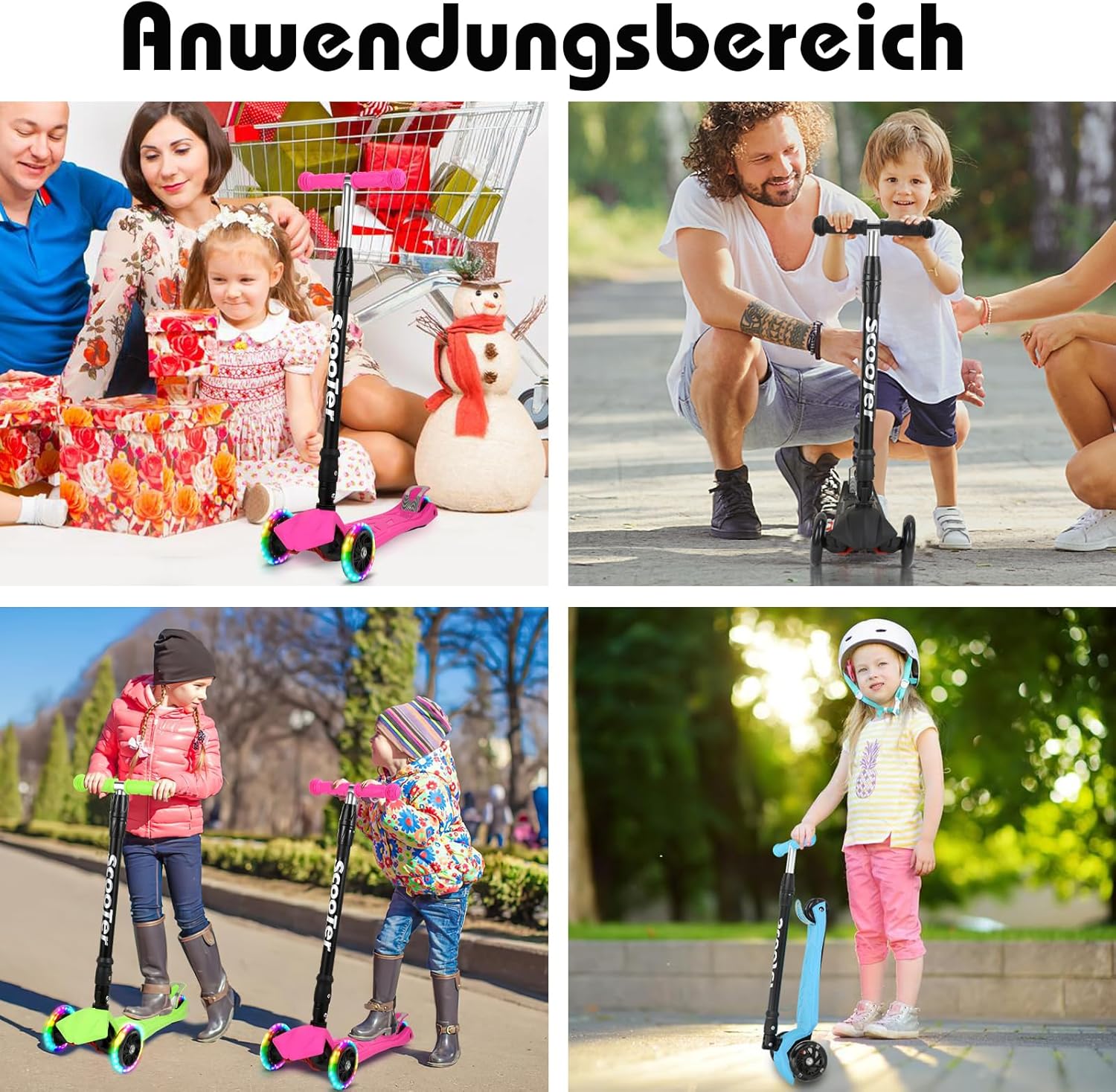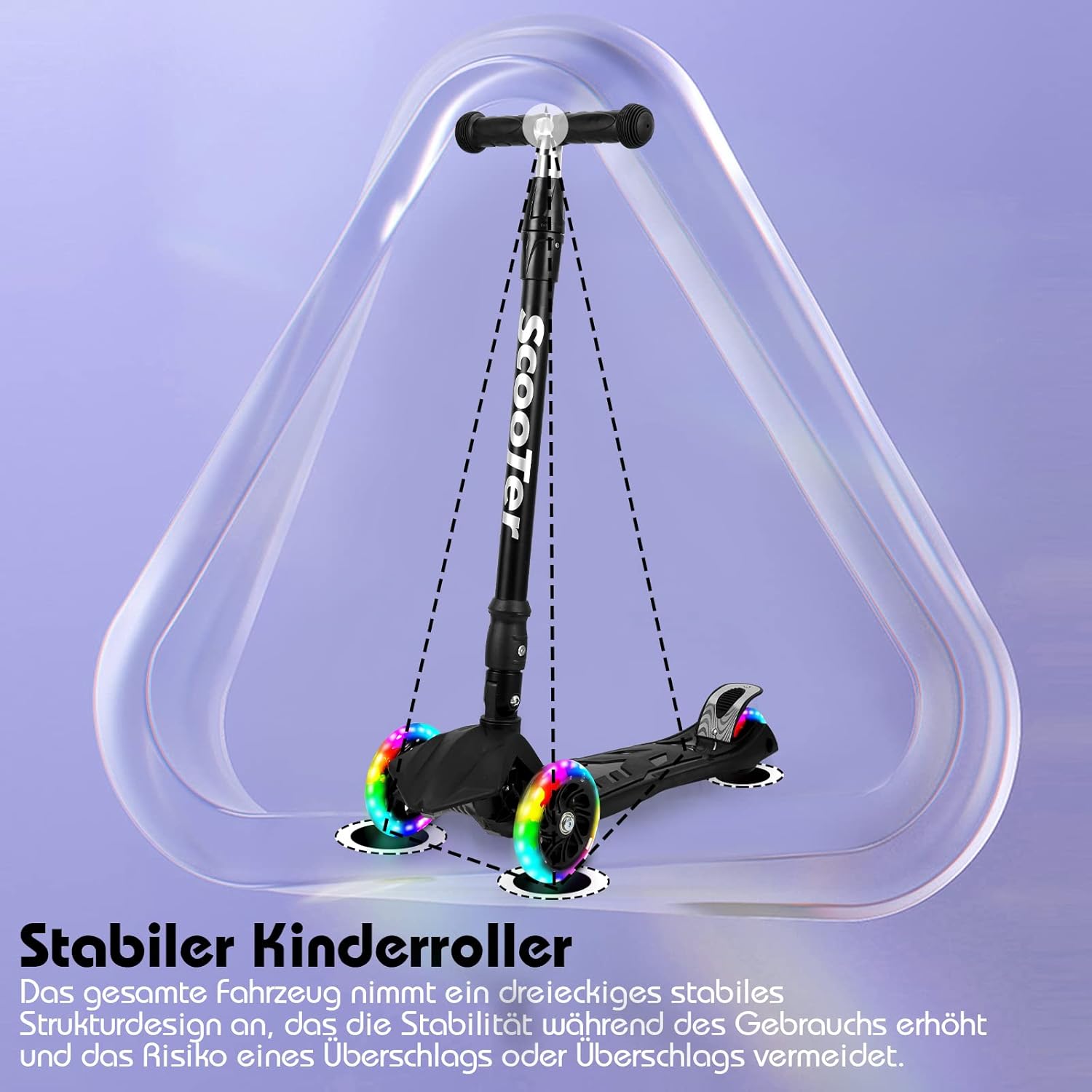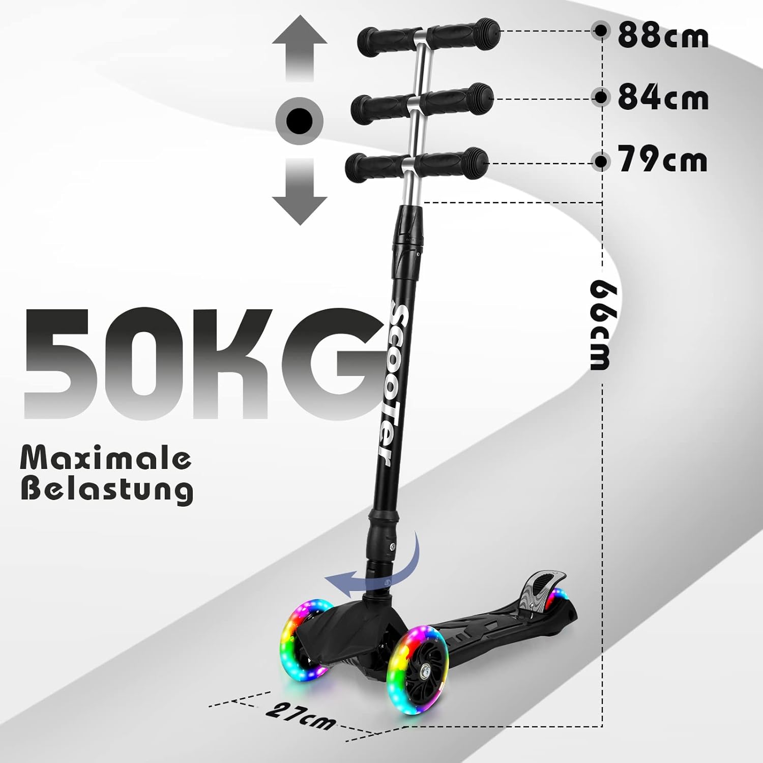 Ruote illuminate a LED: le ruote per bambini sono dotate di 3 luci LED colorate integrate. Si accendono quando lo scooter rotola i bambini e sono ben visibili sia di giorno che di notte. Altezza regolabile: lo scooter ha 4 altezze regolabili, mentre il manubrio può essere regolato a 66/79/84/88 cm. Perfetto per bambini dai 3 ai 12 anni (con un'altezza da 80 cm a 140 cm). Carico massimo: 50kg Sicuro e stabile: il manubrio è realizzato in nylon antiscivolo e lo skateboard dispone di una piattaforma robusta e ampia con un design a triangolo stabile. Lo sterzo di gravità consente un facile controllo inclinando il manubrio. Le ruote posteriori hanno freni per un arresto sicuro. Ruote premium: le ruote sono realizzate in materiale PU resistente e ammortizzante. Ruote anteriori con un diametro di 120 mm e ruote posteriori con diametro di 80 mm. Le ruote posteriori sono progettate come un design due in uno per migliorare la stabilità e l'assorbimento degli urti durante la guida. Con cuscinetti a sfera ABEC 7 per una guida fluida. Pieghevole e portatile: il monopattino per bambini si ripiega facilmente. Basta afferrare la parte inferiore del manubrio, tirare verso l'alto, e lo scooter si ripiega in 3 secondi. Ideale per riporre e trasportare facilmente in viaggio.