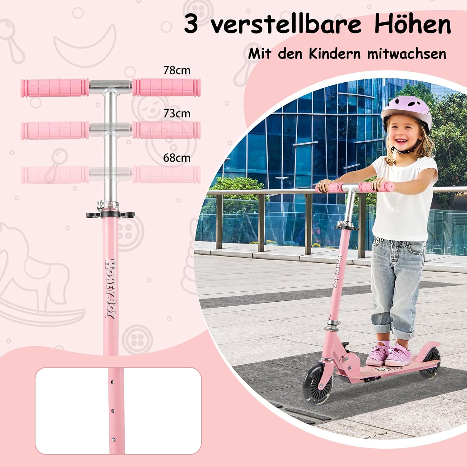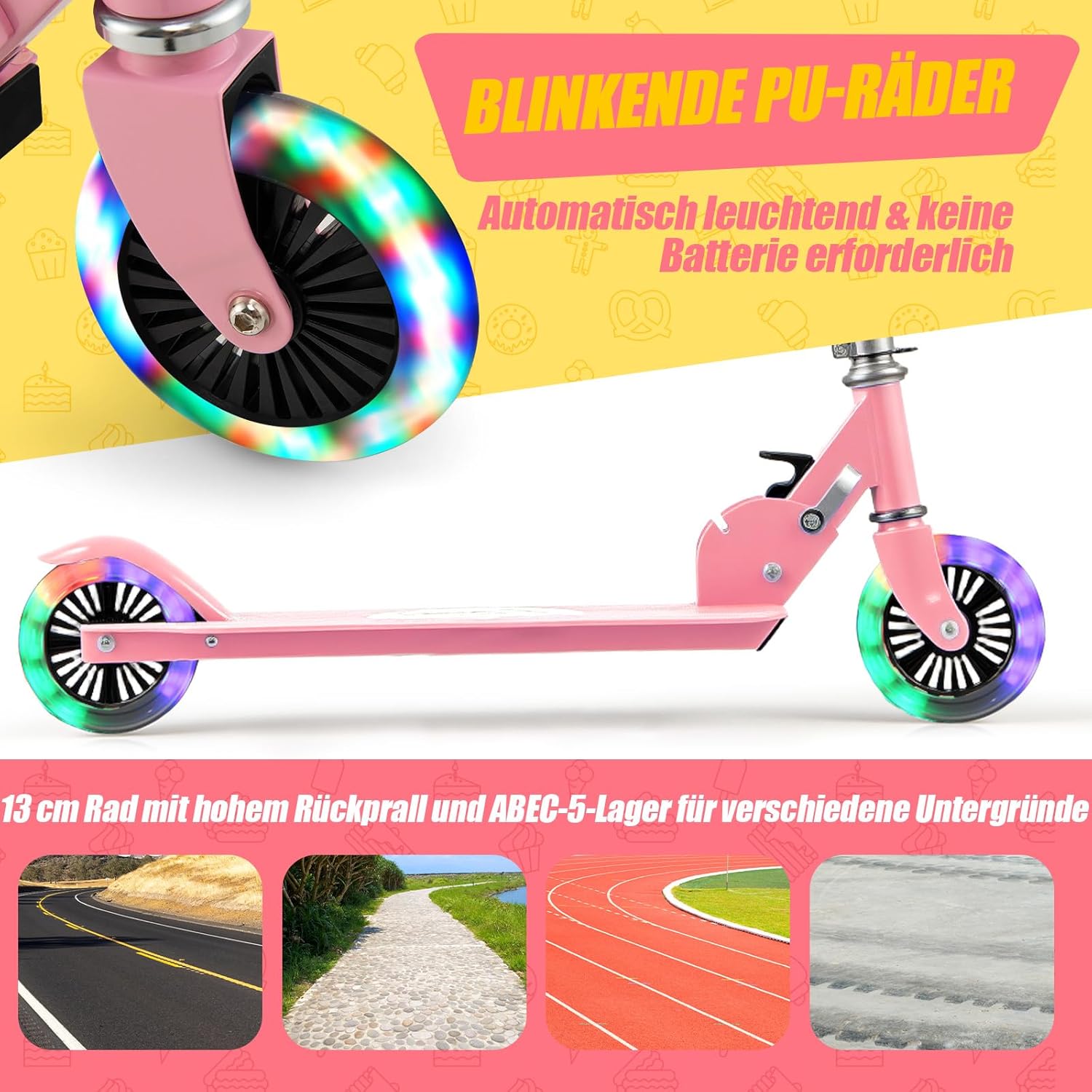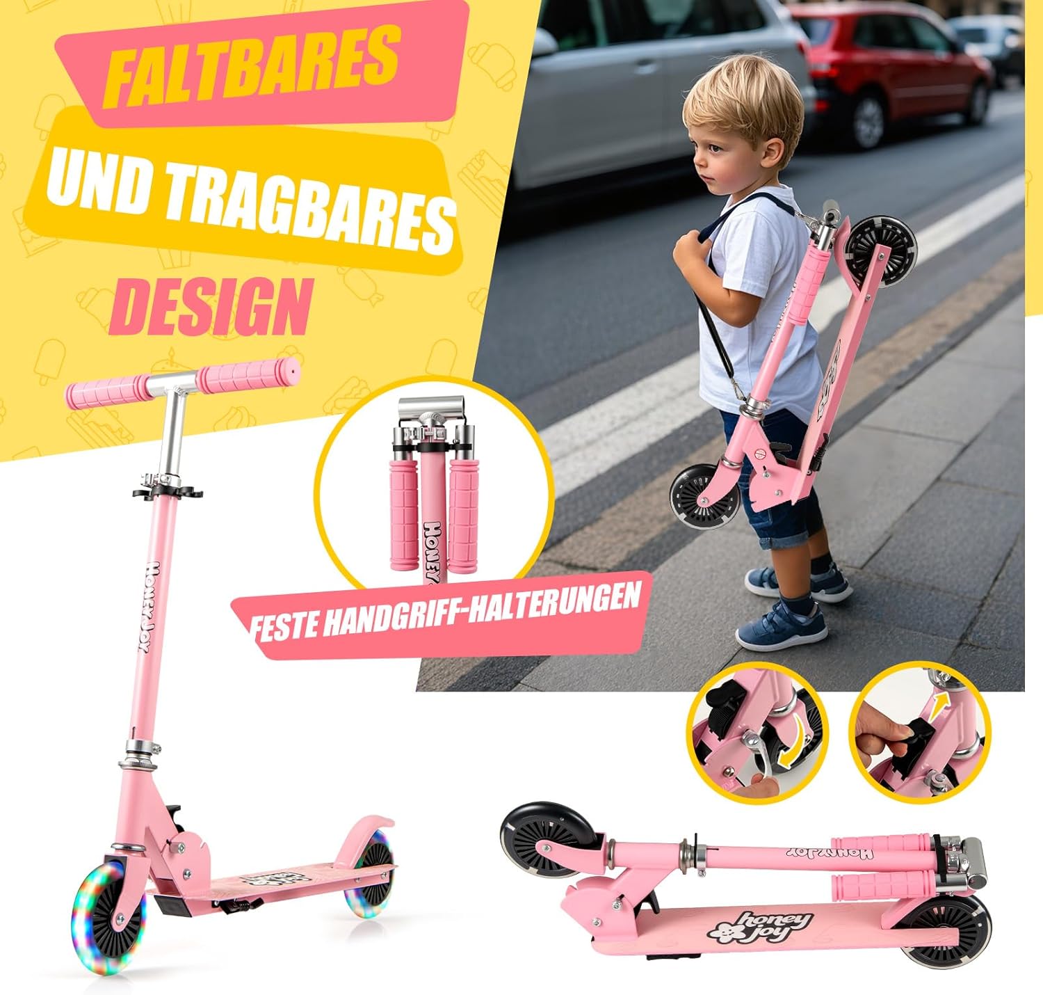 # 3 altezze regolabili # L'altezza del manubrio dello scooter per bambini può essere regolata in 3 posizioni - adattabile in modo ottimale alle dimensioni del bambino. Le maniglie in TPR antiscivolo garantiscono una comoda maneggevolezza e aumentano il comfort di trasporto. # Sicurezza # Lo scooter per bambini con ruote luminose è dotato di un robusto telaio in alluminio che garantisce un supporto stabile fino a 50 kg. La pedana più ampia da 11 cm e il freno posteriore garantiscono una guida sicura e stabile, nonché una frenata rapida e affidabile per i bambini. # Sicurezza in ogni momento # Il monopattino per bambini con ruote leggere ha un robusto telaio in alluminio che può sostenere fino a 50 kg. L'area dei pedali larga 11 cm, il freno della ruota posteriore e gli adesivi antiscivolo prevengono in modo affidabile le cadute. # Pieghevole e facile da trasportare # Lo scooter per bambini si piega facilmente (33 x 22 x 70 cm), entra nella stanza o nel bagagliaio dell'auto. Il design leggero con tracolla rende il trasporto senza sforzo. # Regalo ideale per i bambini # Durante la guida, i bambini possono esplorare l'ambiente circostante e allenare le proprie capacità motorie e l'equilibrio. Pertanto questo monopattino per bambini con ruote luminose è un giocattolo sportivo ideale per bambini dai 3 anni in su.