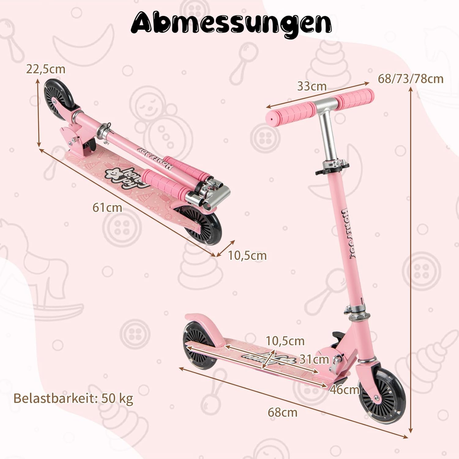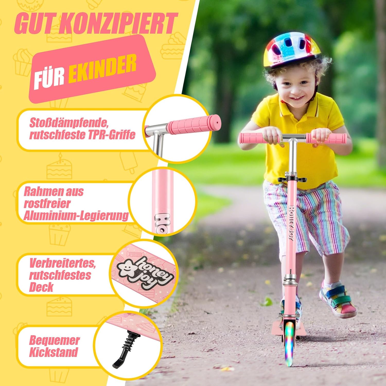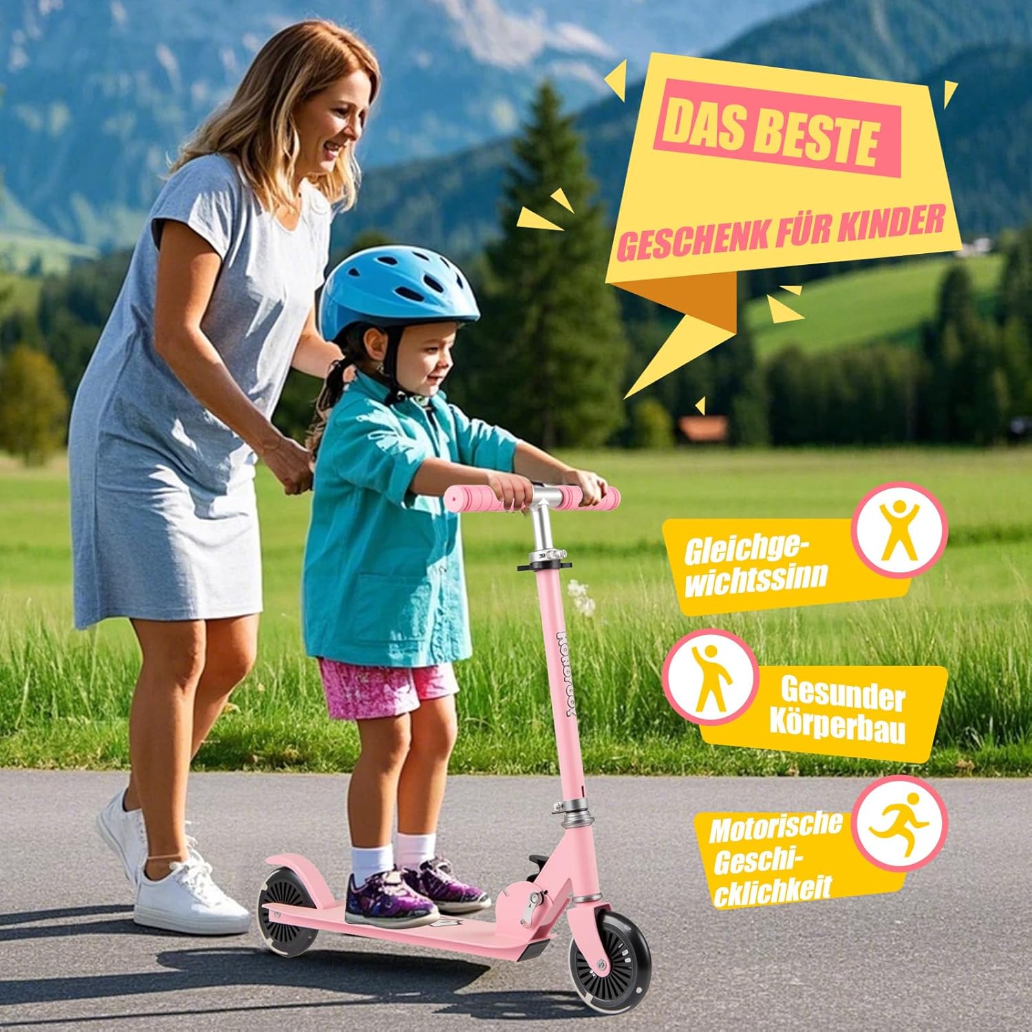 # 3 altezze regolabili # L'altezza del manubrio dello scooter per bambini può essere regolata in 3 posizioni - adattabile in modo ottimale alle dimensioni del bambino. Le maniglie in TPR antiscivolo garantiscono una comoda maneggevolezza e aumentano il comfort di trasporto. # Sicurezza # Lo scooter per bambini con ruote luminose è dotato di un robusto telaio in alluminio che garantisce un supporto stabile fino a 50 kg. La pedana più ampia da 11 cm e il freno posteriore garantiscono una guida sicura e stabile, nonché una frenata rapida e affidabile per i bambini. # Sicurezza in ogni momento # Il monopattino per bambini con ruote leggere ha un robusto telaio in alluminio che può sostenere fino a 50 kg. L'area dei pedali larga 11 cm, il freno della ruota posteriore e gli adesivi antiscivolo prevengono in modo affidabile le cadute. # Pieghevole e facile da trasportare # Lo scooter per bambini si piega facilmente (33 x 22 x 70 cm), entra nella stanza o nel bagagliaio dell'auto. Il design leggero con tracolla rende il trasporto senza sforzo. # Regalo ideale per i bambini # Durante la guida, i bambini possono esplorare l'ambiente circostante e allenare le proprie capacità motorie e l'equilibrio. Pertanto questo monopattino per bambini con ruote luminose è un giocattolo sportivo ideale per bambini dai 3 anni in su.