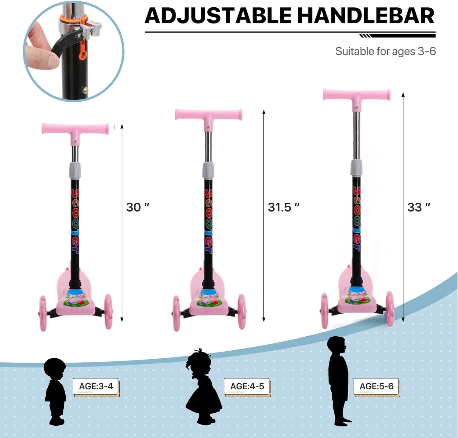 Monopattino pieghevole a 3 ruote per bambini: progettato per bambini dai 2 agli 8 anni, questo monopattino è dotato di un robusto telaio pieghevole che lo rende facile da trasportare e riporre durante i viaggi, il campeggio o le avventure quotidiane di pendolarismo Ruote per sicurezza e divertimento: dotato di luci brillanti sulle ruote che lampeggiano durante la guida migliorando la visibilità e aggiungendo un elemento divertente che incoraggia il gioco all'aperto e la guida sicura in condizioni di scarsa illuminazione Stabile e facile da guidare: l'equilibrio e la stabilità del design a tre ruote lo rendono la scelta ideale per principianti e giovani ciclisti che acquisiscono sicurezza e migliorano la coordinazione all'aperto Design leggero e portatile: si piega in modo compatto per adattarsi facilmente agli zaini o ai bagagliai dell'auto, perfetto per le famiglie in movimento, al parco, a scuola o alle avventure all'aria aperta Costruzione durevole con impugnatura comoda: costruito con materiali di qualità e dotato di maniglie ergonomiche che forniscono una presa comoda garantendo sicurezza e un uso duraturo durante il gioco attivo