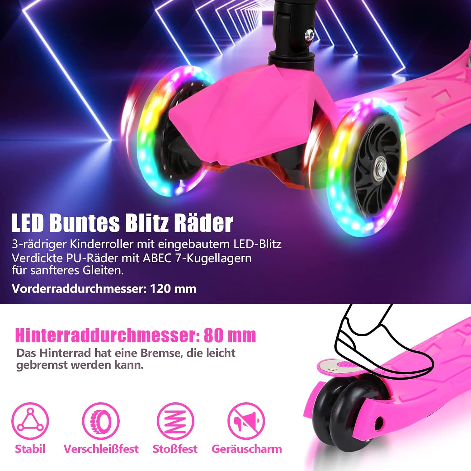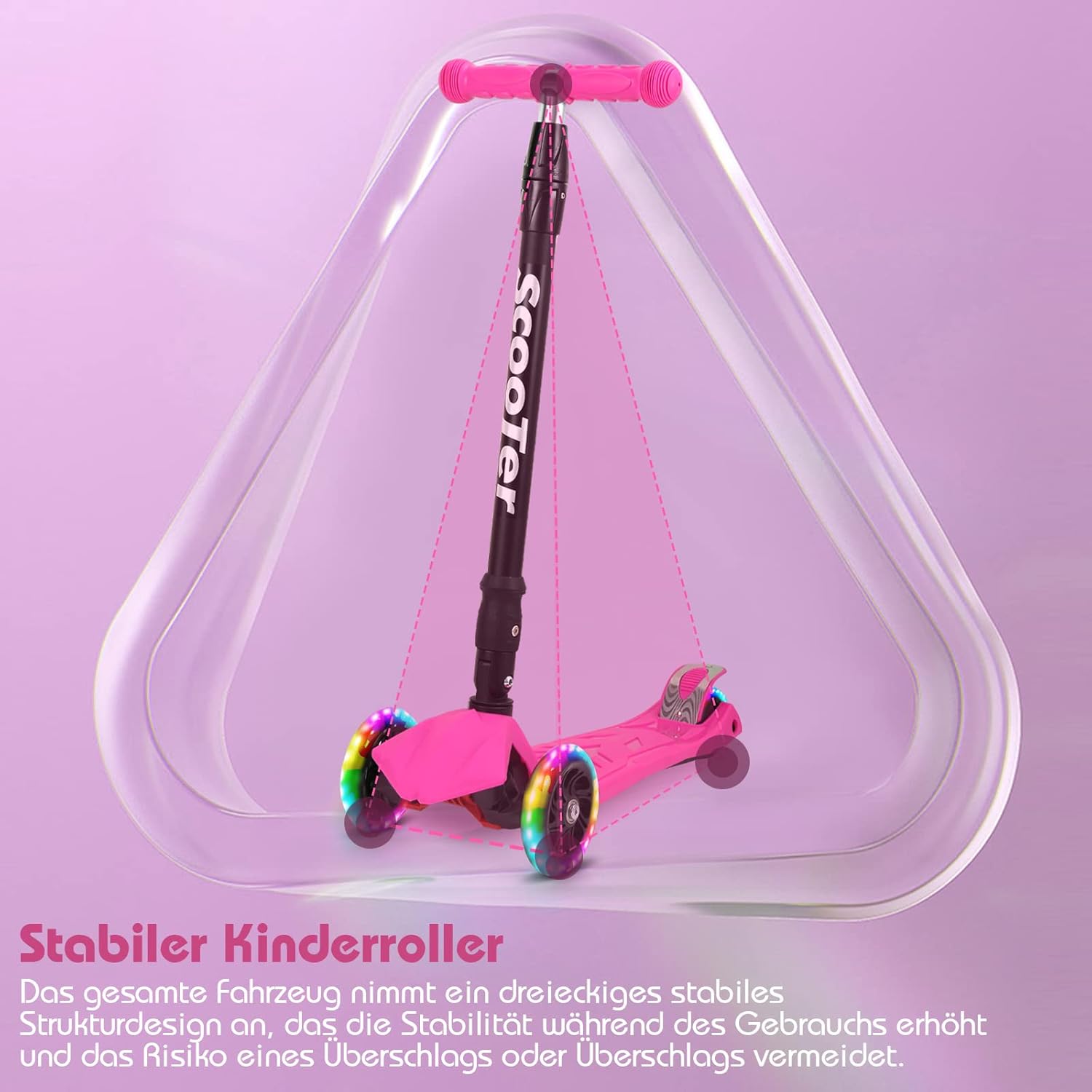 Splendido regalo per bambini: questo monopattino pieghevole è il regalo perfetto per compleanni o altre occasioni ed è adatto per bambini dai 3 ai 14 anni. Ruote flash a LED: ruote in poliuretano di alta qualità con cuscinetti ABEC 7 e illuminazione a LED rendono la guida più sicura ed emozionante. Il diametro della ruota anteriore è di 120 mm e il diametro della ruota posteriore è di 80 mm. Manubrio regolabile in altezza: il manubrio è regolabile in 4 altezze (66/79/84/88 cm) e si adatta quindi all'altezza del bambino. Il monopattino è facile da piegare e occupa poco spazio, il che lo rende ideale per i viaggi. Portata massima 50 kg. Stabilità e sicurezza: grazie alla struttura triangolare stabile e alla superficie del pedale antiscivolo in materiale PP di alta qualità, il monopattino offre stabilità e sicurezza al vostro bambino. La ruota posteriore è dotata di un freno per fermare il veicolo in modo rapido e semplice. Sterzo inclinabile a gravità: la leva del veicolo può controllare la direzione e le dimensioni della rotazione o la modifica del veicolo in base all'inclinazione del corpo del bambino. La sterzata di gravità aiuta il bambino a sviluppare equilibrio, coordinazione e capacità motorie.
