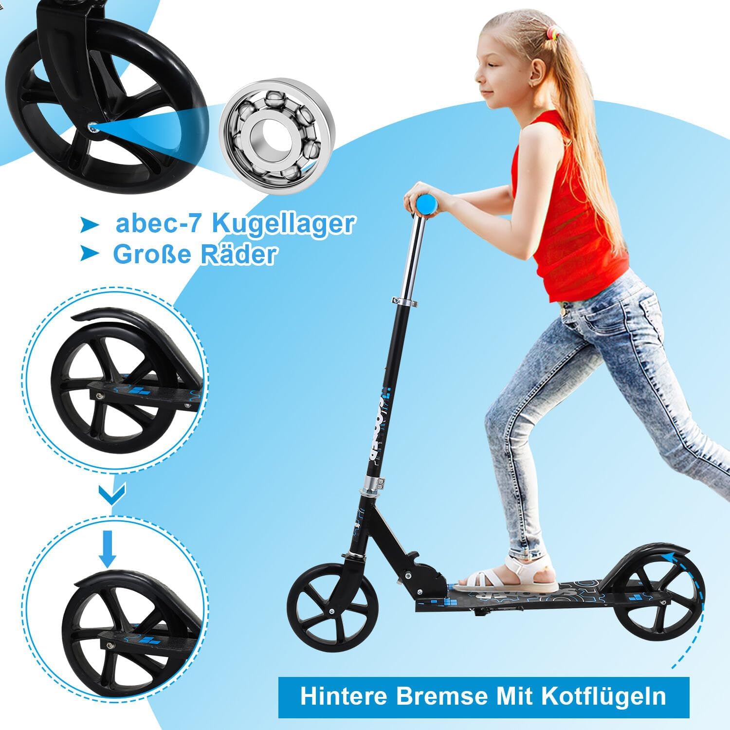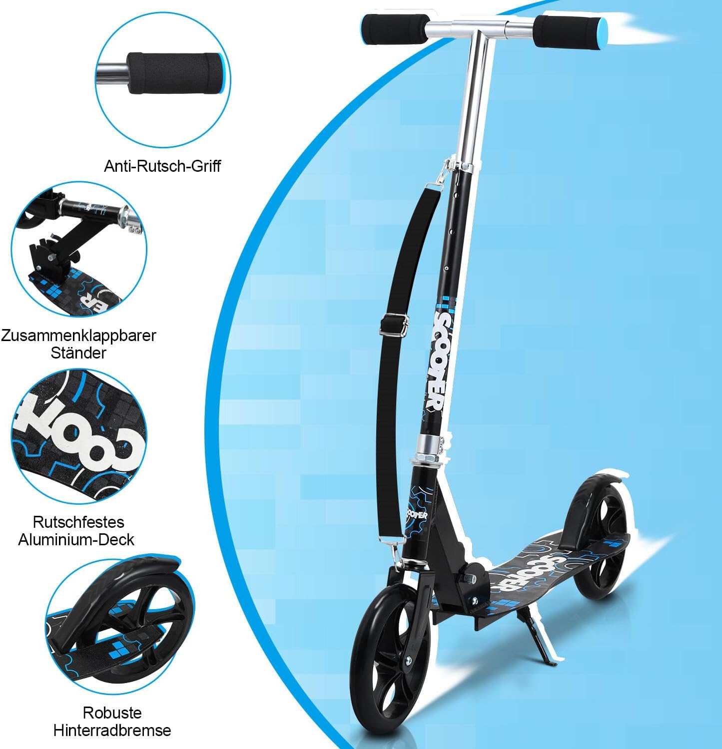 Regolabile in altezza: questo monopattino pieghevole ha tre posizioni di altezza regolabili (90/95/100 cm) e può essere regolato in una posizione comoda a seconda della corporatura e dell'altezza del bambino. Lo scooter ha una portata massima di 100 kg ed è adatto per bambini dai 5 anni in su e adulti. Materiali di alta qualità: il monopattino per bambini presenta un robusto telaio in alluminio di alta qualità, un manubrio ergonomico e una struttura ergonomica. Il manico è dotato di un'imbottitura in schiuma che garantisce flessibilità e resistenza allo scivolamento e garantisce una buona presa. Facile da usare e trasportare: il monopattino per bambini si ripiega premendo il meccanismo pieghevole e si apre premendo il meccanismo pieghevole e premendo in avanti la barra a T. Il monopattino si adatta perfettamente a un'auto ed è facile da trasportare con la cinghia in dotazione. Pedana antiscivolo extra larga: questo monopattino con ruote grandi presenta un'ampia superficie di appoggio che ti offre un buon equilibrio. La superficie opaca è antiscivolo e impedisce lo scivolamento sullo scooter. Grazie alle pedane vicino al suolo, è possibile spingere più facilmente lo scooter senza piegare le ginocchia. Guida sicura: i pneumatici in PU di grandi dimensioni hanno un'elevata capacità di carico, sono molto resistenti all'usura e ammortizzanti e sono adatti per una guida fluida su strade dure e irregolari. Il freno a frizione posteriore avvolge completamente il pneumatico e garantisce un efficace effetto frenante. Serve anche come paraspruzzi e previene gli spruzzi d'acqua.