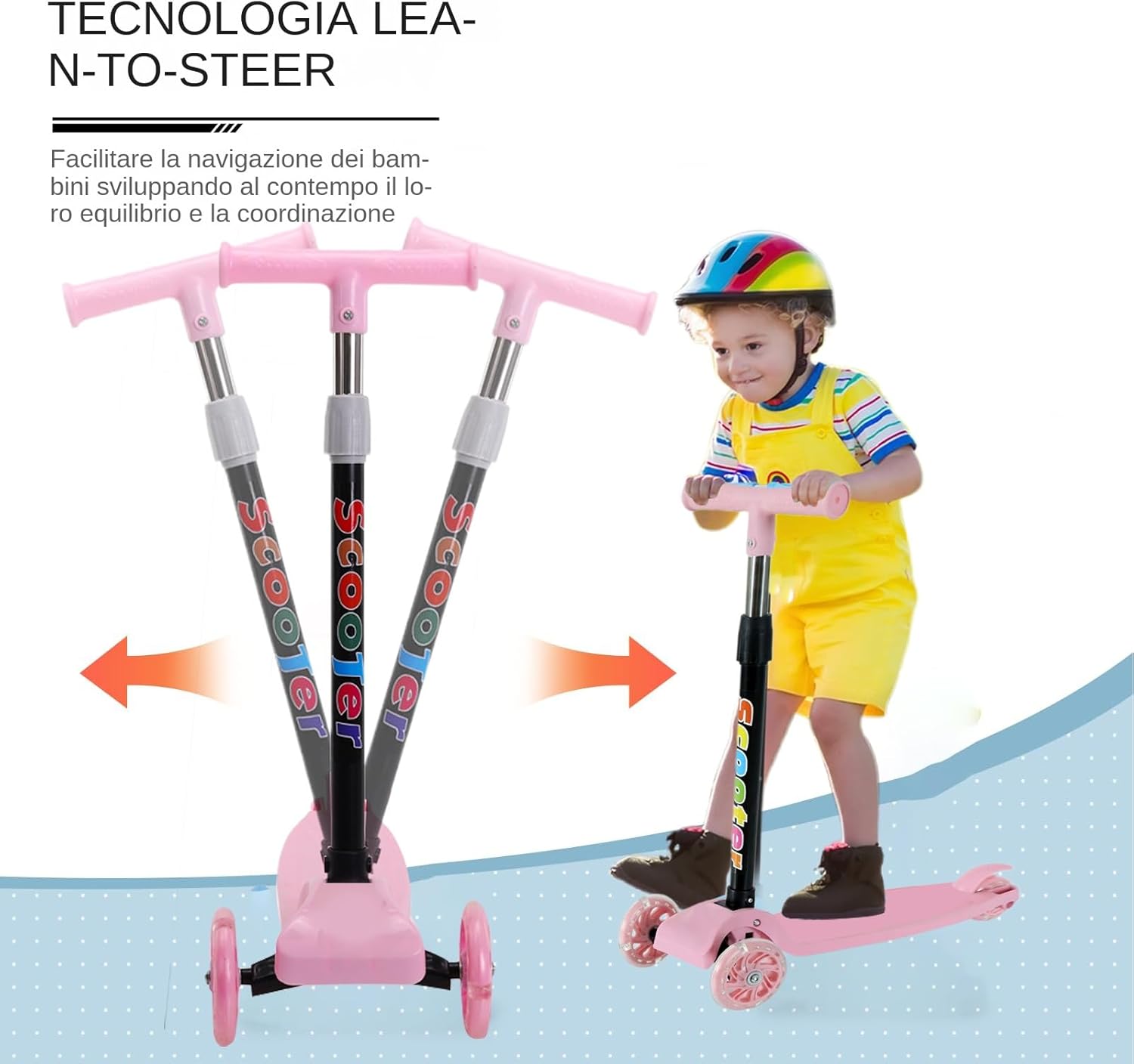 di equilibrio: Superficie antiscivolo ampia migliora la presa e riduce il ribaltamento, struttura triangolare assicura maneggevolezza stabile per appassionati principianti di monopattini pieghevoli Sviluppo Motorio: Monopattino pieghevole progettato per sostenere lo sviluppo motorio con manubrio regolabile in altezza e impugnatura ergonomica confortevole, ideale per bambini dai 2 agli 8 anni. Favorisce un allenamento sicuro e piacevole migliorando coordinazione ed equilibrio attraverso il gioco attivo. Archiviazione Senza Sforzo: Progettato con di piegatura intuitivo, mantiene dimensioni ridotte per trasporto pratico in auto/. La struttura compatta lo rende per viaggi frequenti e utilizzo versatile in città/ufficio, occupando minimo spazio quando riposto in armadi o sotto le scrivanie. Confortevole: Telaio bilanciato con baricentro basso, sellino imbottito curvato e ruota anteriore ammortizzata assicurano un'esperienza di guida sicura e piacevole in ogni situazione Sicurezza e divertimento: Le luci attivate dalla gravità un effetto luminoso vivace, migliorando la visibilità notturna e rendendo ogni corsa piacevole e coinvolgente per utenti di tutte le età
