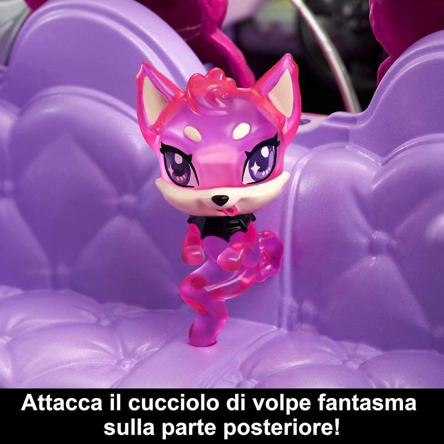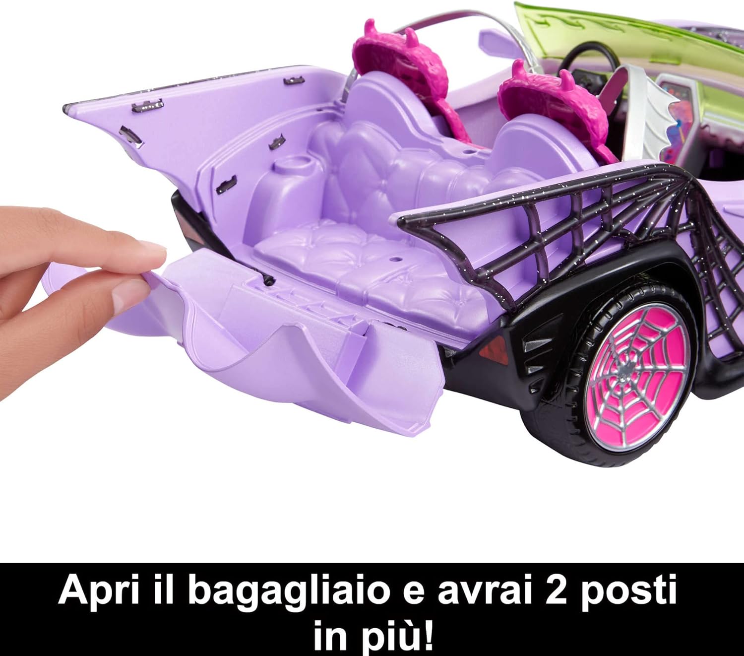 Che corsa da urlo! La Mostromobile Monster High lascia tutti a bocca aperta con il suo rivestimento scintillante a ragnatela, gli originali dettagli spaventosi e gli interni in pelo con le ali di pipistrello modellate sulle cinture di sicurezza. Può ospitare quattro bambole Monster High: due sui sedili anteriori e due su quelli posteriori, dove si apre il vano bagagli con due posti aggiuntivi. Bambole non incluse. Questa fantastica auto da brivido viene fornita con un animale che si aggancia al sedile posteriore. Questa simpatica ma spaventosa volpe fantasma non vede l'ora di unirsi alle amiche da paura per tante avventure da brivido! La Mostromobile Monster High include anche una ghiacciaia a forma di bara che si inserisce all'interno del vano bagagli. Viene fornita con accessori come una bottiglia e due bevande con cannucce! Puoi ammazzare il tempo sorseggiando le bevande riposte nella ghiacciaia o fare un giro mentre ascolti i fantasmagorici brani bop: questo nuovo veicolo ispira storie divertentissime e fantasiose. Vuoi delle amiche che ti portino a fare un giro sulla Mostromobile? Scopri l'intera collezione di bambole e playset Monster High da collezionare e regalare! Ognuna in vendita separatamente, secondo disponibilità.