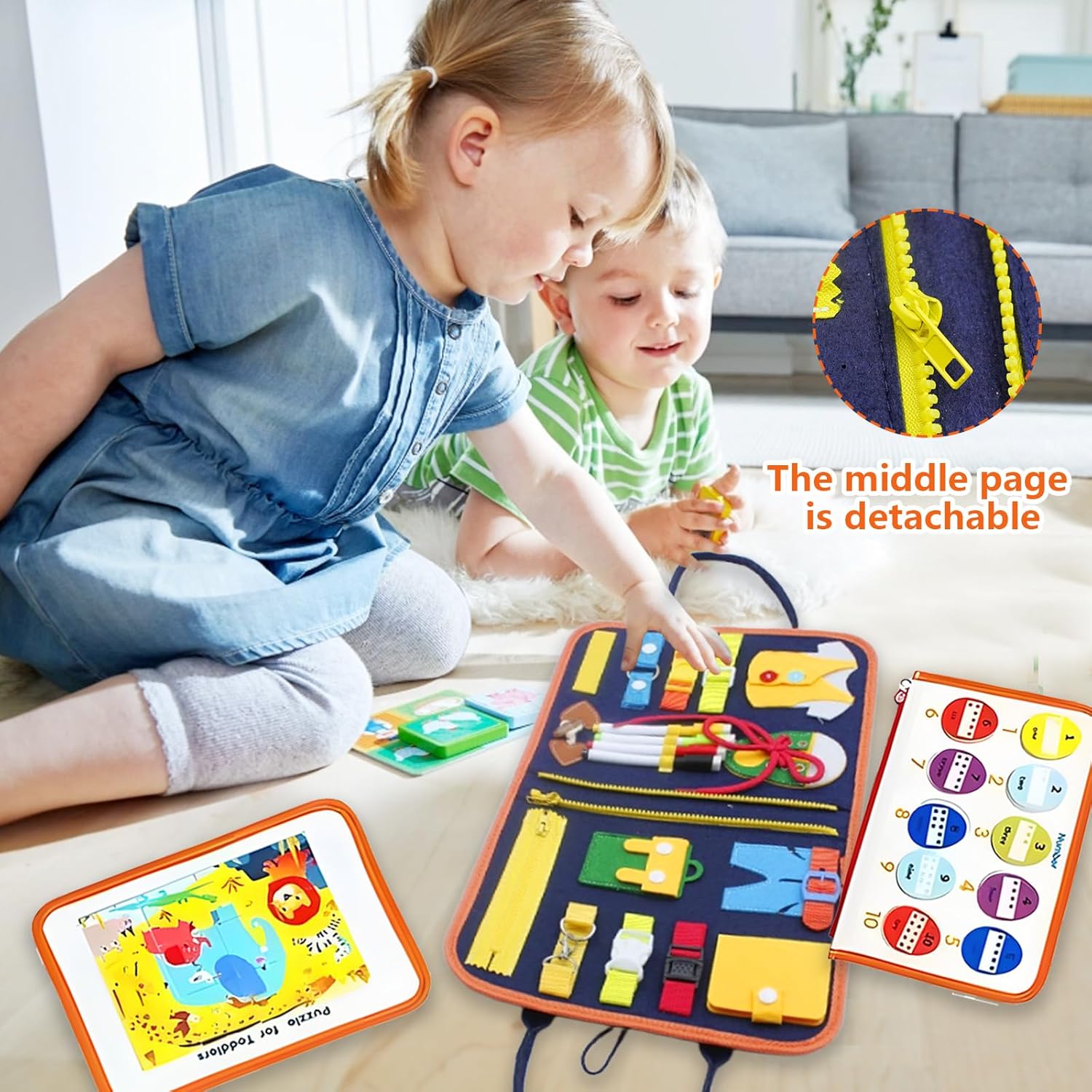 91 accessori all-in-one per lo sviluppo completo: la tavola Montefelt Busy contiene 7 moduli principali (14 gruppi di abilità vitali, 10 numeri, 12 forme, 1 tavola da disegno, 12 puzzle, 26 lettere, 12 colori) Strumento per l'apprendimento dei sensi per bambini: come giocattolo per l'apprendimento dei sensi, con stimoli tattili (adesivi magici, pulsanti, cerniere). Progettato per bambini di età superiore a 3 anni per migliorare completamente i movimenti sottili, la logica e la creatività Abilità di vita e rafforzamento cognitivo: pratiche di vita come i cordoni e i bottoni per sviluppare l'indipendenza. Puzzle e classificazione delle forme attivano il cervello sinistro e destro, giocattoli ideali per le abilità mobili in viaggio, asilo o educazione domestica Portabile morbido: la tavola del sensore è fatta di tessuti e coperte non tossici e morbidi, sicuri e abbastanza morbidi da trasportare; Carica facilmente lo zaino con il cinturino! Accessori completi rinforzo cucitura anti-perdita Regalo puzzle a lungo termine: design colorato per ragazzi e ragazze. Un regalo sostenibile per Natale, compleanno, ringraziamento