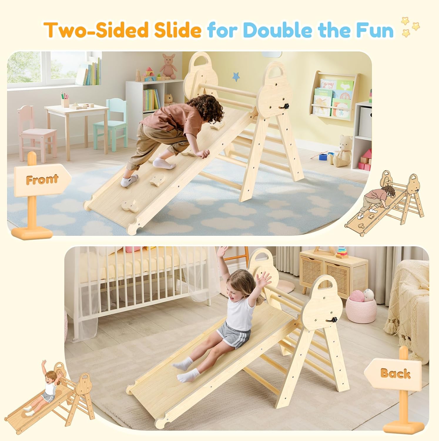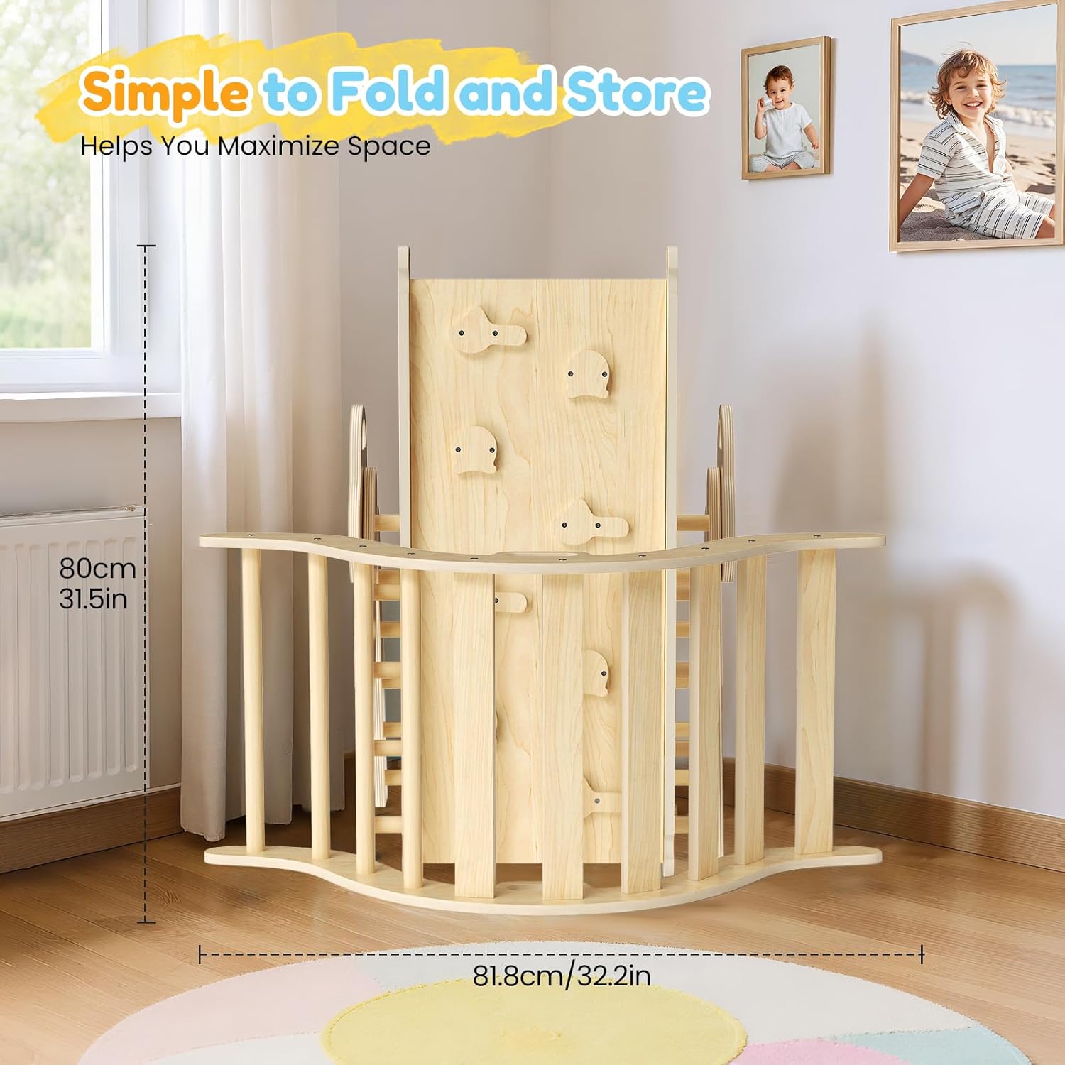 Versatile set da gioco Montessori 9 in 1: questa struttura da arrampicata per interni combina scivolo, altalena, triangolo da arrampicata, arco, rampa da arrampicata, tunnel di gioco e gioco di smistamento in un design intelligente. Appositamente progettato per bambini da 1 a 3 anni, promuove le abilità motorie e lo sviluppo cognitivo – imparare attraverso l'esperienza! Design sicuro con certificazione: il tema dinosauro realizzato con amore entusiasma i piccoli esploratori. Tutti i materiali sono certificati secondo le norme di sicurezza europee, assolutamente inodore e privo di sostanze nocive. Gli elementi imbottiti morbidi e il telaio stabile garantiscono arrampicata e scivolamento sicuri. Legno massiccio di alta qualità e lavorazione sicura per i bambini: realizzato in legno massiccio e resistente agli urti con angoli arrotondati e superfici lisce. La struttura robusta resiste anche al gioco selvaggio, mentre la forma ergonomica previene l'affaticamento. Set completo di accessori per un lungo divertimento: include cuscino per il riposo e due auto da gioco Dino per giochi di ruolo avanzati. Questo versatile accessorio stimola la creatività e prolunga il tempo di gioco senza monotonia. Stimolazione olistica delle capacità motorie e della coordinazione: allena il senso dell'equilibrio, la percezione dello spazio e il controllo del corpo attraverso varie stazioni di arrampicata e gioco. Ideale come regalo di sviluppo per le prime avventure in un ambiente sicuro!