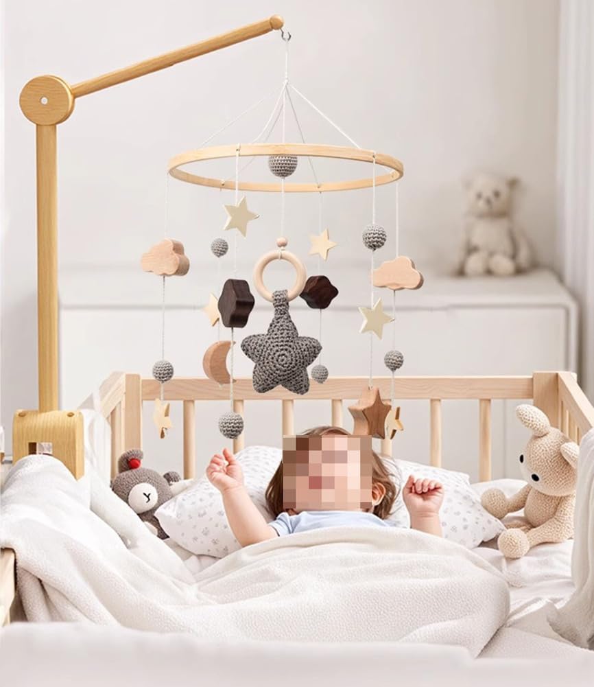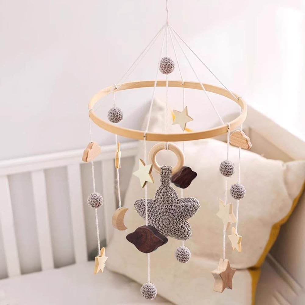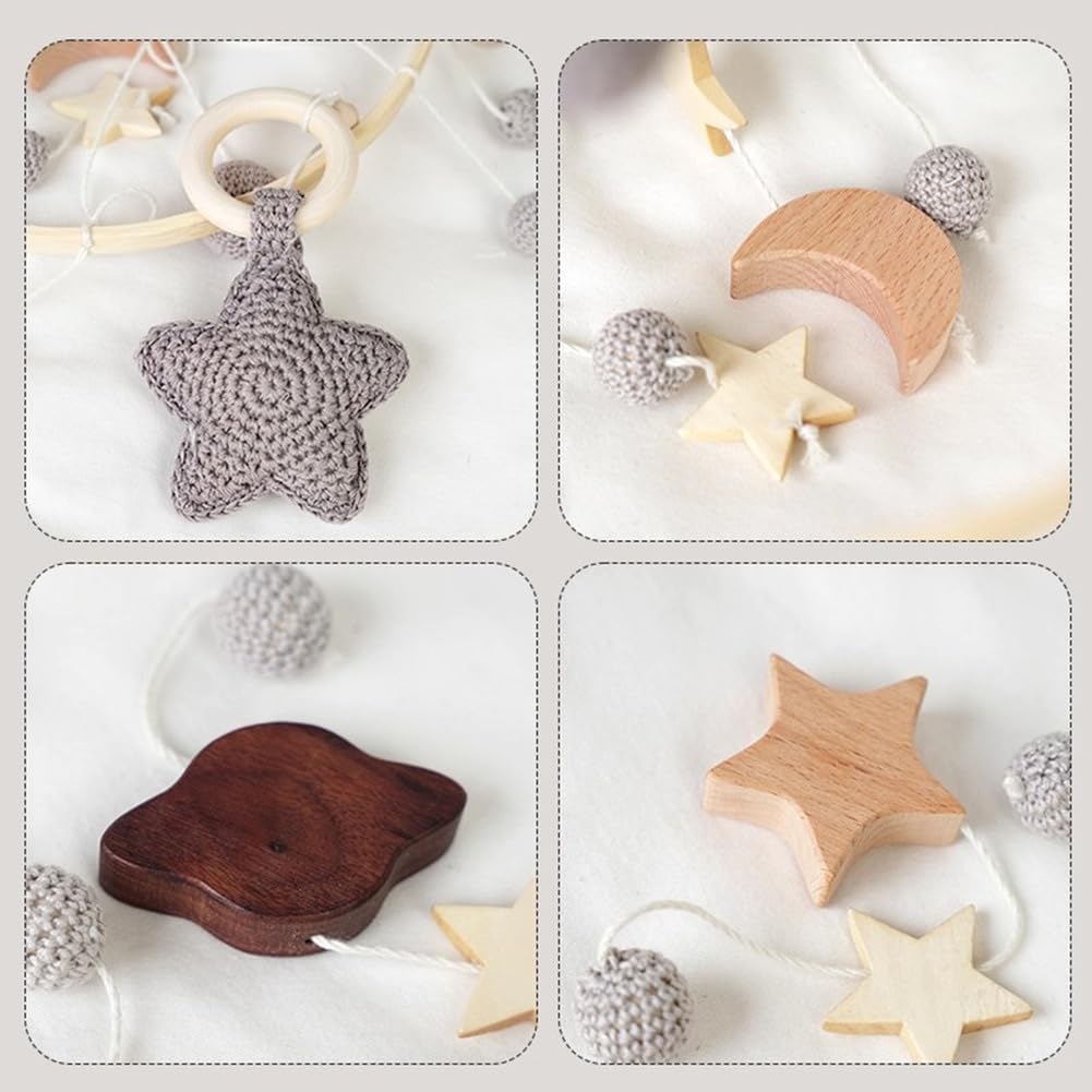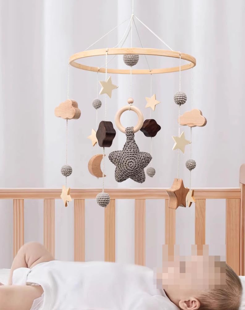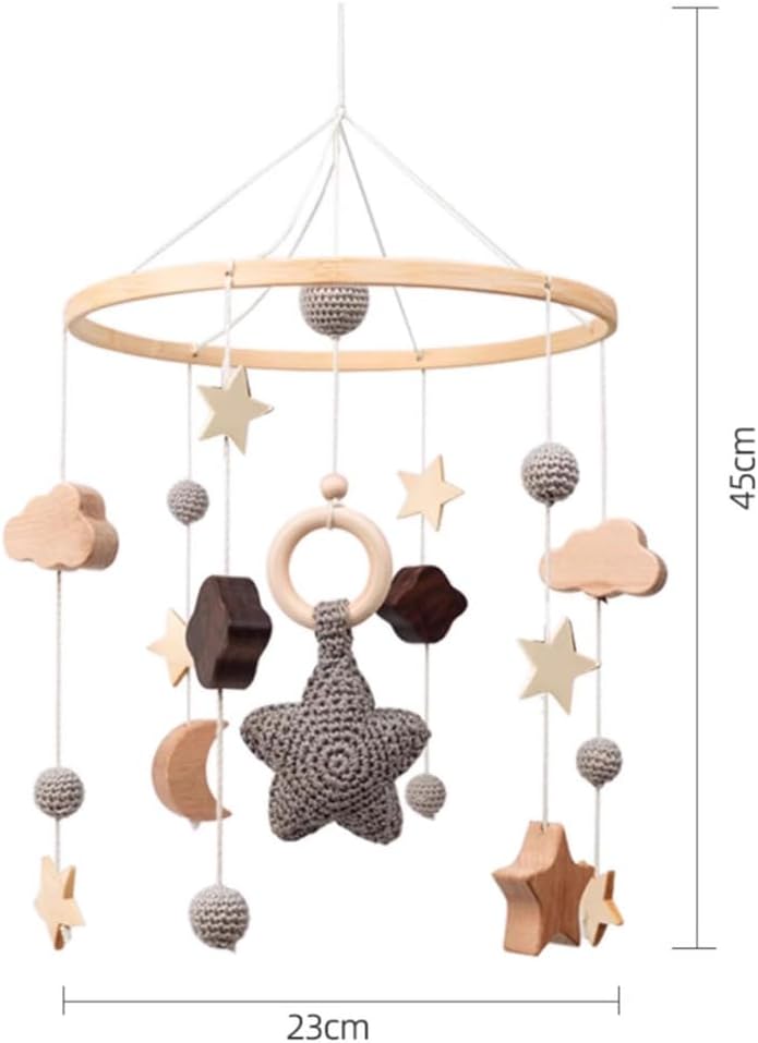 Promuovere lo sviluppo dell'udito e della vista: basta appendere la giostrina della cameretta a un supporto per giostrina per bambini (non incluso). Il colore naturale e rilassante offre abbastanza interesse e immaginazione per i neonati, ma non stimola eccessivamente. . La nostra giostrina per culla contiene campanelli che emetteranno un suono piacevole quando trema leggermente o quando soffia il vento. Aiuta il bambino a calmarsi lentamente e ad addormentarsi lentamente. Riconoscimento di forme multiple: stelle, lune, nuvole e altre forme, illuminazione della prima educazione, coltivazione della capacità di riconoscimento della forma dei bambini fin dalla tenera età. La rotazione a 360° aiuta a coltivare la capacità di sviluppo e la concentrazione del tracciamento visivo dei bambini. Materiali principali: Legno massello naturale, ganci artigianali.