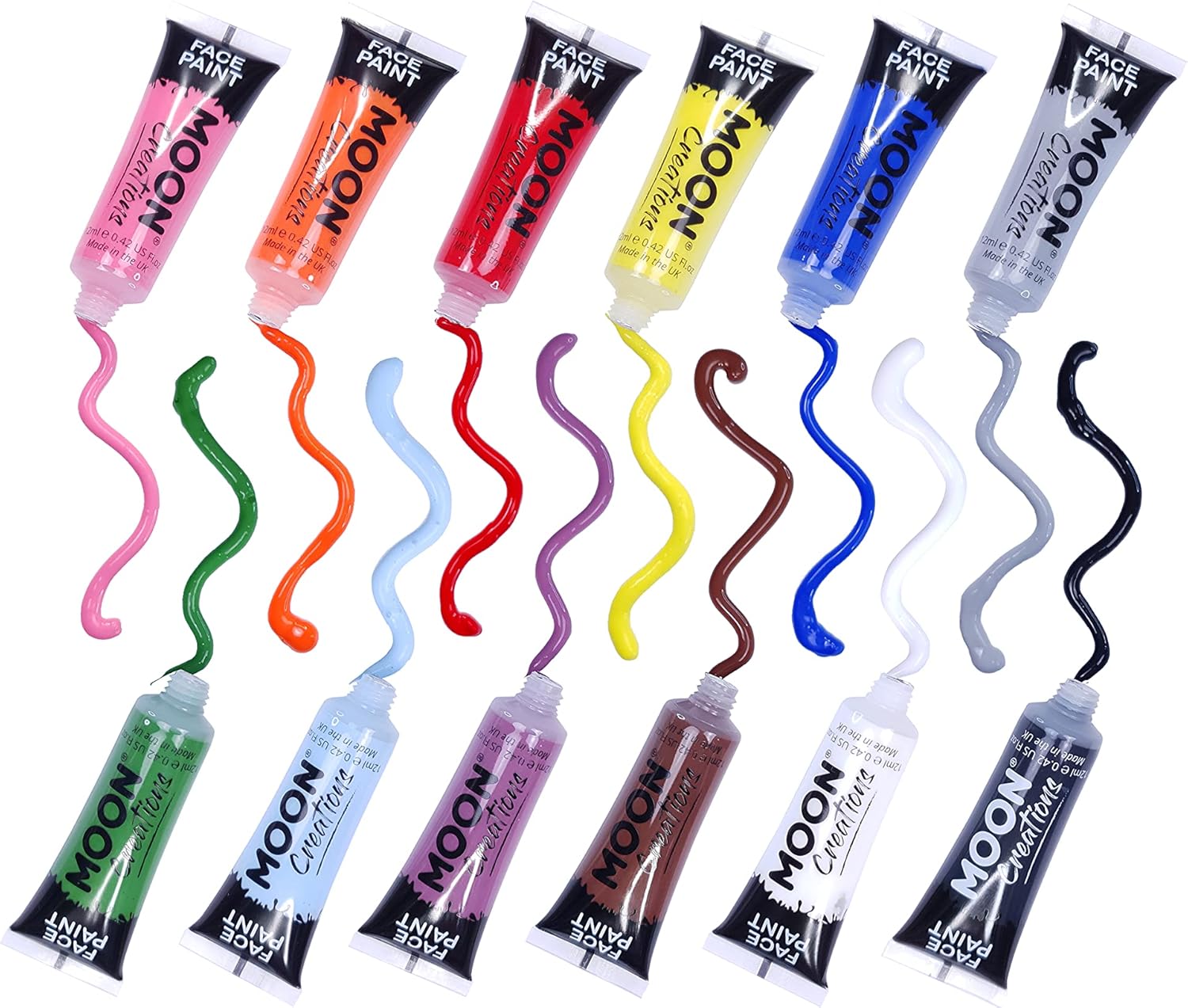VERNICE PER IL VISO PRONTA ALL'USO PER BAMBINI E ADULTI: padroneggia il mondo della pittura per il viso con i tubi di pittura per il viso pronti all'uso di Moon Creations per feste per bambini, festival, feste, serate a tema e altro ancora! QUALITÀ PREMIUM, CHE NON SI SCAGLIA: le nostre vernici di facile applicazione sono di alta qualità con una formula che non si sfalda e di lunga durata, quindi aspettati una copertura eccellente ad ogni applicazione e senza screpolature o sfaldature. PER TUTTI I LIVELLI DI ABILITÀ E OCCASIONI: dal principiante al professionista del truccabimbi, Moon Creations ha coperto il tuo prossimo look, che si tratti di un supereroe, un personaggio dei cartoni animati, un animale, una fata o un costume per eventi come Halloween o Pasqua. PRONTO ALL'USO, FACILE APPLICAZIONE: non è necessaria acqua con questa vernice per il viso pronta all'uso. Basta aprire il tubo, spremere un po' di vernice e applicare utilizzando un pennello, una spugna o la punta delle dita! Si asciuga rapidamente ed è facile da rimuovere.