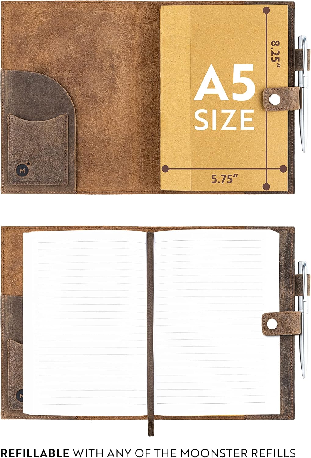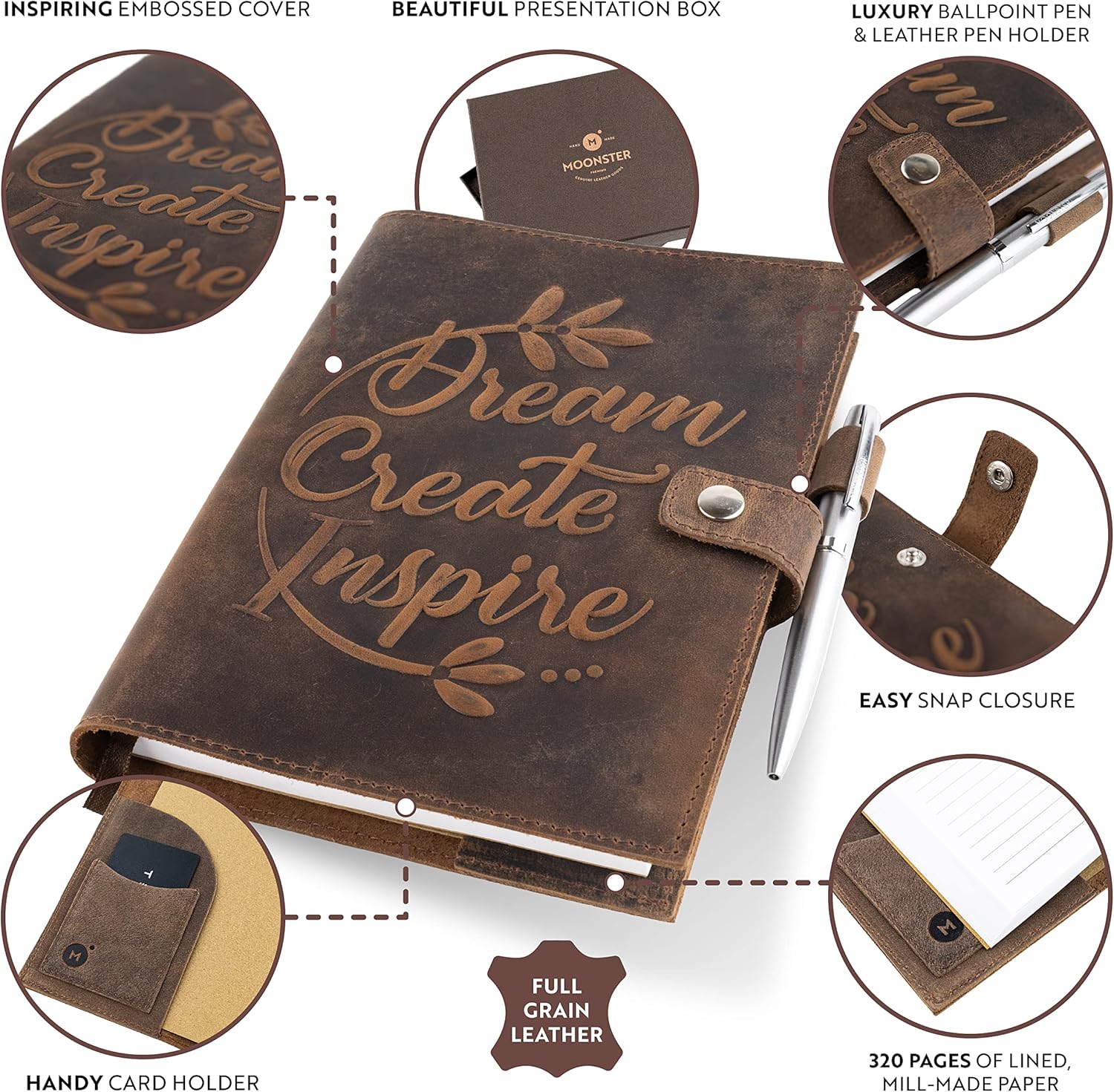 MENTRE MOLTI TACCUINI HANNO COPERTURE IN ECOPELLE DI BASSA QUALITÀ CHE SI GRAFFA FACILMENTE, il nostro taccuino in pelle A5 è rilegato con pelle di BUFALO a grana pura al 100% tagliata a mano per un autentico look vintage. Con la scritta "Dream, Create, Inspire", questi quaderni in pelle da 22 x 16 cm sono regali di celebrazione perfetti per donne e uomini che li lasceranno ISPIRATI E MOTIVATI. GLI ALTRI GIORNALI SONO FATTI DI CARTA DI BASSA QUALITÀ CHE SGRASSA LA SCRITTURA. Realizzato a mano in India con materiali di prima qualità, il nostro diario in pelle ricaricabile è realizzato con CARTA BIANCA da 70 g/m², perfetta per scrivere. La nostra agenda in pelle include un PORTAPENNA INTERNO E UNA PENNA A SFERA IN ARGENTO che scorre nei 160 fogli (320 PAGINE) dell'agenda, così puoi annotare facilmente pensieri e ricordi. UN ELEGANTE DIARIO IN PELLE! Emanando fascino rustico, per non parlare del prezioso odore di pelle, la copertina del libro dall'aspetto vintage può essere utilizzata per tutta la vita - ricarica con le nostre varie ricariche di carta Moonster - CERCA "MOONSTER REFILL". Queste agende marrone scuro possono variare nell'aspetto e nel colore, rendendole regali unici e stimolanti per donne e uomini. IL DIARIO IN PELLE RICARICABILE VINTAGE CHE FA DONAZIONI. Per ogni acquisto effettuato, Moonster dona il 5% dei profitti a 5 enti di beneficenza in India, Zambia, Bolivia, Regno Unito e Stati Uniti. A MOONSTER AMIAMO CREARE PRODOTTI IN PELLE FATTI A MANO CHE I NOSTRI CLIENTI AMANO TANTO QUANTO NOI. Siamo una piccola azienda a conduzione familiare, proprio come il nostro principale fornitore in India, che impiega ARTIGIANI LOCALI per realizzare gli splendidi prodotti che abbiamo il privilegio di vendere. Ogni taccuino è FATTO A MANO E PROVENIENTE ETICAMENTE utilizzando, ove possibile, MATERIALI SOSTENIBILI e RICICLATI.