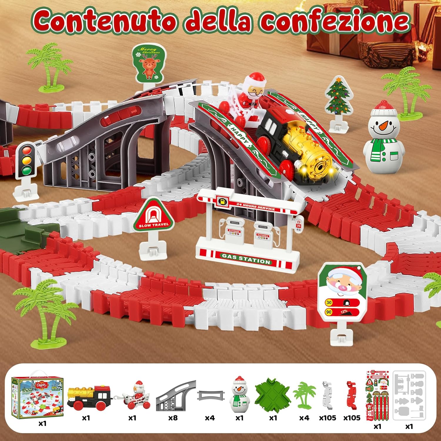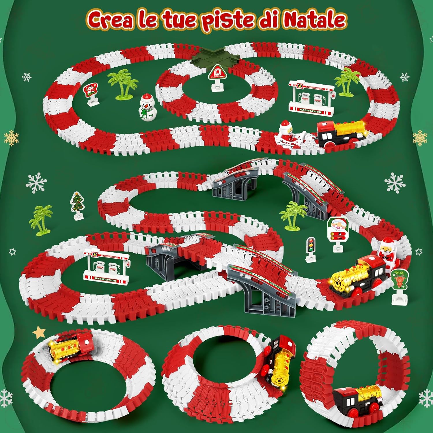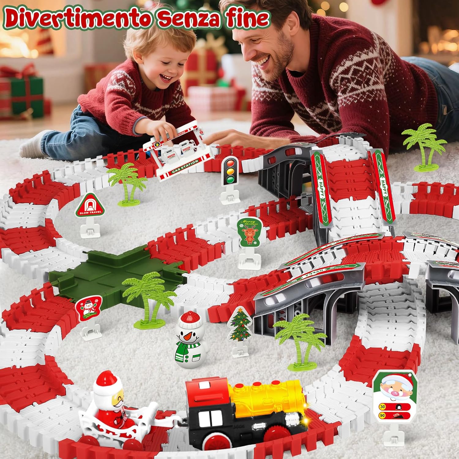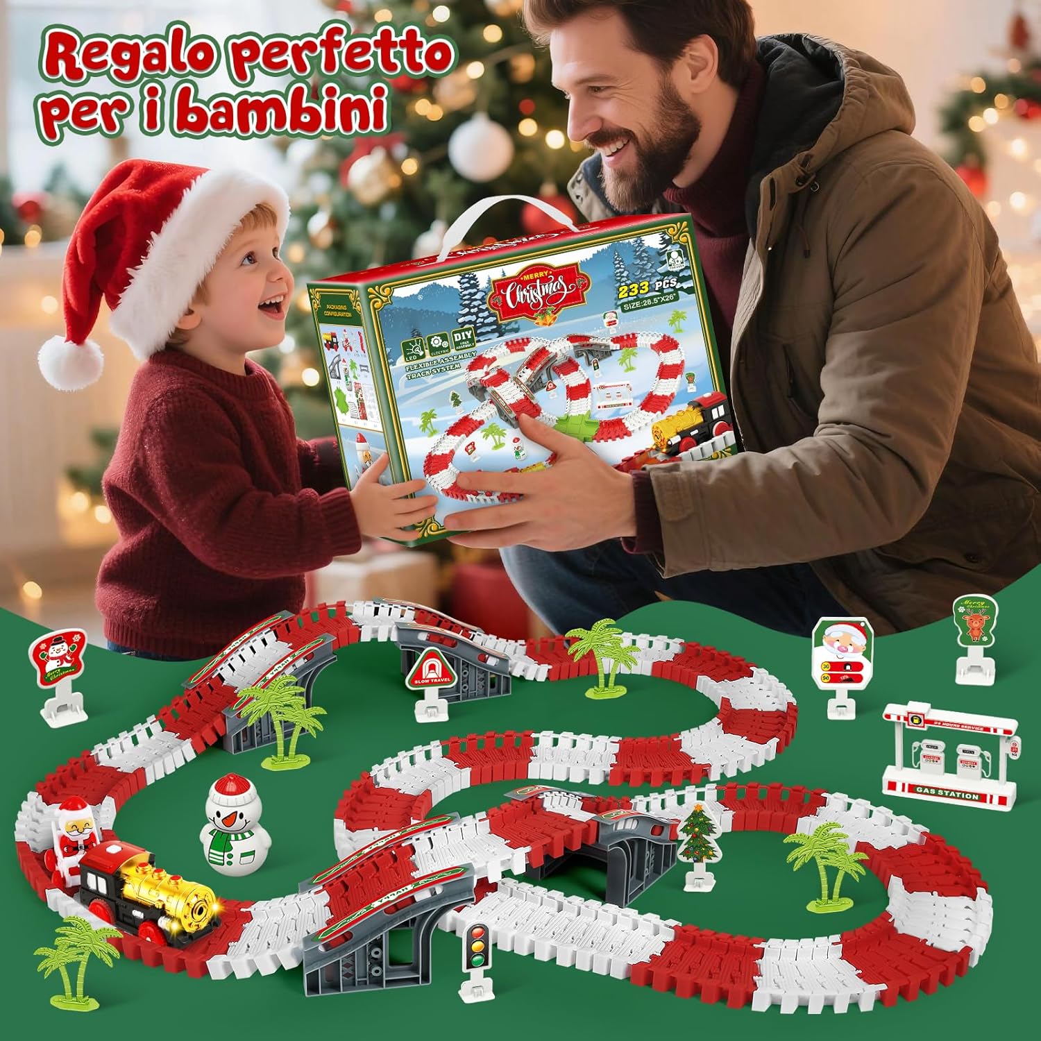 Set Pista Macchinine & Trenino di Natale: MOONTOY natale pista macchinine per bambini include 210 pezzi pista macchinine flessibile, un trenino elettrico natalizio e tanti accessori festivi come locomotiva di Babbo Natale, pupazzo di neve e segnali luminosi. Perfetto come treno per albero di Natale o pista macchinine 3 anni durante le feste Pista per Macchinine Flessibile: Questo circuito è estremamente flessibile, può essere piegato in diverse forme ed è facile da montare e smontare. Bambini possono piegare, agganciare e modellare la pista per macchinine per creare percorsi sempre diversi. Questa pista per macchinine bambini e trenino albero di natale stimola l’immaginazione e la logica, offrendo ore di gioco educativo e divertente Sicuro e di Alta Qualità: Realizzato in materiale plastico atossico e durevole. Tutti i bordi sono lisci e privi di bave, sicuri per le mani delicate dei bambini. Il trenino elettrico è resistente e funziona con 2 batterie AAA (non incluse) Inario Flessibile & Divertimento Educativo: la pista per macchinine è perfetto per bambini dai 3 anni+. Grazie al binario flessibile, i bambini possono creare nuovi layout di pista secondo le proprie idee, poiché il binario non è composto da parti separate. Oltre al divertimento, aiuta a rafforzare le abilità pratiche, imparare la collaborazione e conoscere i fondamenti di trasporti e costruzione. Un must-have per ragazzi curiosi! Regalo di Natale Ideale per Bambini: MOONTOY Pista Macchinine per Bambini di Natale – Trenino Albero di Natale con suo tema natalizio luminoso – e confezione colorata, questo set è il regalo ideale per bambini e bambine dai 3 agli 8 anni. Perfetto per compleanni, Natale o momenti in famiglia. Un giocattolo magico che porta sorrisi e divertimento a ogni bambino!
