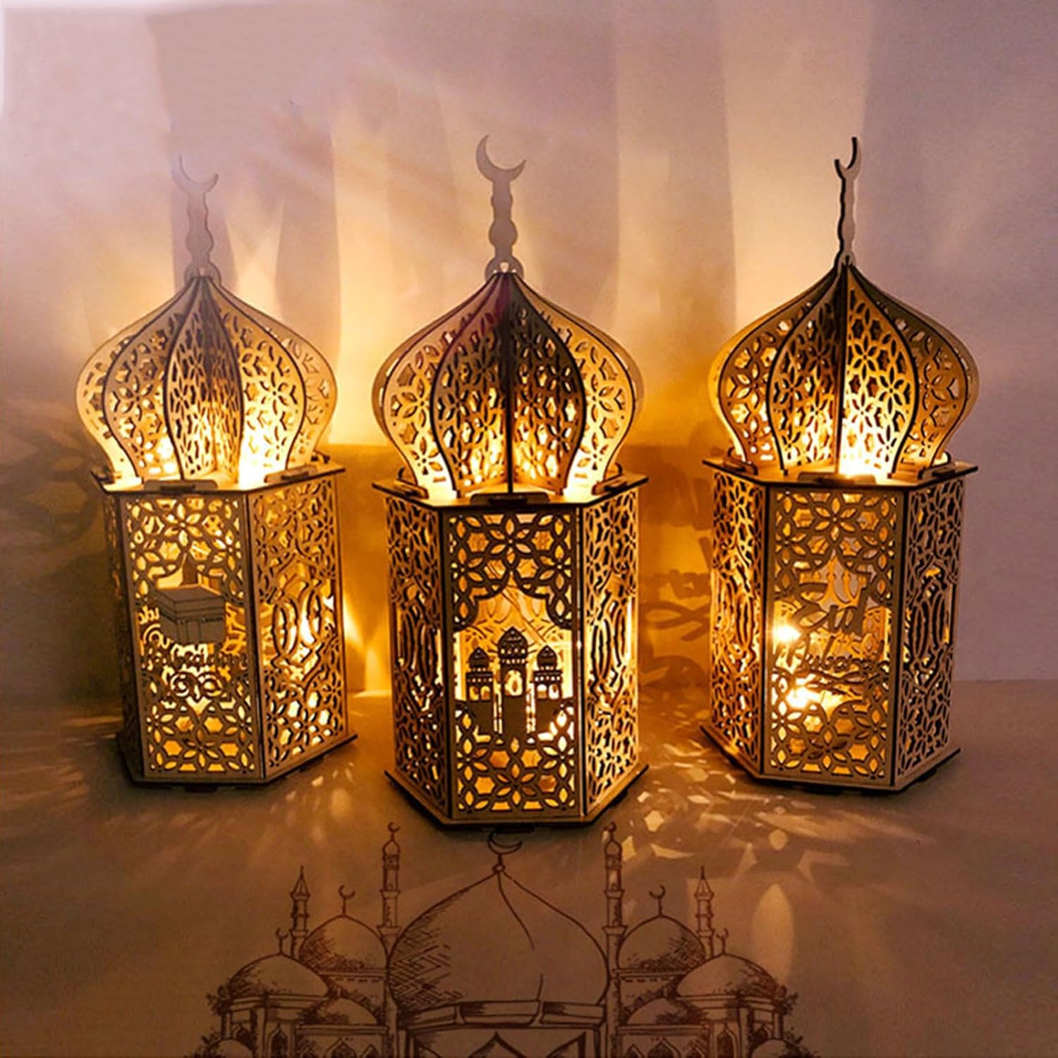 La decorazione da tavolo ha una pregevole fattura, forma tridimensionale, che aggiungerà un tocco alla tua decorazione Questa decorazione da tavolo è adatta per scrivania, tavolo e libreria e può essere utilizzata in salotto, camera da letto o altri luoghi per aggiungere calore alla tua vita Crea il tuo ornamento festivo per la casa con questo set di decorazioni a forma di moschea Realizzato in legno leggero ma resistente e La decorazione da tavolo Eid creerà opere d'arte accattivanti per la tua stanza. Adatto per decorare la camera da letto o il soggiorno