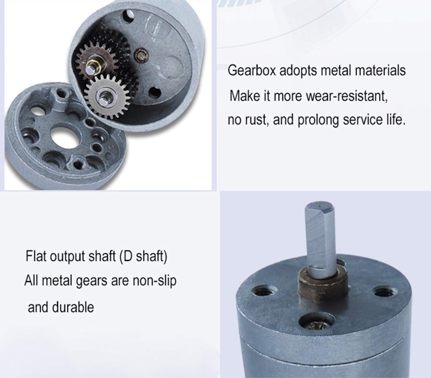Applicazione: Auto, bicicletta elettrica, giocattoli, robot intelligente, serratura elettrica, serrature elettroniche con dita, interruttore della rete elettrica, interruttore del telecomando, serratura dell'hotel, serratura remota, Smart Lock, serratura intelligente, aeromodello, aeromodello, motore della fotocamera, apparecchio, mini telecamera Pan/Tilt Ingranaggio: materiale interamente in metallo, più resistente all'usura, a prova di ruggine, maggiore durata, albero di uscita piatto (albero a D): l'ingranaggio interamente in metallo è antiscivolo e durevole Magnete addensato: un forte campo magnetico, aumenta la coppia e impedisce il segnale essere disturbato e diffuso Avvolgimento in rame puro (silenzioso e durevole): calore ridotto, lunga durata (fino a 800 ore o più), basse perdite e forte stabilità. Materiale di alta qualità, non facile da arrugginire, non facile da corrodere, motore con spazzole di carbone, durevole, il motore è contrassegnato con poli positivi e negativi, comodo e pratico,