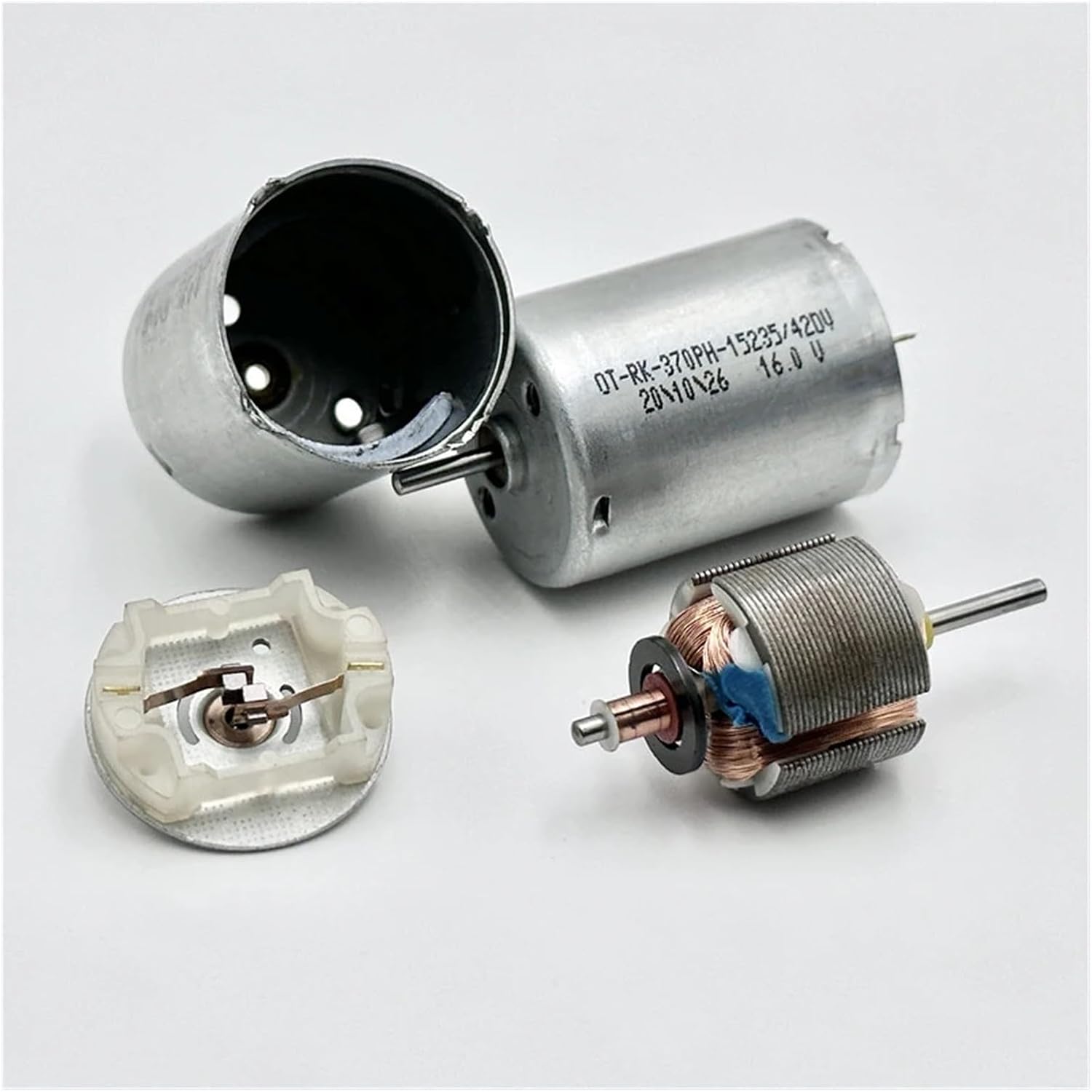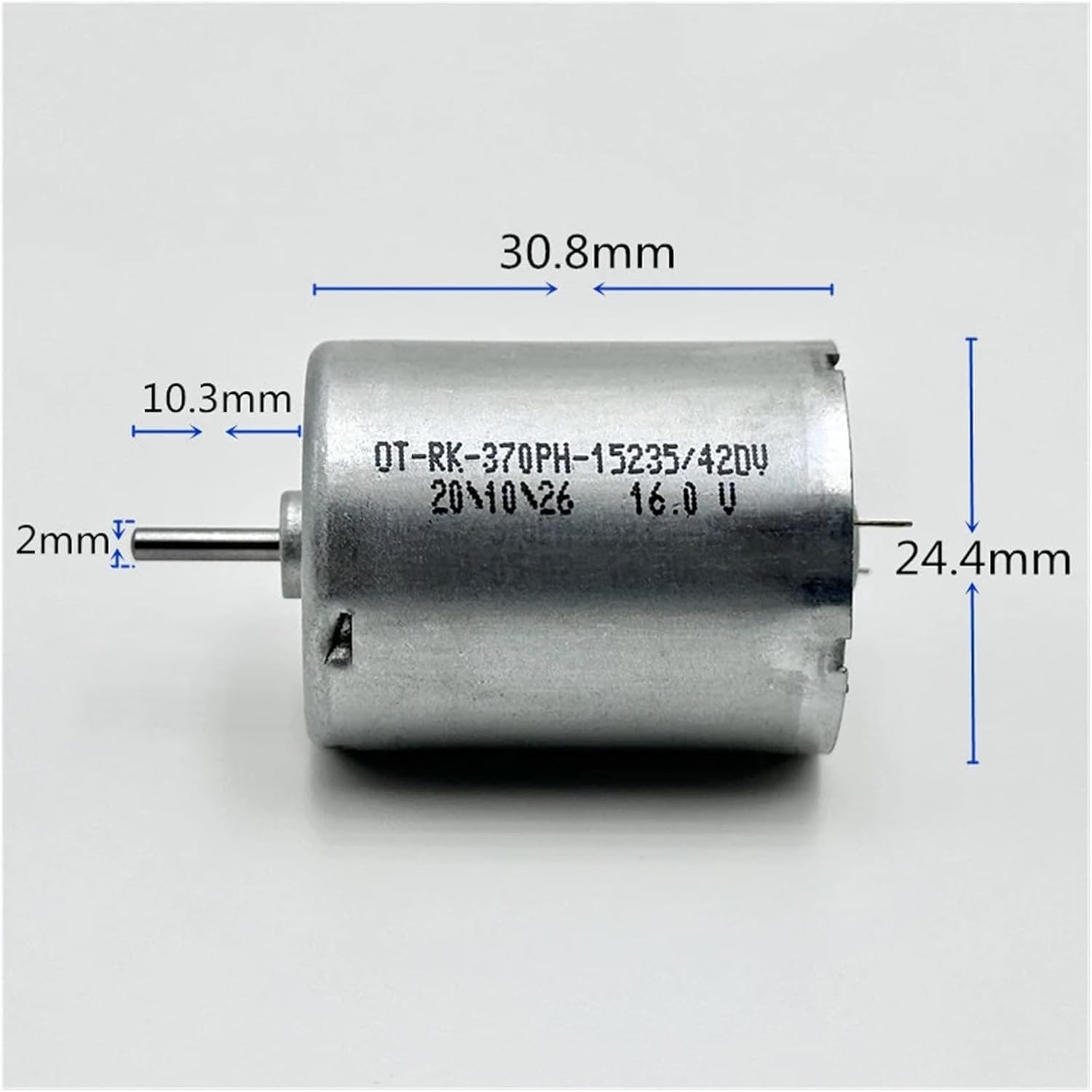 Model: OT-RK-370PH-15235 Motor size: 24.4mm*30.8mm Output shaft diameter: 2.0mm Output shaft length: 10.3mm(include step height) Weight: 48g