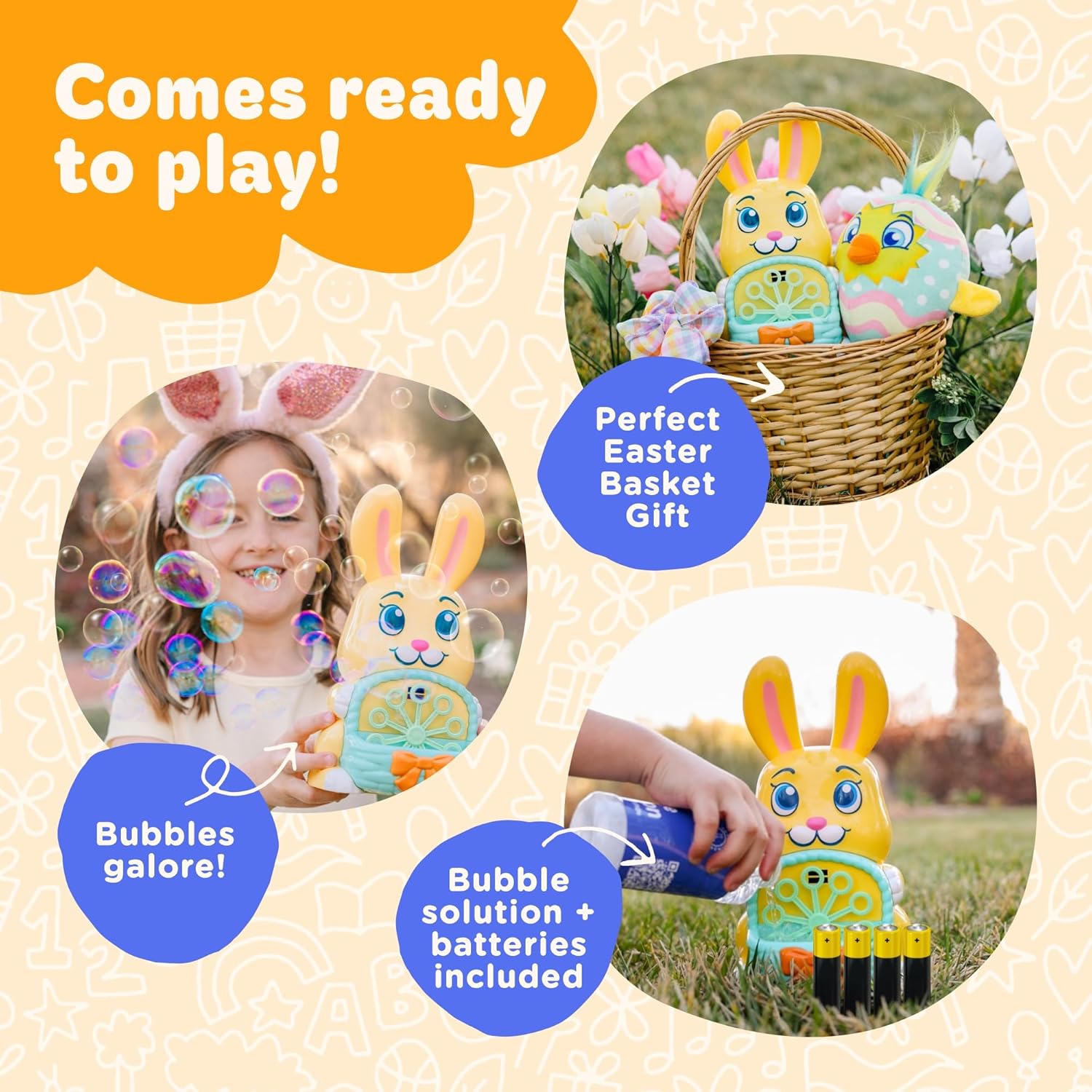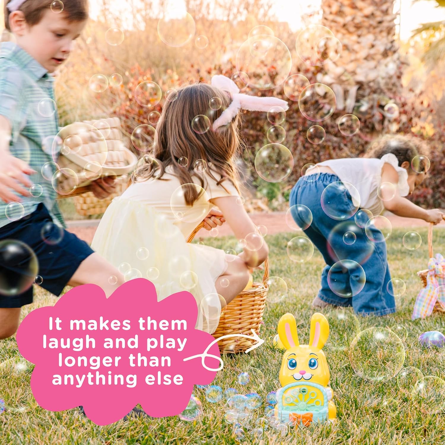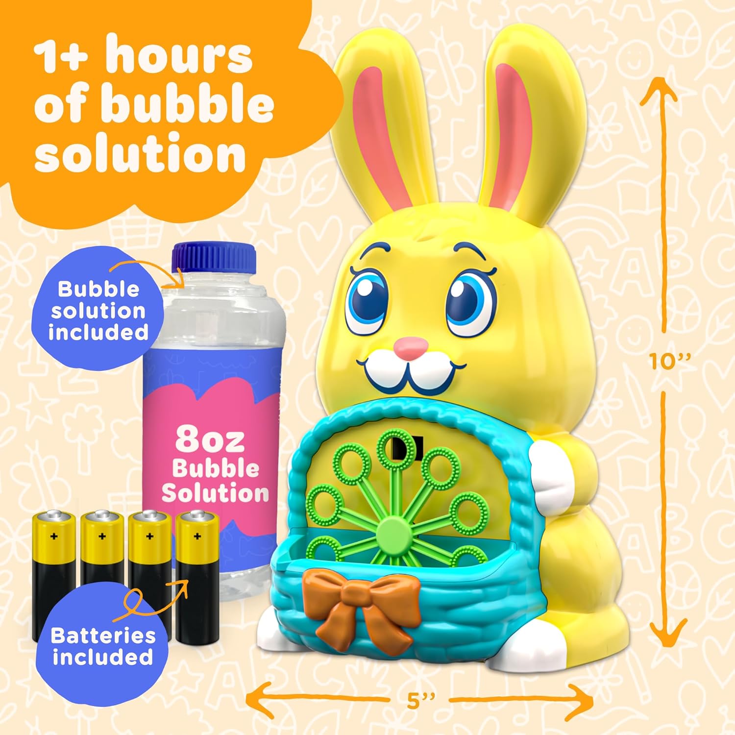 RENDI MAGICHE LE BOLLE: questa affascinante macchina per bolle a forma di coniglietto include tutto il necessario per creare un pomeriggio stravagante: 4 batterie AA e soluzione per bolle incluse. Design portatile: progettata pensando al gioco attivo, questa macchina per le bolle include una comoda maniglia che i bambini possono afferrare mentre galoppano. Presenta un design durevole e un vano batteria resistente all'acqua per garantire un divertimento pomeridiano senza fine. 8 once di soluzione: include abbastanza soluzione di bolle per godersi ore di divertimento pieno di arcobaleno. Che si tratti di una festa di compleanno o di un appuntamento di gioco al parco, questa macchina per bolle è pronta a rendere ogni occasione memorabile Bolle a bizzeffe - Preparati per una magica esplosione di bolle Il nostro soffiatore di bolle a forma di unicorno produce migliaia di bolle al minuto, creando un'atmosfera fantastica ovunque ti porti la tua immaginazione.