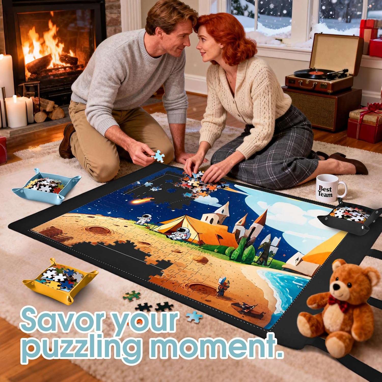 Dimensioni del Tappetino: Ampio tappetino in gomma da 95x150 cm per puzzle fino a 3000 pezzi Accessori Inclusi: Set completo con 8 vaschette per organizzare i pezzi e una pratica custodia per il trasporto Comfort e Stabilità: La superficie in morbido tessuto skin-friendly è piacevole al tatto e delicata sulla pelle, mentre la base in gomma ad alta aderenza blocca il tappetino sul tavolo, permettendoti di concentrarti solo sul tuo puzzle. Funzionalità: Facilmente arrotolabile per conservare il puzzle in corso di completamento Compatibilità: Adatto per puzzle da 1000, 1500, 2000 e 3000 pezzi di qualsiasi marca Caratteristiche Speciali: Superficie antiscivolo che mantiene i pezzi del puzzle in posizione durante l'assemblaggio