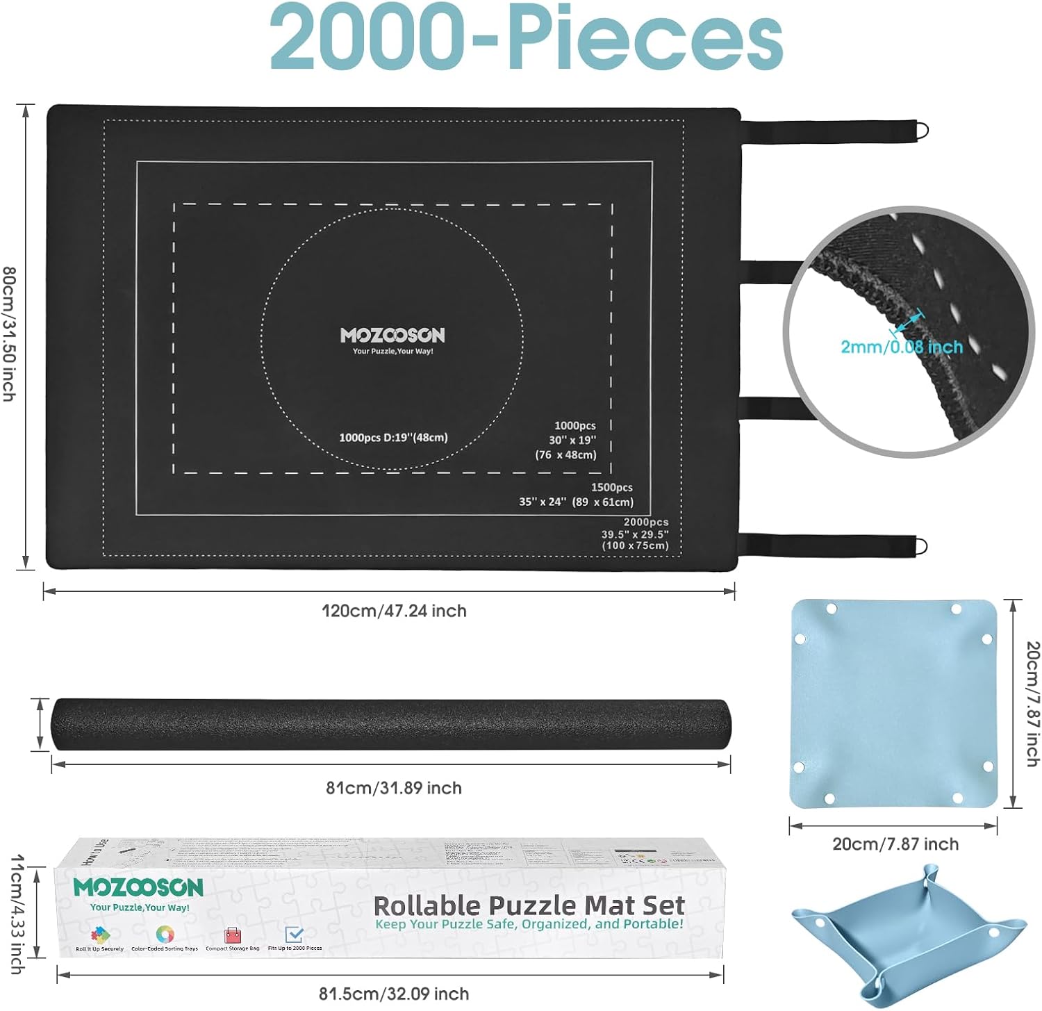 Tappetino Puzzle: Stuoia in gomma di alta qualità con dimensioni 80 x 120 cm per assemblare e conservare i puzzle Set Completo: Include 8 vaschette portapezzi e una custodia per un'organizzazione ottimale Capacità: Adatto per puzzle da 1000, 1500 e 2000 pezzi con ampio spazio di lavoro Arrotolabile: Facile da riporre e trasportare grazie alla sua flessibilità e praticità Accessori Inclusi: Set completo con vaschette separate per una migliore organizzazione dei pezzi del puzzle