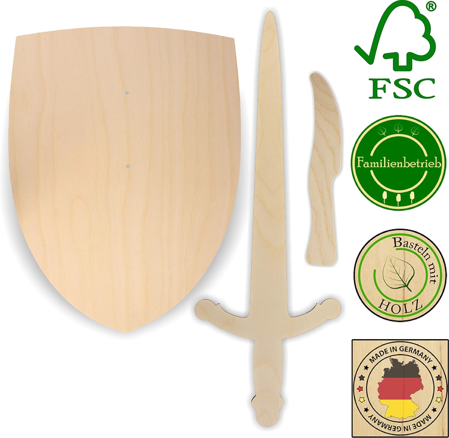 Compensato di betulla da 3 mm - super leggero e molto stabile con colori, pietre glitterate, pennarelli glitter per progettare liberamente materiale non trattato, superfici finemente levigate, bordi levigati, certificato secondo E1 Made in Germany - produzione propria Dimensioni dello scudo ca. 32 x 24 x 0,3 cm, dimensione della spada ca. 40 x 8,5 x 0,3 cm, dimensione del coltello ca. 22 x 4 x 0,3 cm Non adatto a bambini di età inferiore a 3 anni, non senza la supervisione di un adulto, questo prodotto non offre alcuna protezione, conforme CE