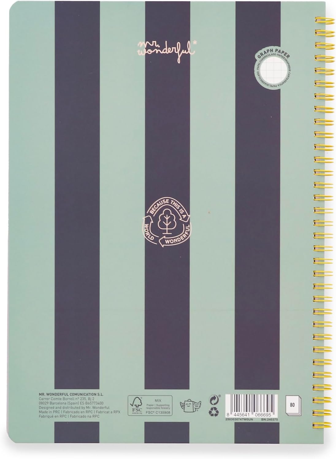 Quaderno formato A4 con rilegatura a spirale e copertina rigida. Con 160 pagine quadrate da 90 g/m², certificata FSC, che garantisce che la carta proviene da foreste gestite in modo responsabile. Include foglio di adesivi.