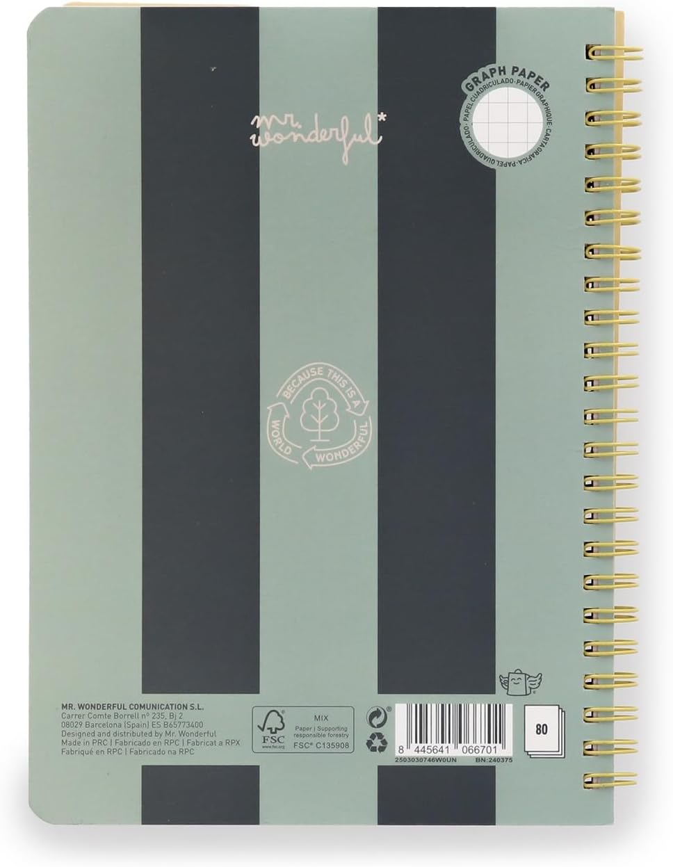 Quaderno formato A5 con rilegatura a spirale e copertina rigida. Con 160 pagine quadrate da 90 g/m², certificata FSC, che garantisce che la carta proviene da foreste gestite in modo responsabile. Include foglio di adesivi.
