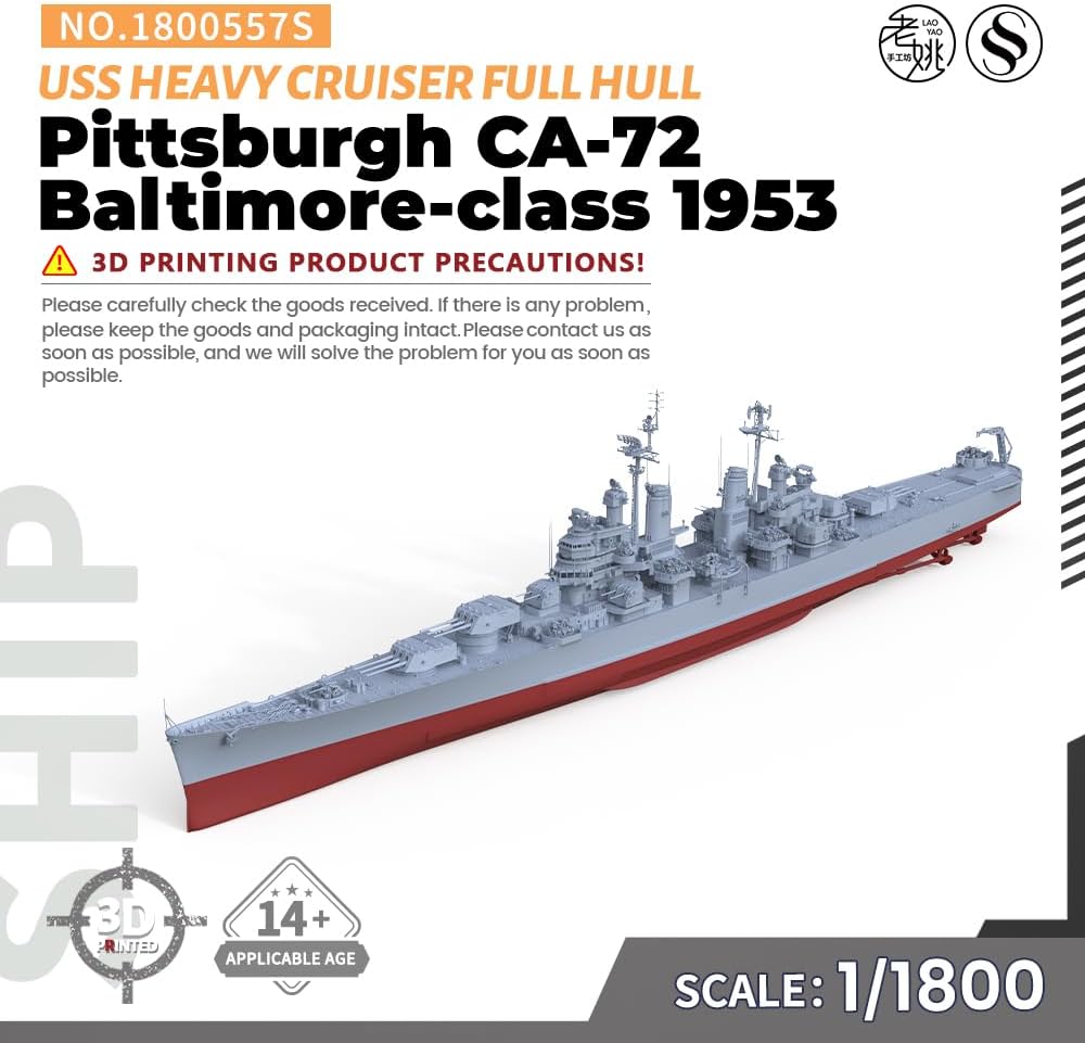 Kit modello militare USS Pittsburgh CA-72 Baltimore Class Heavy Cruiser 1953 Rapporto scafo completo: 1/1800 Caratteristiche: Non dipinto Tema: Militare Materiale: Resina verniciata 3D