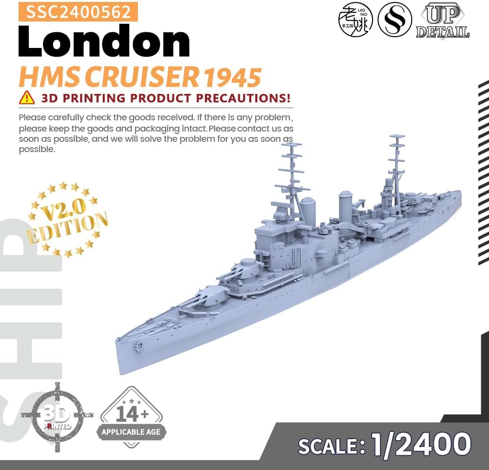 Kit modello militare HMS London Cruiser 1945 Rapporto: 1/2400 Caratteristiche: Non dipinto Tema: Militare Materiale: Resina verniciata 3D