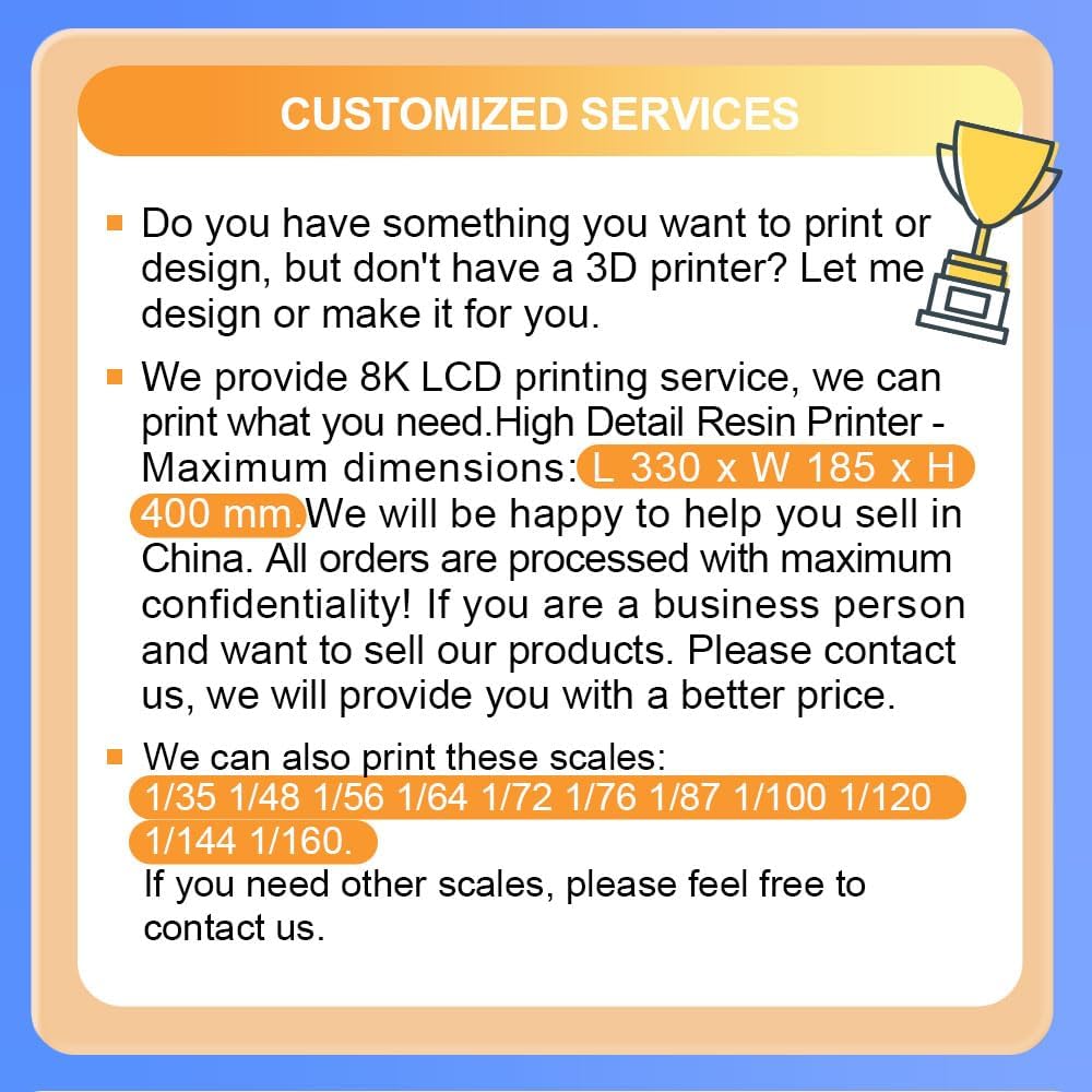 Kit modello: resina stampata in 3D 1/100. Realizzato con materiali ecologici. Difficoltà nella realizzazione: questo modello non è adatto ai principianti, è adatto agli amanti dei modelli professionisti. Poiché il materiale è resina, viene utilizzata la tecnologia di stampa 3D e il modello deve essere lucidato e colorato. Se il tempo è troppo lungo, il modello potrebbe deformarsi e dovrà essere scottato con acqua bollente per ripristinare la forma originale. Garanzia di qualità: dopo aver ricevuto la merce, in caso di danni, ti preghiamo di contattarci in tempo. Limite di età: 17+ Paese di consegna: Cina