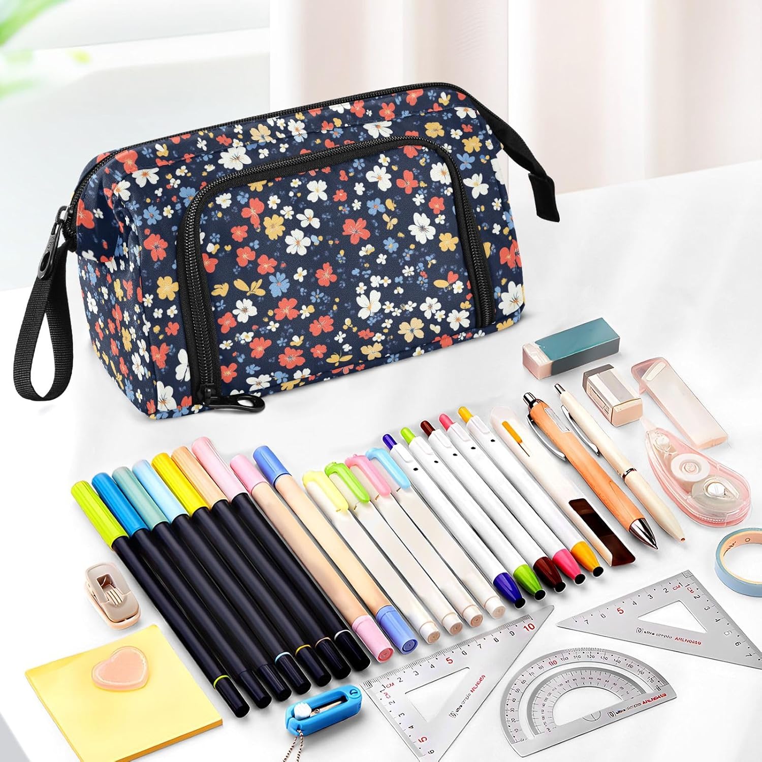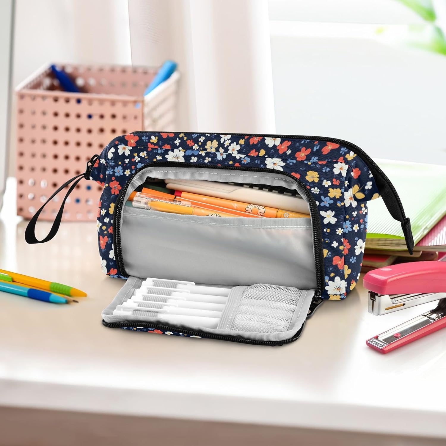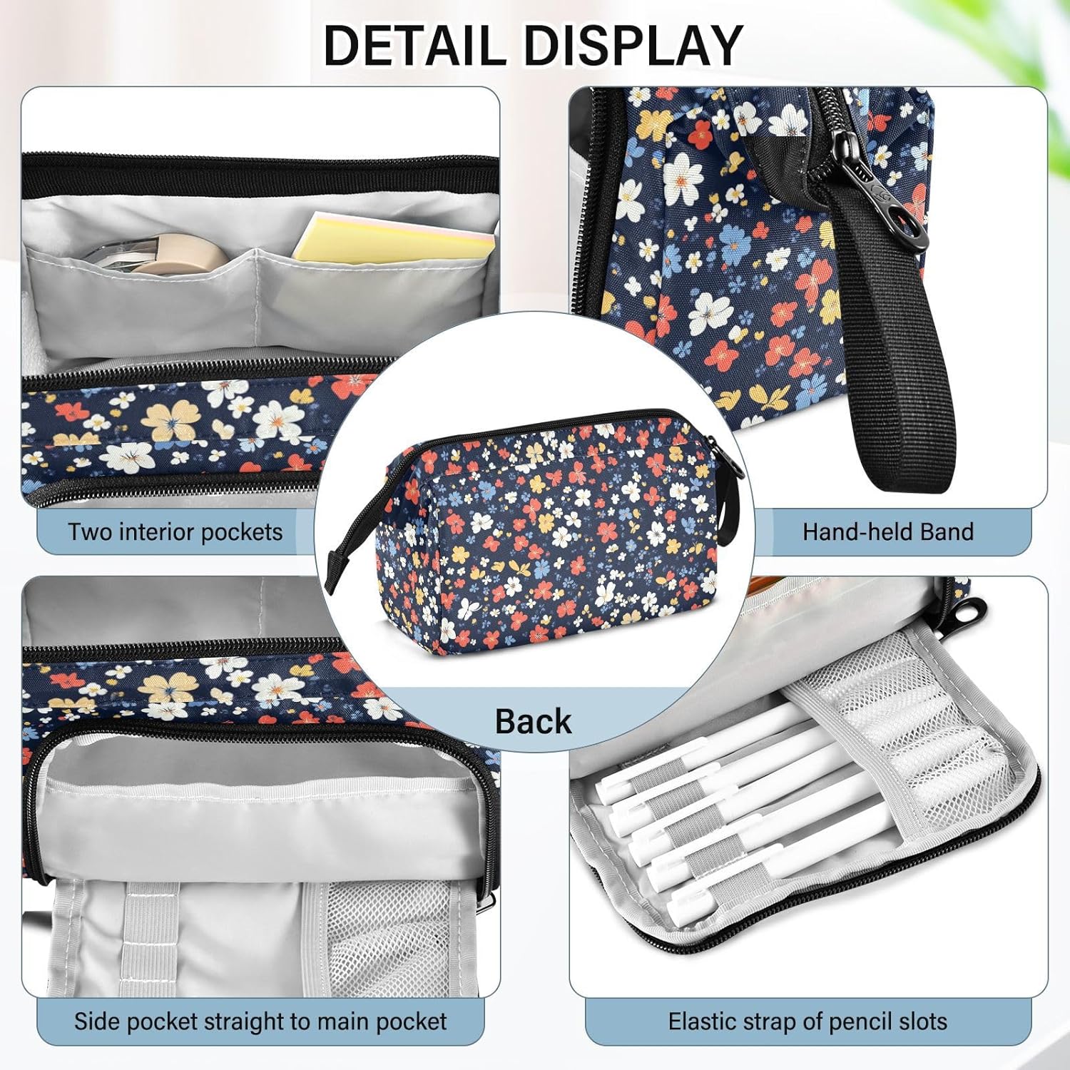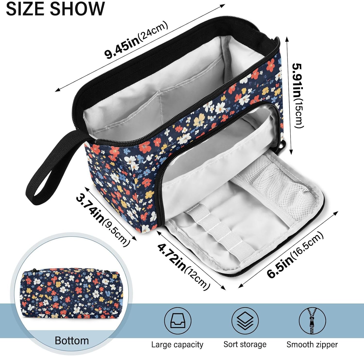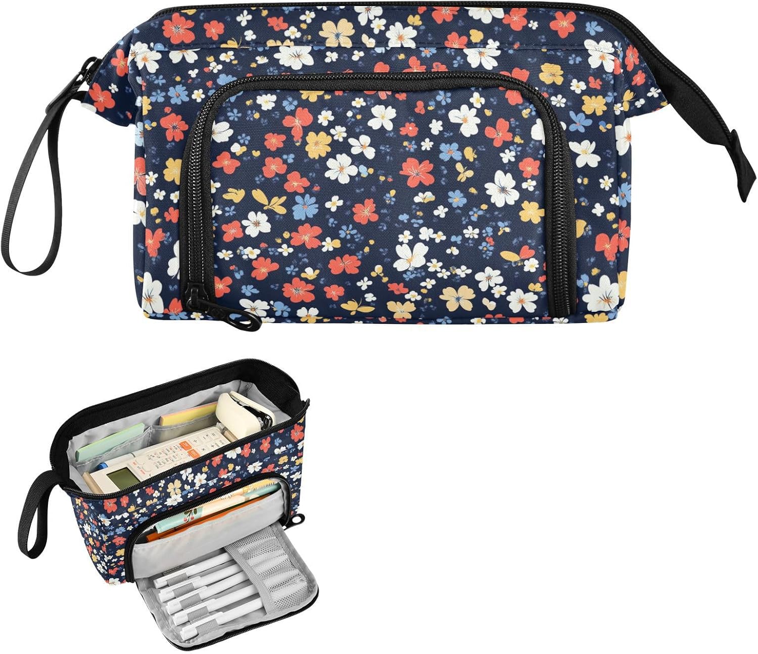 Materiale di lunga durata: realizzato in tessuto di nylon resistente, cerniera forte e resistente. Più robusto, leggero, resistente ai graffi, facile da pulire. (Non adatto a bambini di età inferiore ai 3 anni!) Grande capacità: 24 x 9,5 x 15 cm. Dotato di 1 grande scomparto, 1 comoda tasca laterale e 2 tasche interne, Pencil Box è davvero un must have di dimensioni generose. La tasca principale può organizzare fino a 40-60 penne, matite o pennarelli, anche gomme, righelli, calcolatrici, nastri, foglietti adesivi, pennelli, cosmetici possono essere riposti facilmente. Con 5 matite schiaffeggiate sulla tasca laterale, le penne spesso utilizzate possono essere fissate. Due tasche interne possono contenere oggetti facilmente persi come carte, chiavi e contanti. Design portatile e pratico: con funzionalità leggere e un'ampia fascia da tenere in mano, l'astuccio può essere messo facilmente nello zaino o tenuto in mano senza sforzo. L'apertura superiore e laterale aggiunge più comodità nella tua vita. Puoi controllare o prendere la tua cancelleria molto chiaramente dall'alto e raccogliere le tue matite preferite dagli slot fissi laterali. Multi funzioni: con una tasca frontale aggiuntiva e uno scomparto principale di grande capacità, il nostro prodotto non è solo un astuccio, ma una borsa, una borsa da viaggio, una borsa da trekking, una borsa per attrezzi, una borsa per cellulare, trucco, pittura, trucco, medicine, 3C, ecc. Istruzioni per la cura: si consiglia di lavare a mano; il lavaggio in lavatrice non è un'opzione. Non includere candeggina durante il lavaggio.