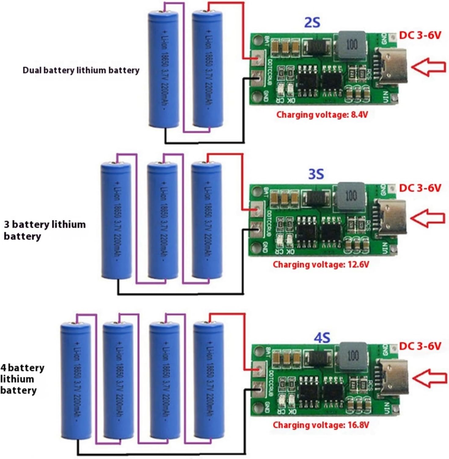 4S batteria al litio ricarica quattro batterie in modo efficiente con la costruzione di circuiti e protezione integrata da sovraccarico/corto raggio per una gestione sicura dell'alimentazione Questo materiale sviluppato con materiali professionali garantisce modulo di ricarica compatto per prestazioni termiche ottimali e durata per il funzionamento avanzato nei progetti elettronici Embettde Caratteristiche: doppi indicatori LED (per lo stato di carica, OK per la carica completa) e converte l'ingresso DC3-5 V in uscita da 16,8 V Ideale per gli appassionati di elettronica, produttori e ingegneri che necessitano di una soluzione di ricarica al litio Multicell affidabile in impianti doganali Perfetto per configurazioni di immagazzinamento dell'energia solare, batteria droni, stazioni di alimentazione portatili e dispositivi industriali che richiedono una manutenzione stabile della batteria 4S