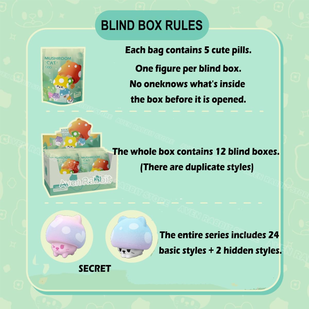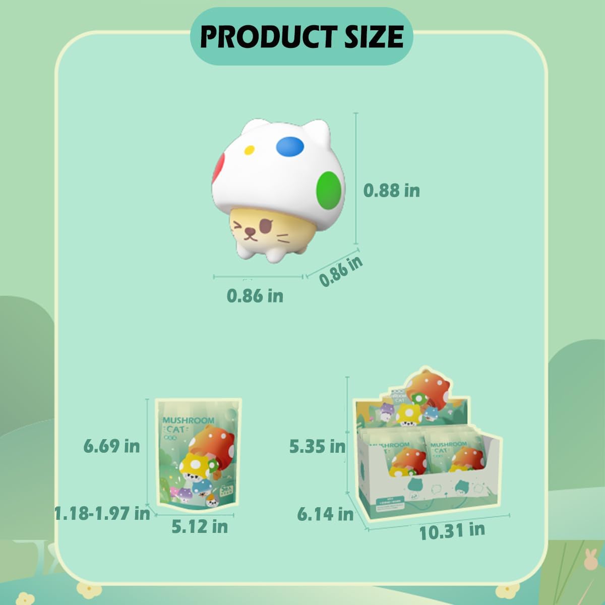 Nome del prodotto: i giocattoli Mushroom Cat Series Blind Box sono oggetti da collezione che vengono forniti in una scatola sigillata. Il contenuto è sconosciuto agli acquirenti fino all'apertura. Questa serie contiene 24 personaggi regolari e due edizioni nascoste. Cute Size Toys: l'altezza di ogni personaggio è di circa 0,88 pollici. Misuriamo manualmente la dimensione. Lievi variazioni sono considerate normali. Design casuale: ogni borsa cieca è disposta in modo casuale. È possibile ottenere l'output nascosto in ogni singola scatola con una probabilità di 2/96. Quindi, se lo ottieni, congratulazioni, sei molto fortunato! Materiale: PVC atossico, innocuo e inodore. I simpatici personaggi della scatola portafortuna dei colori dei personaggi sono vivaci e non sbiadiscono facilmente. La superficie è liscia e ha un'alta qualità. Regalo perfetto: regalo a sorpresa per gli amici per compleanni, Natale, Halloween, San Valentino e molto altro ancora. Da mostrare in casa, bomboniere, accessori da scrivania o in auto. I personaggi sono carini e un regalo giocattolo da collezione. Un'opera d'arte che esprime sentimenti ed emozioni.