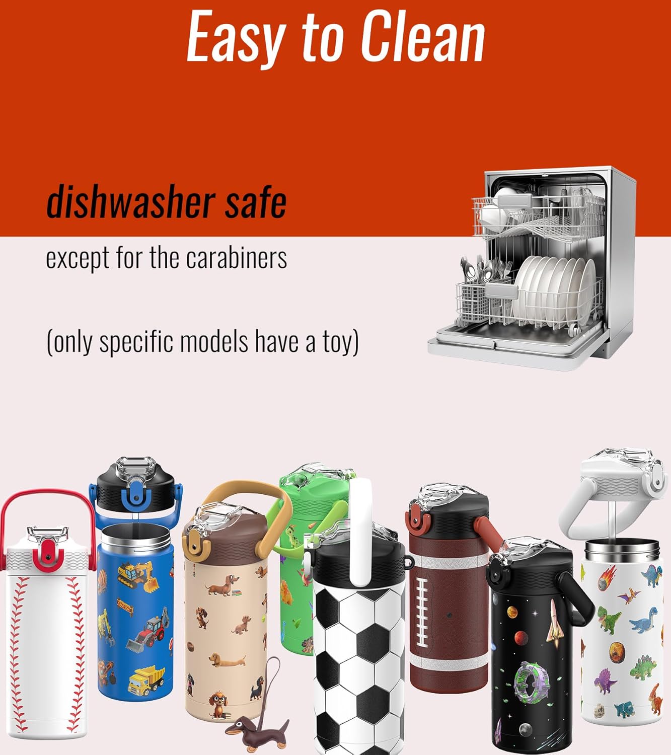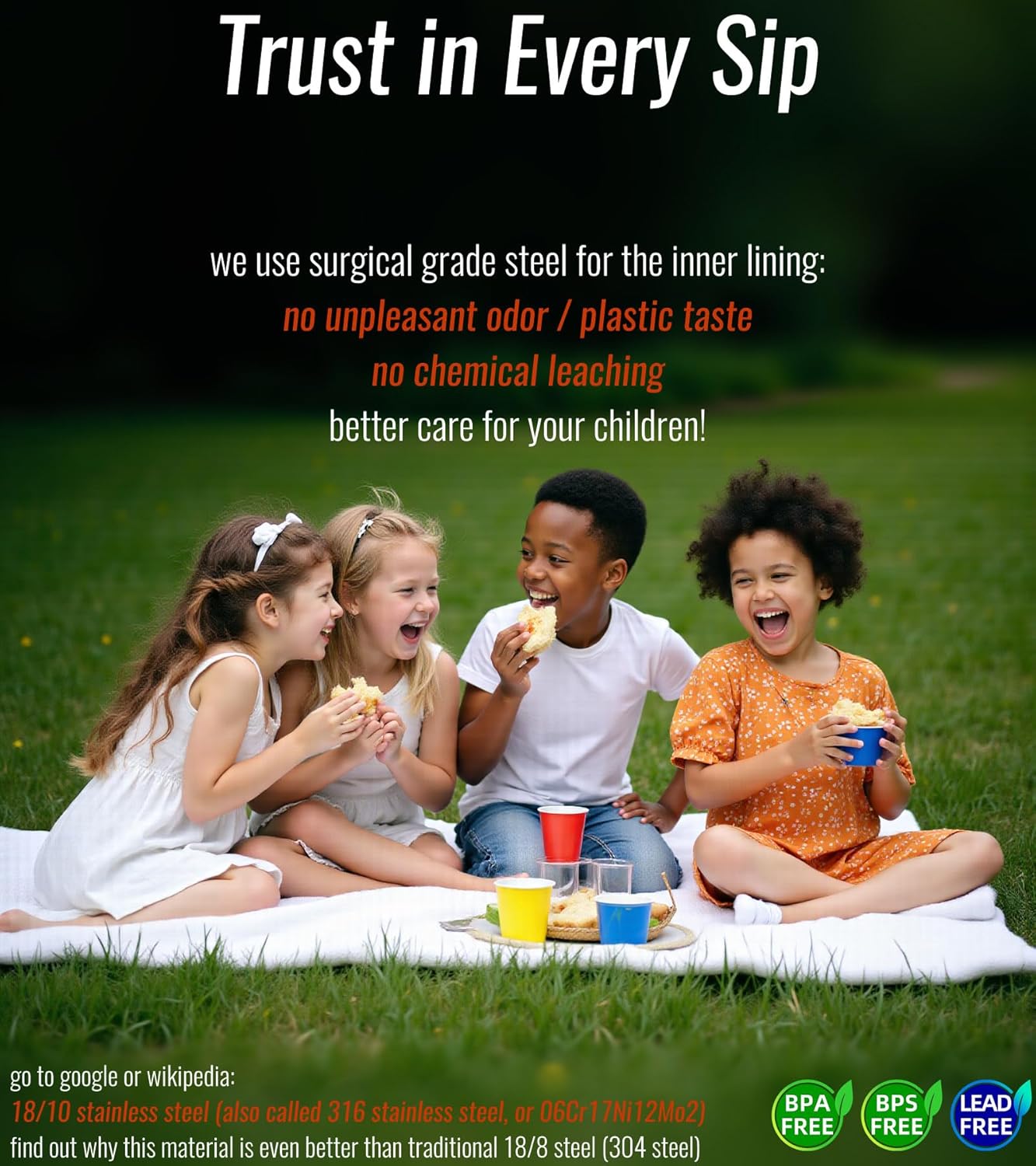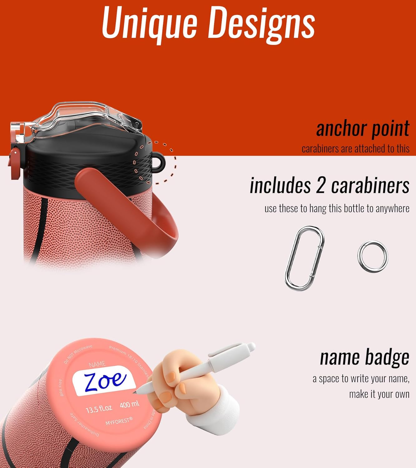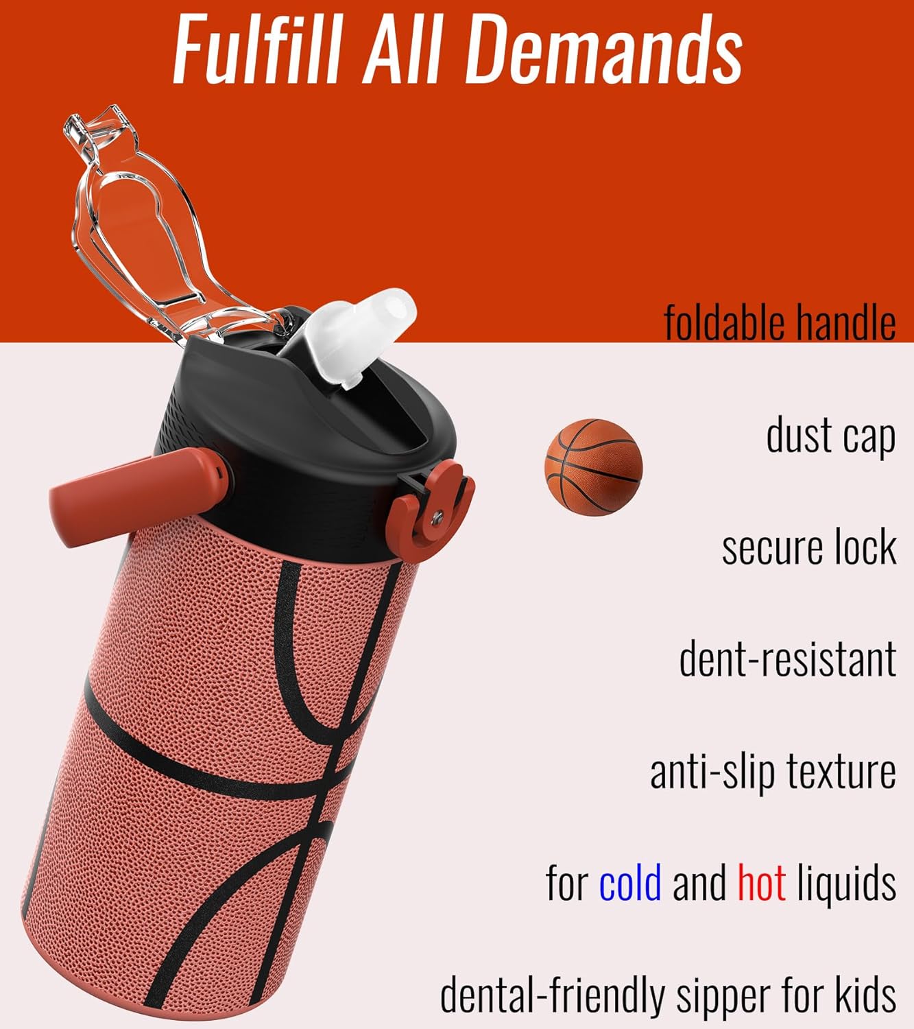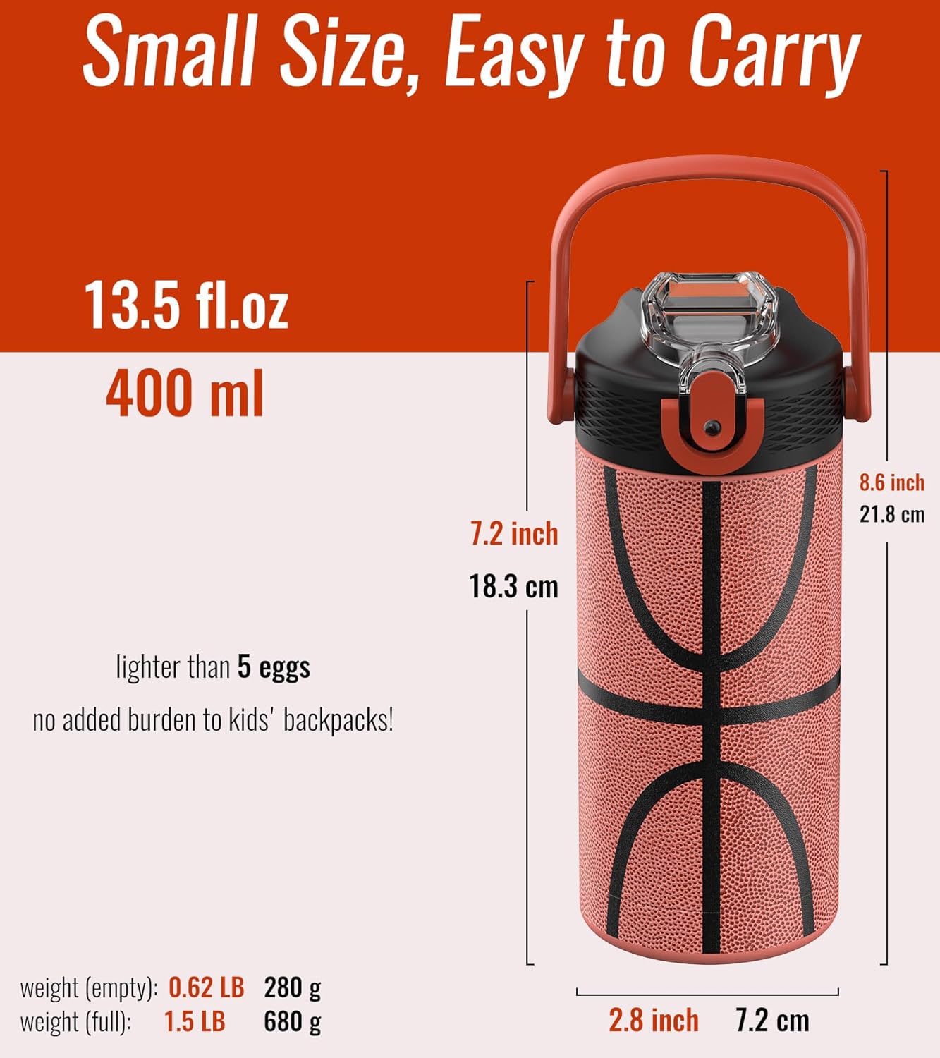 Salute senza compromessi: il guscio interno è realizzato in acciaio inossidabile 18/10 di alta qualità (SUS 316), noto per la sua eccellente stabilità chimica e biocompatibilità ed è ampiamente utilizzato negli strumenti chirurgici. ● Niente più sapore metallico, odore di plastica e lisciviazione dannosa. A differenza del più economico acciaio inossidabile 18/8, è chimicamente molto meno dannoso. Eccellente affidabilità: adatto a tutte le bevande - bevande calde ghiacciate e fumanti, succhi frizzanti o limonate - nessuna ruggine, nessuna muffa, nessun trasferimento di sapore. Mentre i concorrenti risparmiano sugli economici gusci interni in acciaio inossidabile 18/8 (SUS 304) che possono guastarsi in caso di uso intensivo, il nostro guscio interno rimane neutro come il vetro. ● Senza BPA, senza BPS e lavabile in lavastoviglie. Pratico: maniglia pieghevole, tappo pieghevole per bere velocemente, coperchio igienico antisporco e chiusura sicura per la protezione dalle perdite. Due moschettoni per appenderlo. Personalizza il pavimento con il nome del tuo bambino. ● Isolamento sottovuoto con strato aggiuntivo di rame per prestazioni ottimali: mantiene le bevande fredde per oltre 12 ore o calde per oltre 8 ore. Dimensioni pratiche per mani piccole: diametro 7,2 cm x altezza 18,3 cm, capacità 400 ml: ideale per mani piccole senza essere troppo pesante. Pesa solo 280 g vuoto e 680 g pieno. ● Estremamente robusto: il rivestimento migliorato e resistente ai graffi resiste a urti e cadute. Il nostro guscio esterno spesso 0,5 mm è quasi impossibile da danneggiare anche per i ragazzi più selvaggi. 7️⃣ Motivo e accessori: motivo realistico della superficie del basket. I punti e le linee irregolari sembrano 3D. Un piccolo anello a molla rotondo e un moschettone lungo 5 cm.