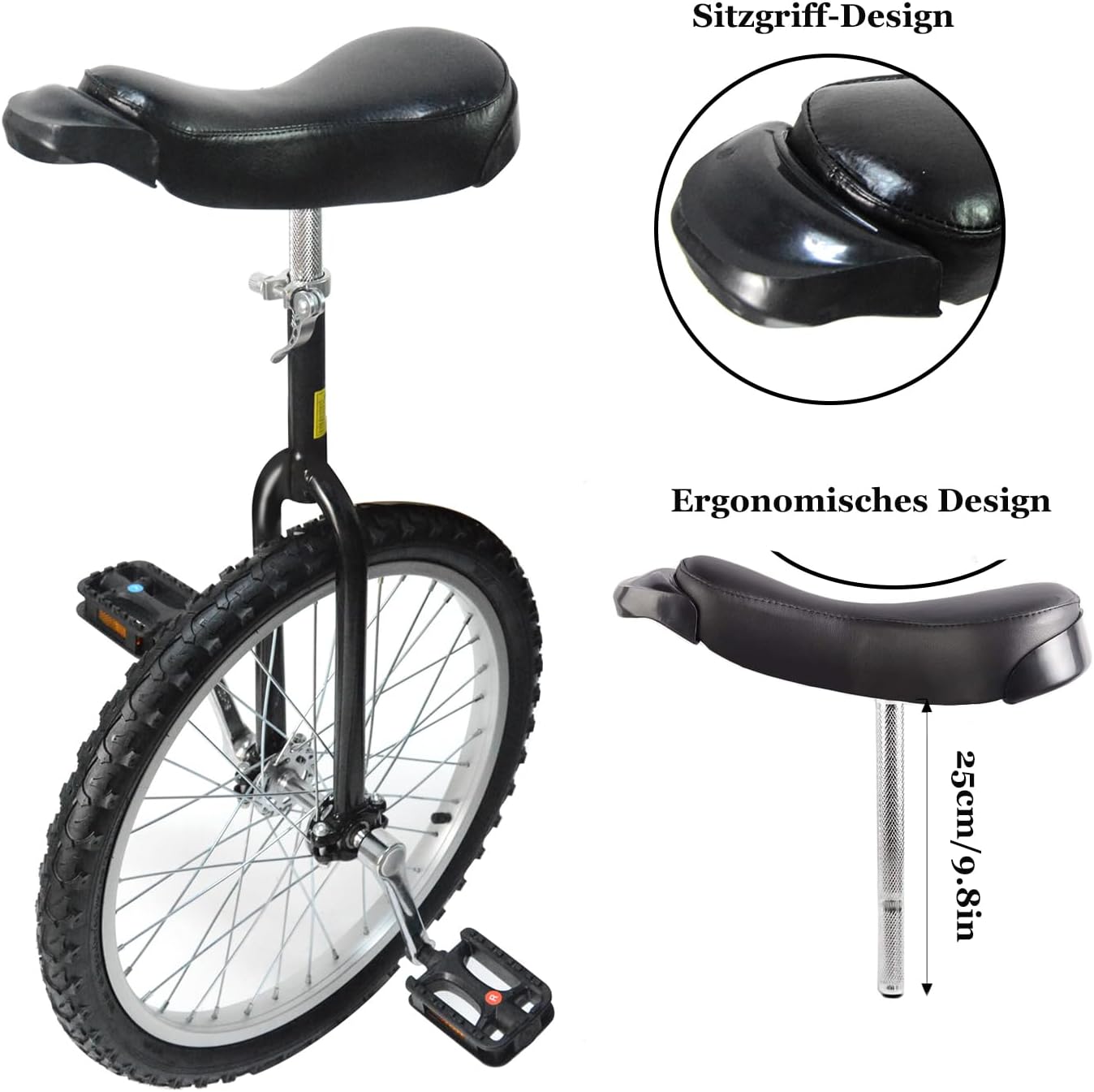 Robusto: questo monociclo da 20 pollici è realizzato in acciaio al carbonio ad alta resistenza, con un telaio in acciaio al carbonio resistente e durevole e cerchi in alluminio per sicurezza e stabilità. Il monociclo nero ha un'elevata capacità di carico fino a 90 kg. Regolabile in altezza: la sella è morbida, confortevole e dalla forma ergonomica. L'altezza può essere regolata facilmente e comodamente utilizzando le chiusure a sgancio rapido sulla sella (serrare le chiusure dopo la regolazione per garantire la stabilità del sedile). Adatto per un'altezza di 160-180 cm. Pneumatici in gomma da 20 pollici: il monociclo è realizzato con pneumatici in gomma di alta qualità con buona resistenza all'abrasione. Diametro del pneumatico in gomma: 20 pollici, raggi: 32, i pedali sono realizzati in materiale in lega di alluminio + ABS con particelle antiscivolo sulla superficie per garantire un utilizzo sicuro. Può essere guidato su strade, montagne, erba, strade sterrate e altre superfici. Balance Training: Ideale per principianti e professionisti. Un monociclo richiede molta abilità, controllo del corpo e coordinazione, può promuovere coordinazione e reattività. Perfetto per attività sportive, di allenamento e di tempo libero. Nota: è necessario controllare le condizioni del monociclo prima di esercitarsi, regolare l'altezza e la direzione del sedile e serrare la vite di fissaggio del sedile. L'area pratica è quanto più pianeggiante possibile. Il posto migliore per esercitarsi è un campo da basket o da baseball circondato da filo spinato.
