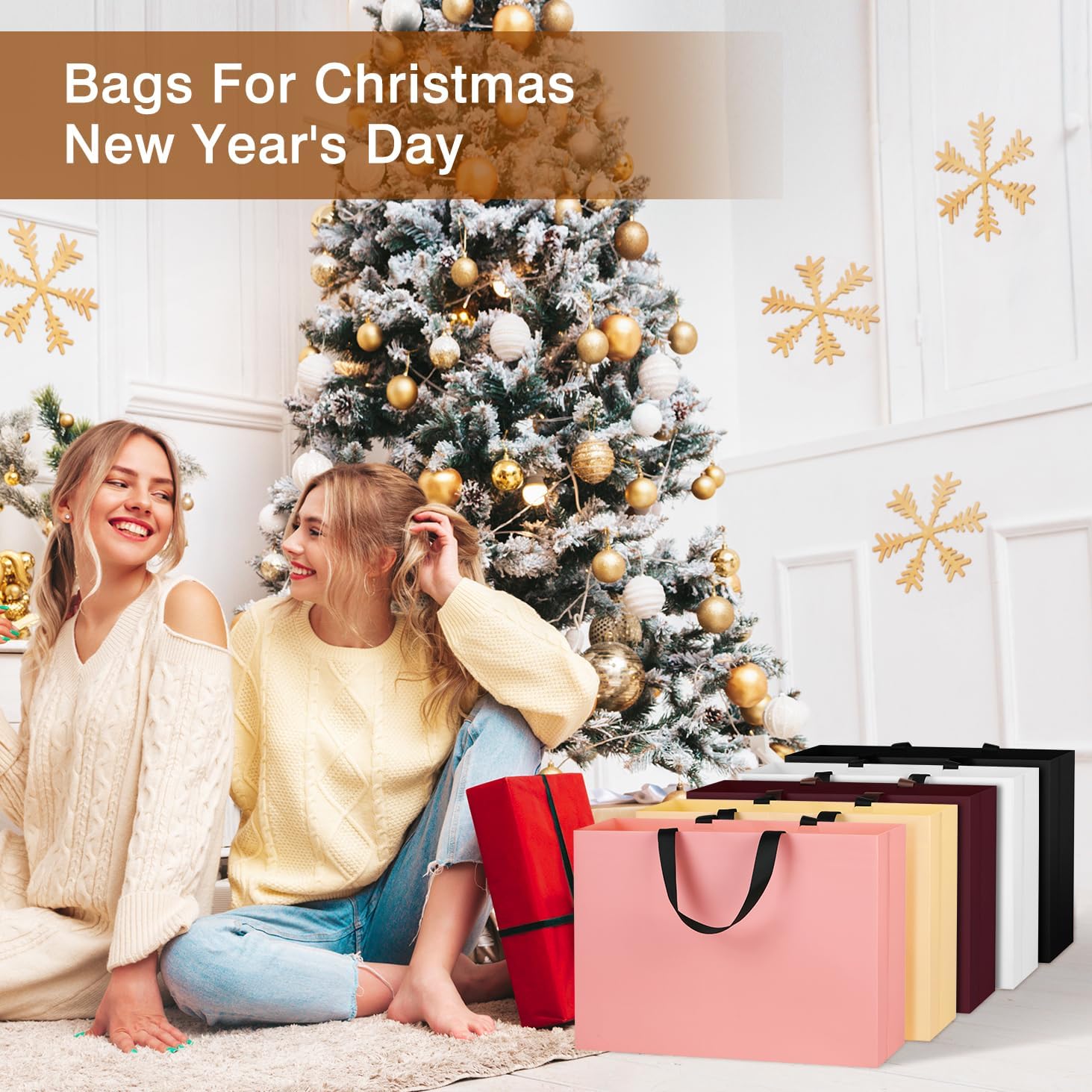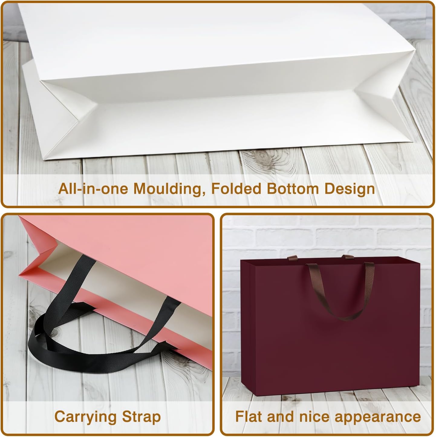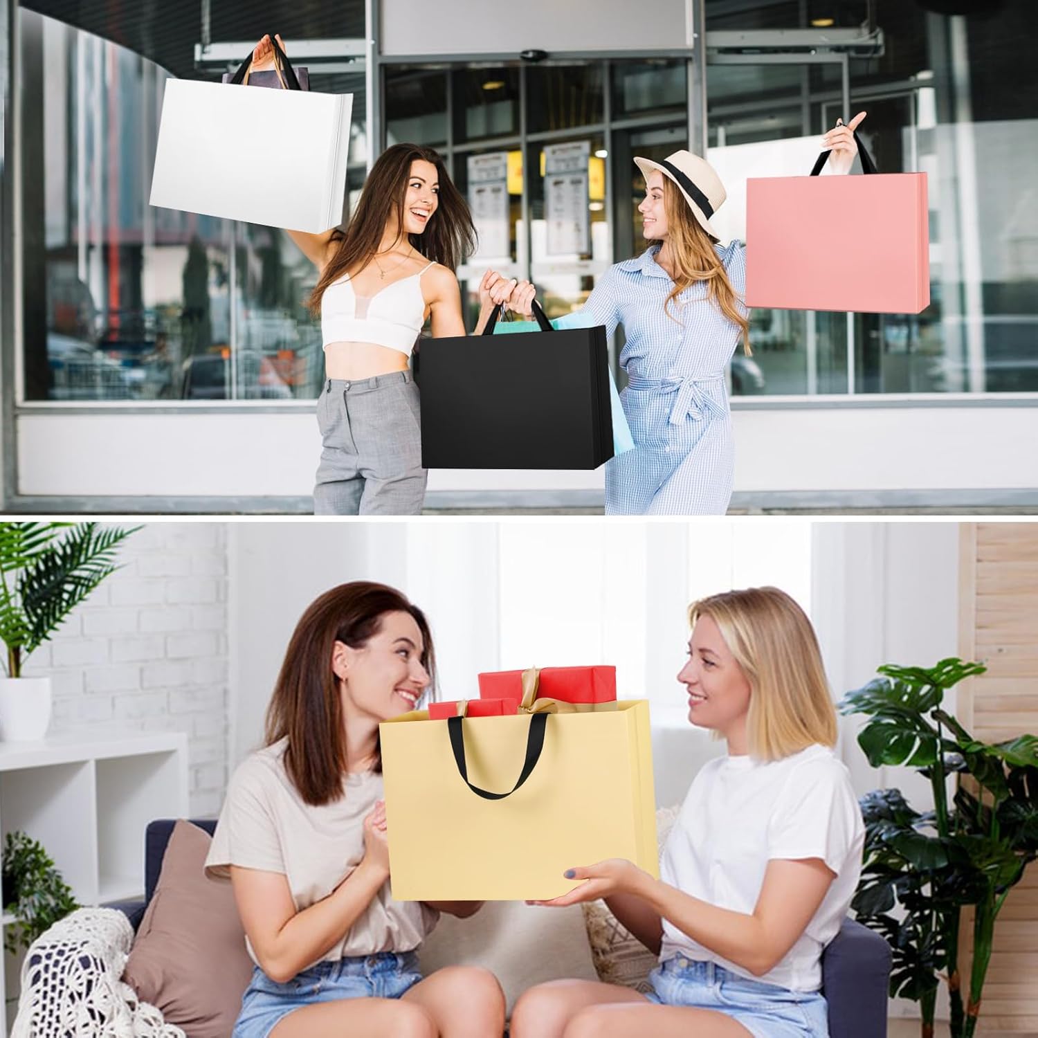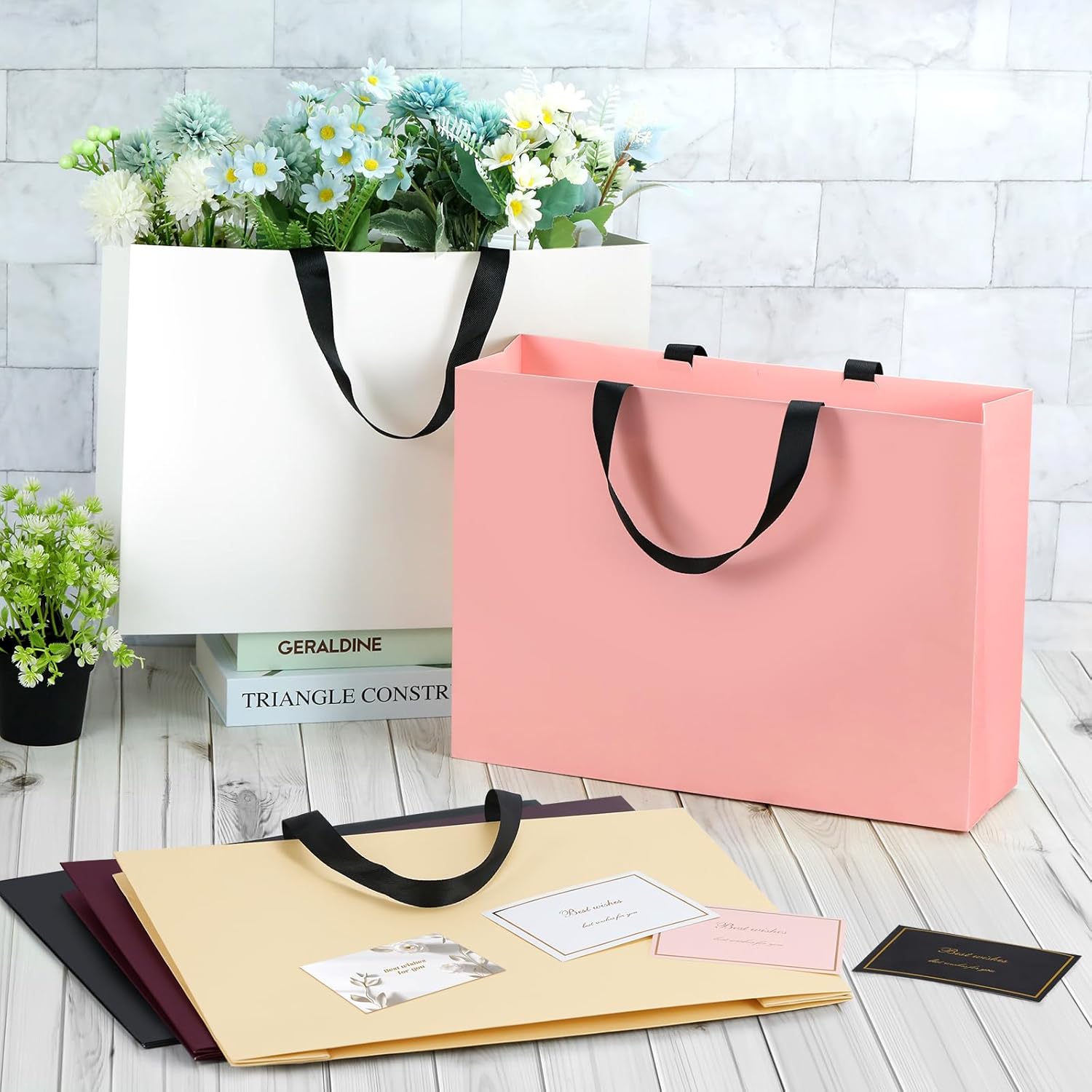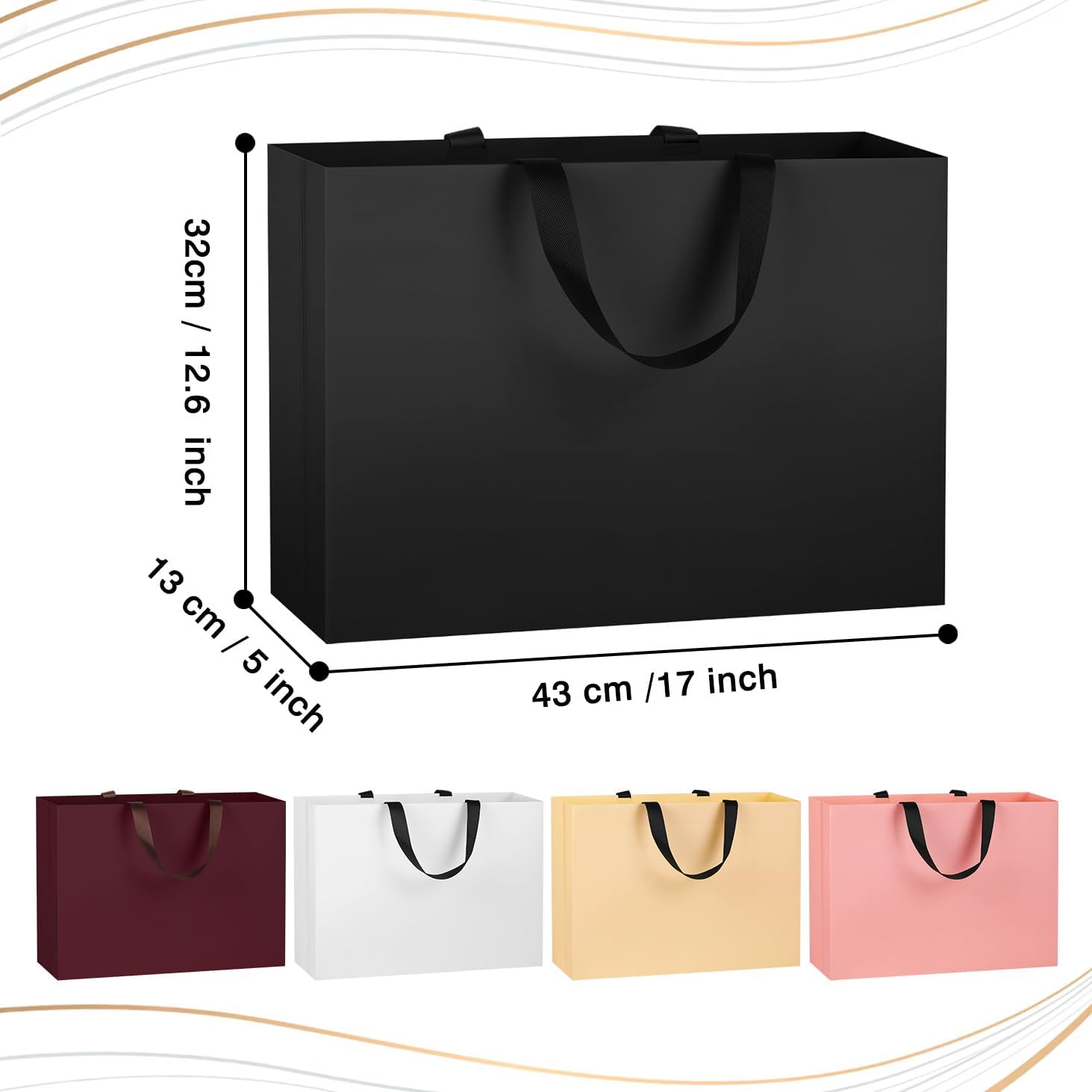 Sacchetto regalo di grandi dimensioni: la confezione è composta da 2 sacchetti regalo bianchi e 2 biglietti, ciascuno con una dimensione di 43 x 32 x 13 cm (17 x 12,6 x 5 pollici). I sacchetti regalo extra large sono alla moda e pratici allo stesso tempo, ideali per indumenti extra large, coperte, giocattoli di peluche, album fotografici e cornici, ecc. Durevoli: i nostri sacchetti sono realizzati in cartone spesso di alta qualità. Sono stabili, durevoli, riutilizzabili e biodegradabili. Le borse sono dotate di robuste maniglie in corda che possono sopportare bene il peso. Estetica classica: minimalista in bianco senza tempo, si adatta sia alle occasioni casual che formali. Senza motivi o lettere sul sacchetto regalo, i nostri sacchetti di carta bianchi consentono vari disegni o lettere creativi. Molteplici usi: è perfetto per confezionare regali extra large, regali per damigelle d'onore, regali di nozze, regali aziendali, regali di San Valentino, regali per la festa della mamma, regali di laurea e regali per feste. Molteplici occasioni: i sacchetti regalo grandi sono ideali per occasioni più formali, come matrimoni, Natale, serate di lavoro o eventi aziendali. Può essere utilizzato anche nella vita quotidiana e si adatta a occasioni informali come i tea party, dove si preferisce un packaging semplice ed elegante