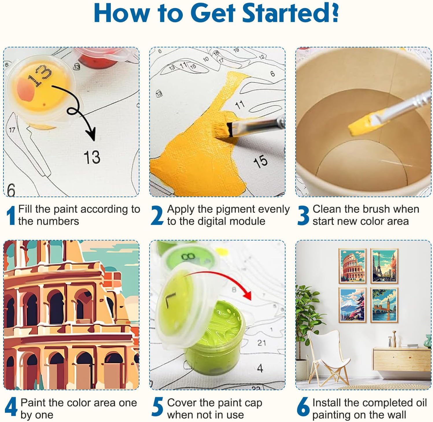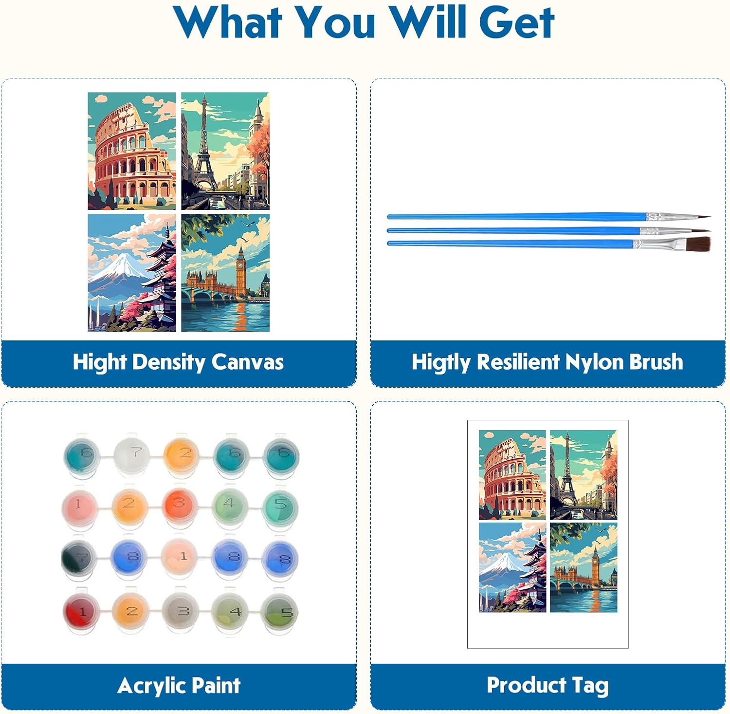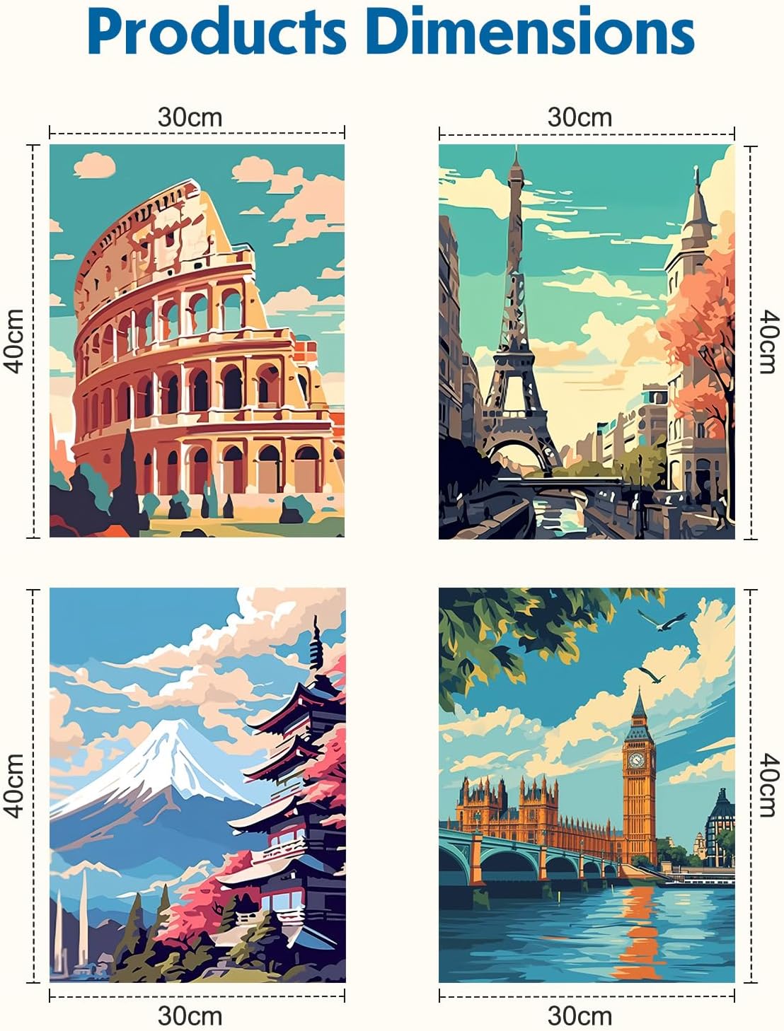 Adult Paint by Number: Paint by numbers kit è un ottimo modo per rilassarsi. E 'divertente e facile, nuovi hobby per le donne e dipingere principianti, diy arti e artigianato kit. Basta godere di creare una splendida opera d'arte, tutti potrebbero essere un buon artista Facile da dipingere: La tela strutturata prestampata mostra esattamente dove dipingere ogni colore. Questo kit di vernice per numeri è adatto a tutti, età e abilità di disegno non importa. Hai solo bisogno di dipingere seguendo i numeri in tela, quindi creerai un quadro eccellente da solo Decorazione perfetta: Questa Pittura di Numero è una grande decorazione per la vostra casa o può essere data ad amici, familiari o persone care come un regalo sentimentale. La tela è un grande pezzo di arredamento per uffici, camere da letto, case vacanze, bagni, soggiorni, ecc Migliora la qualità della vita: Attività calma e rilassante per ridurre lo stress e l'ansia, migliorare le tue abilità pittoriche. Paint by Numbers può aumentare la tua fiducia, rafforzare la tua memoria, sviluppare le tue capacità di problem solving. Aumentare l'autostima coltivando creatività e crescita. Un ottimo modo per stimolare il cervello per ragazzi e ragazze, adolescenti, studenti, adulti Cosa otterrai: 4 pezzi di bella tela pre-disegnata di disegno del modello su cornice per la festa di pittura degli adulti, 4 set di vernice acrilica, 16 pennelli di alta qualità, 4 cartoline di colore guida per riferimento