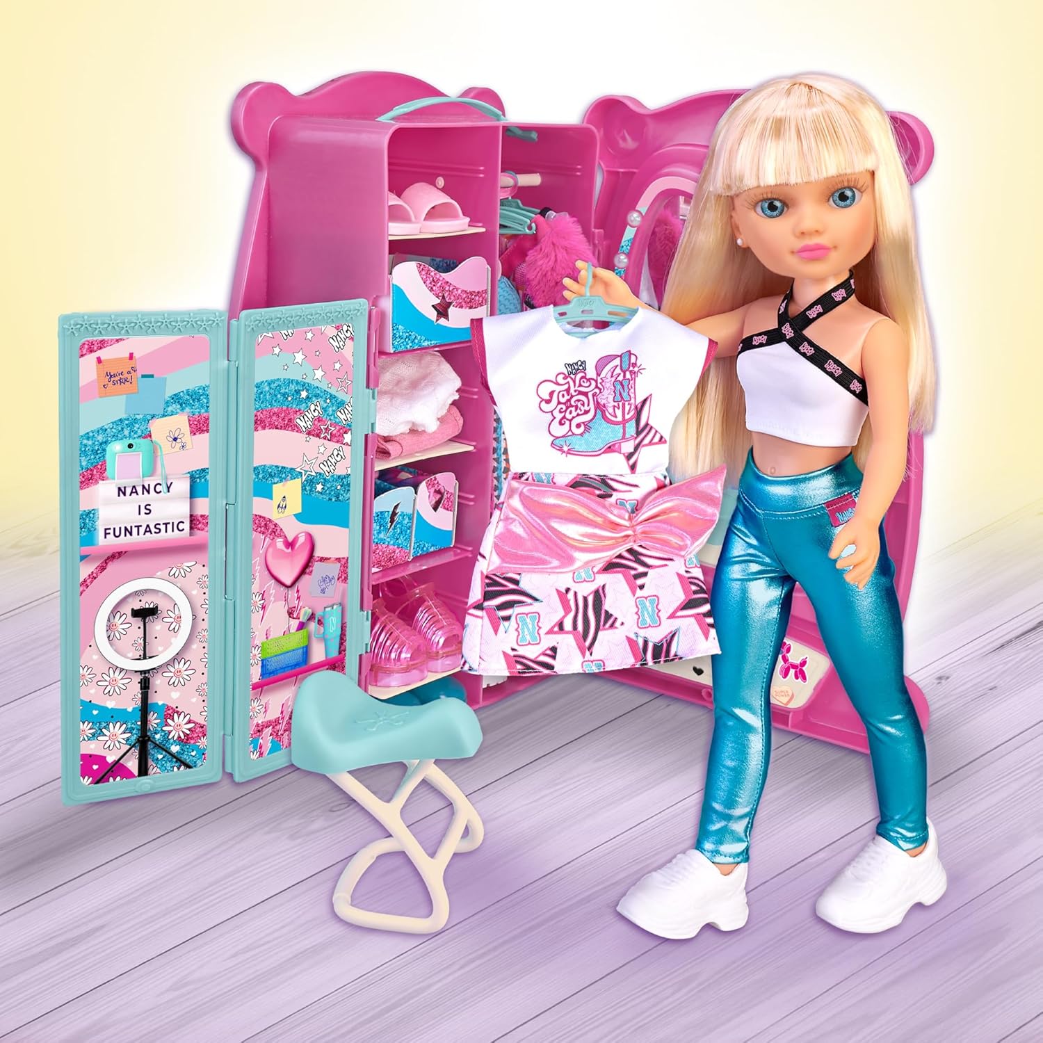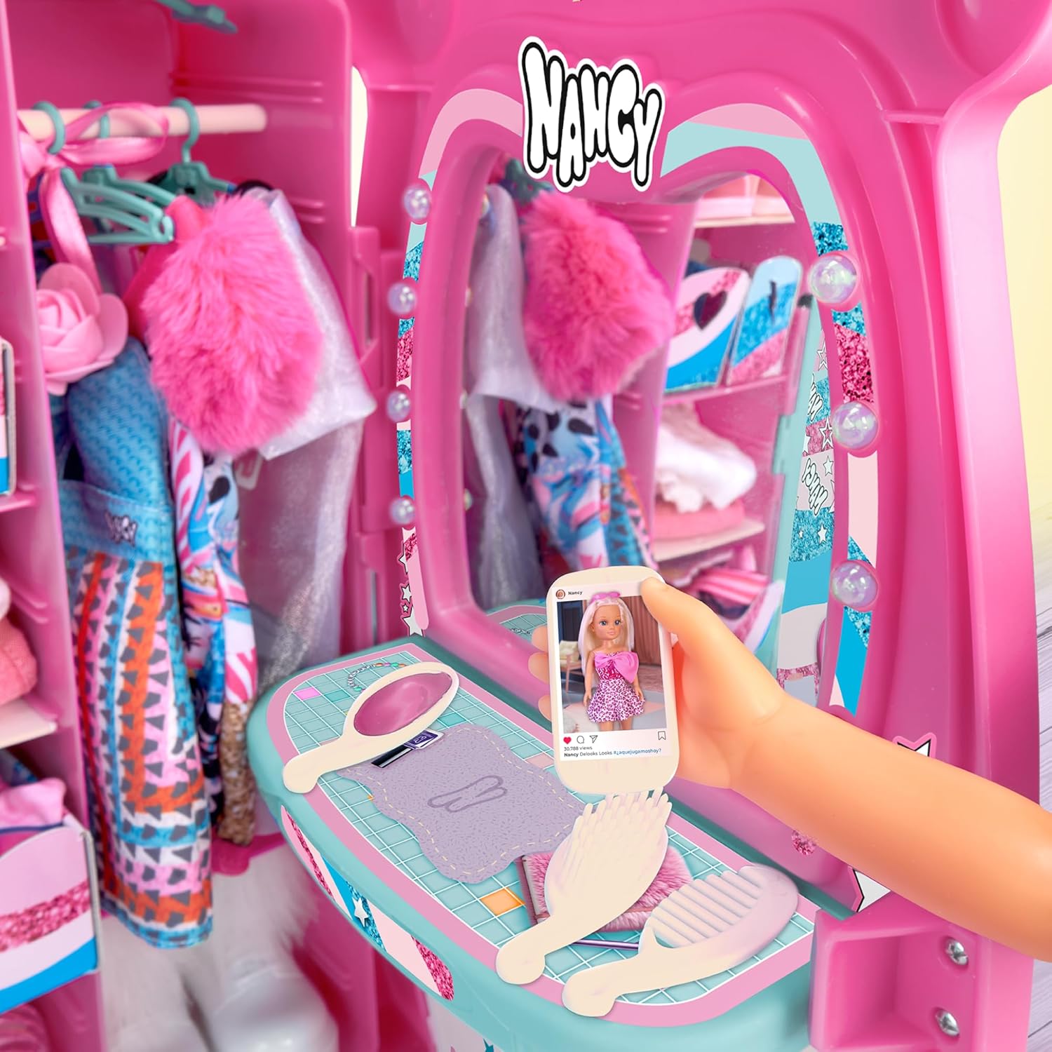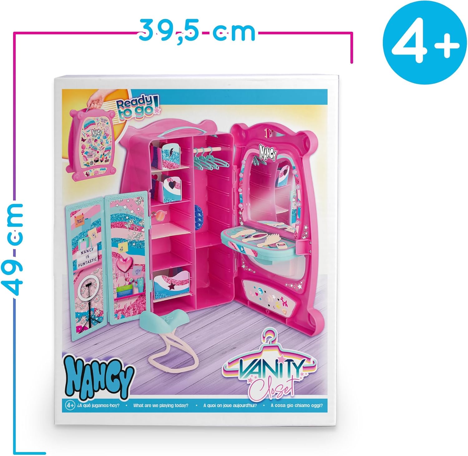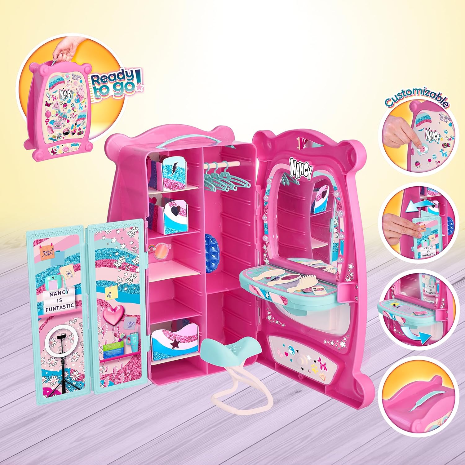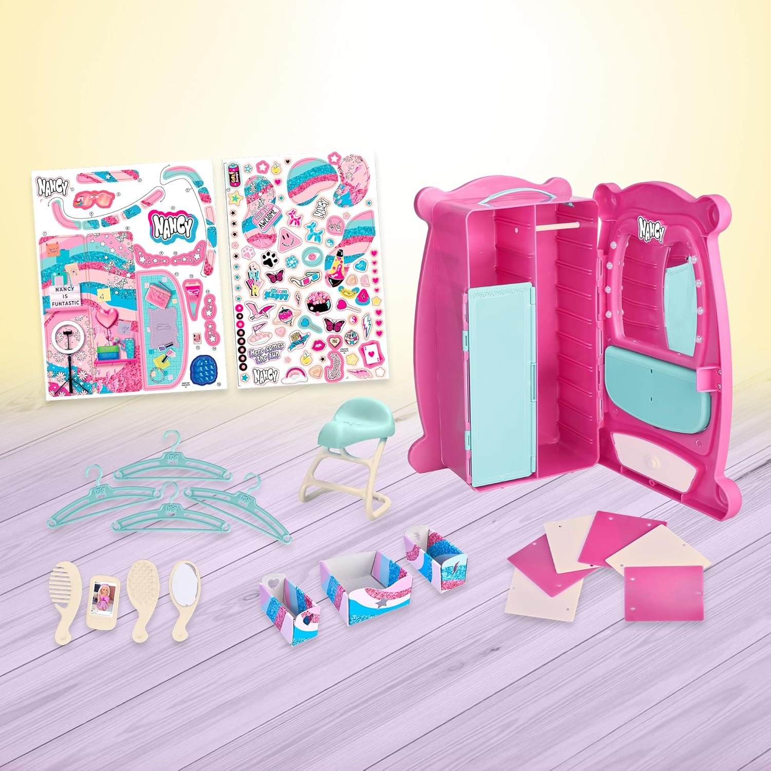 L'armadio da toeletta di Nancy è un pratico set 2 in 1 che si trasforma in un elegante comò con specchio da un lato e in un armadio completo con barre e cassetti dall'altro, offrendo tutto il necessario per riporre e preparare i look più alla moda di Nancy Questo set presenta un bel paravento che permette di separare le zone di spogliatoio e vanità, creando uno spazio più intimo ed esclusivo per far cambiare i vestiti e prepararsi in totale comfort prima di ogni grande occasione La toletta dispone di uno specchio spazioso in modo che Nancy possa provare accessori e truccarsi come un'intera stella; inoltre il set include una seduta per un maggiore comfort mentre si fissa e dà gli ultimi tocchi al suo look L'armadio è dotato di barre per appendere abiti e set preferiti di Nancy, nonché cassetti per organizzare accessori, scarpe e tutto il necessario per completare qualsiasi outfit con stile e ordine Per un'esperienza ancora più realistica e divertente, il set viene fornito con uno speciale gancio che permette di appendere i vestiti di Nancy e mantenere il suo guardaroba impeccabile; un must per ogni fan della moda e la bambola più iconica