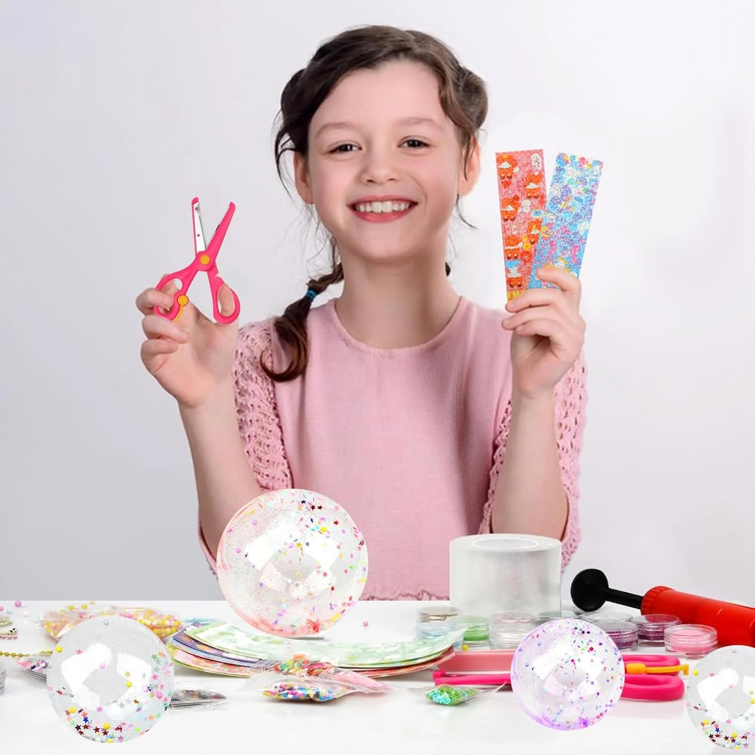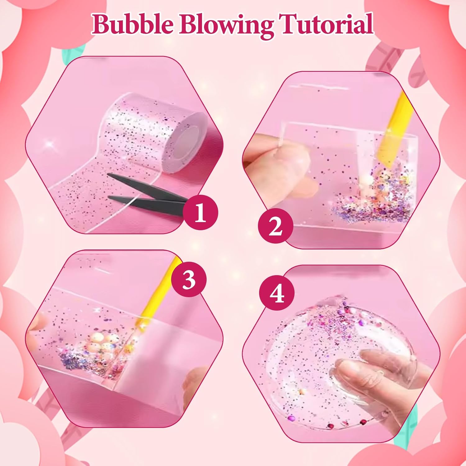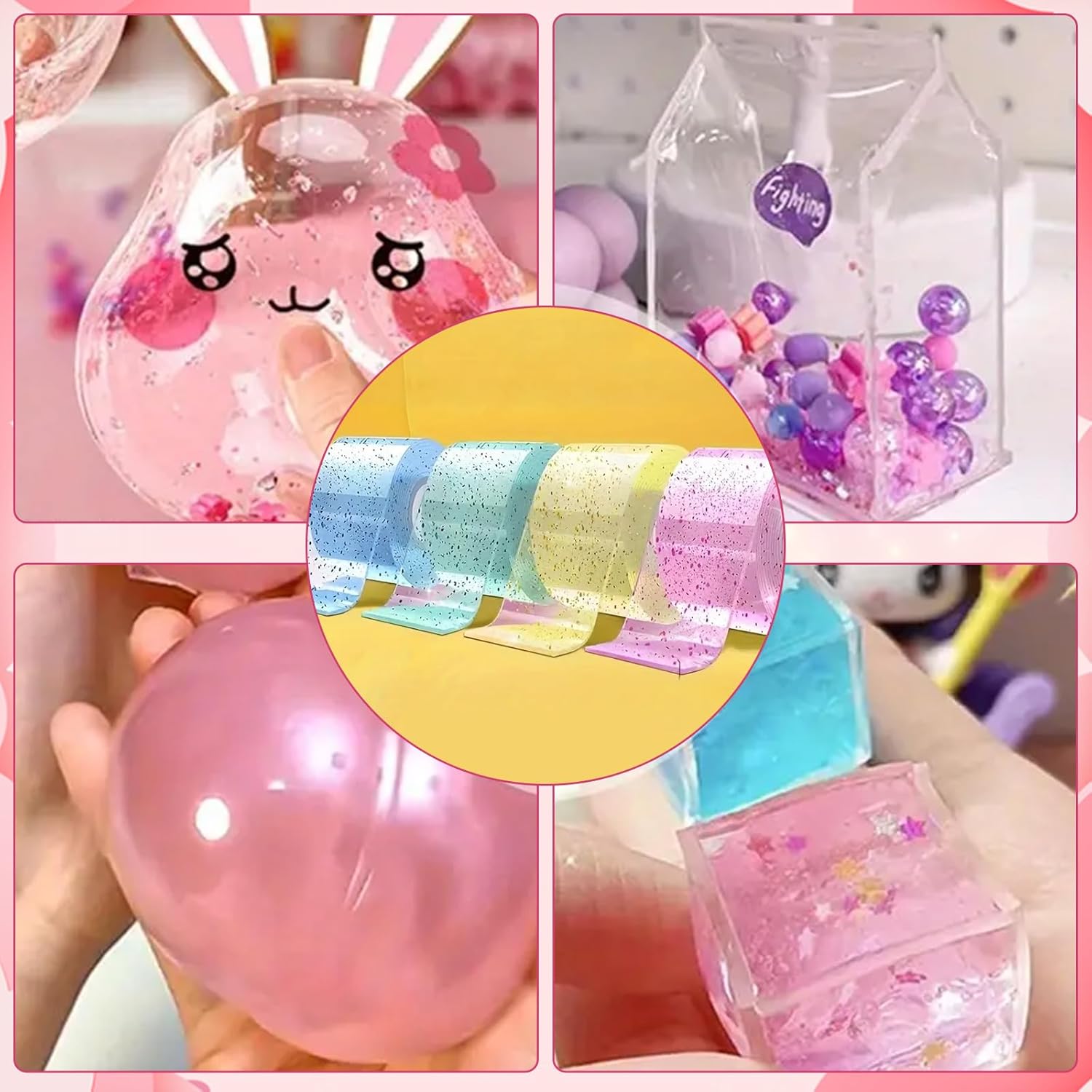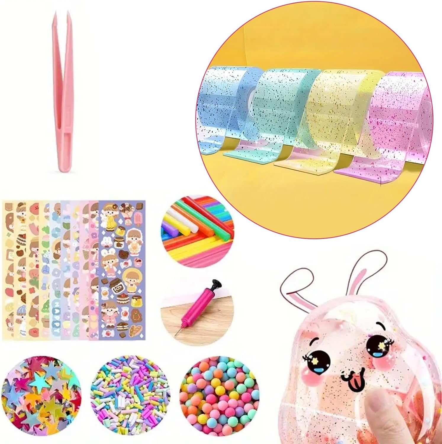 Nano Tape Bubbles Set: questo set di bolle, Nano Tape Bubbles per bambini comprende un totale di 70 prodotti, tra cui 4 rotoli di nastro nano (verde, blu, giallo e rosa, ogni rotolo è lungo 3 metri), 12 colori di impasto super leggero, 10 adesivi carini, 6 adesivi per il viso, 12 tipi di polvere glitterata, 10 catene colorate, 10 cannucce, 1 tubetto di paillettes a forma di stella, 1 confezione di decorazioni di zucchero, 1 confezione di decorazioni di zucchero. Confezione di palline colorate. 1 pinzetta, 1 forbici, 1 pompa ad aria, ecc. Tutto ciò di cui hai bisogno per progetti creativi di bricolage! Materiale di sicurezza: questo set di bolle, nano nastro, è durevole e sicuro per i bambini e quindi una grande attività familiare per creare bellissimi giocattoli a palloncino nano. Sia che tu voglia trascorrere del tempo prezioso con la tua famiglia o dare ai tuoi bambini la possibilità di dare libero sfogo alla loro creatività, con questo set puoi creare giocattoli Nano unici in modo sicuro e divertente. Con il nostro set Nano Tape Bubbles è possibile creare facilmente un giocattolo antistress: prima tagliare la lunghezza del nastro nano in base alle proprie esigenze (la dimensione standard consigliata è di 15-20 cm), piegare l'interno del nastro in una borsa e lasciare un'estremità vuota. Quindi riempire l'apertura con cotone, paillettes o qualsiasi altro materiale a scelta, allineare l'ugello della pompa ad aria sopra il bordo dell'apertura, premere leggermente e gonfiare lentamente. Dopo il gonfiaggio, premere saldamente il bordo dell'apertura per chiuderla, quindi rimuovere la pellicola protettiva esterna trasparente. Stimola la creatività del tuo bambino: il set di bolle di nastro nano è ottimo per stimolare l'immaginazione del tuo bambino. Puoi creare palloncini unici, palloncini d'acqua o palline morbide decorative. Libera la tua creatività con l'aiuto degli strumenti decorativi. Effetto antistress unico: il set di bolle di nastro nano per creare e impastare la nanocolla può alleviare lo stress durante il lavoro e lo studio. Il processo di produzione può anche promuovere le capacità pratiche dei bambini e trasmettere loro il divertimento della vita che la nanocolla porta con sé. Se il nastro è troppo appiccicoso, applicare una piccola quantità di crema per le mani o acqua per facilitare la lavorazione. Se vuoi creare un palloncino più spesso, basta mettere diverse strisce di nanocolla sopra l'altra e incollarle.