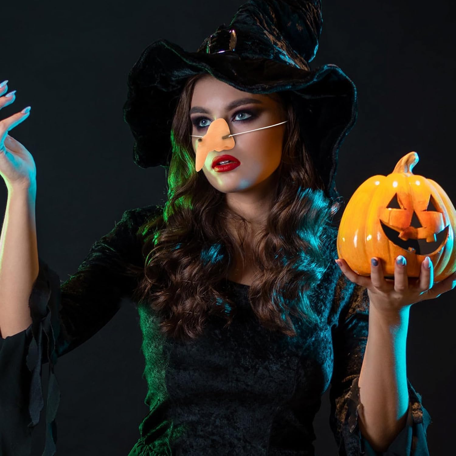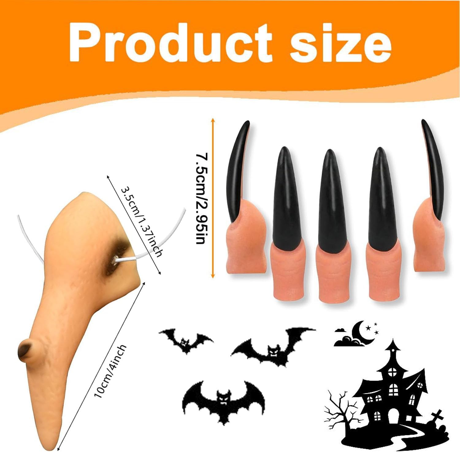 【Accessori per costumi da strega di Halloween】Riceverai un naso da strega con elastico e dieci chiodi da strega neri. Vesti i panni di una strega con le unghie lunghe e un naso caratteristico e goditi il divertimento del gioco di ruolo di Halloween. 【Design realistico】 Il naso della strega e le dita della strega di Halloween sono realizzati con cura per ottenere un aspetto realistico e dettagli intricati. Riflettono perfettamente la classica immagine della strega delle fiabe e dei film e ti regalano un fascino misterioso e inquietante nella notte di Halloween. 【Materiali di alta qualità】 Il naso da strega di Halloween + 10 unghie nere sono realizzati in morbido silicone di alta qualità, elastico, delicato sulla pelle e resistente agli strappi. Vestono in modo sicuro e garantiscono che il tuo costume da strega rimanga intatto durante le celebrazioni. 【Facile da usare】 Il naso da strega è facile da indossare. Simply place the elastic band over your head while pinning the black fingernails on your hands. Completa il tuo costume in un batter d'occhio e diventa subito il centro dell'attenzione in qualsiasi festa di Halloween. 【Uso versatile】 Il naso da strega e le unghie nere sono gli accessori perfetti per costumi di Halloween, giochi di streghe, spettacoli teatrali e feste a tema. Aggiungono un tocco di orrore e mistero al tuo look e ti assicurano di distinguerti in ogni occasione e di vivere un'esperienza indimenticabile.