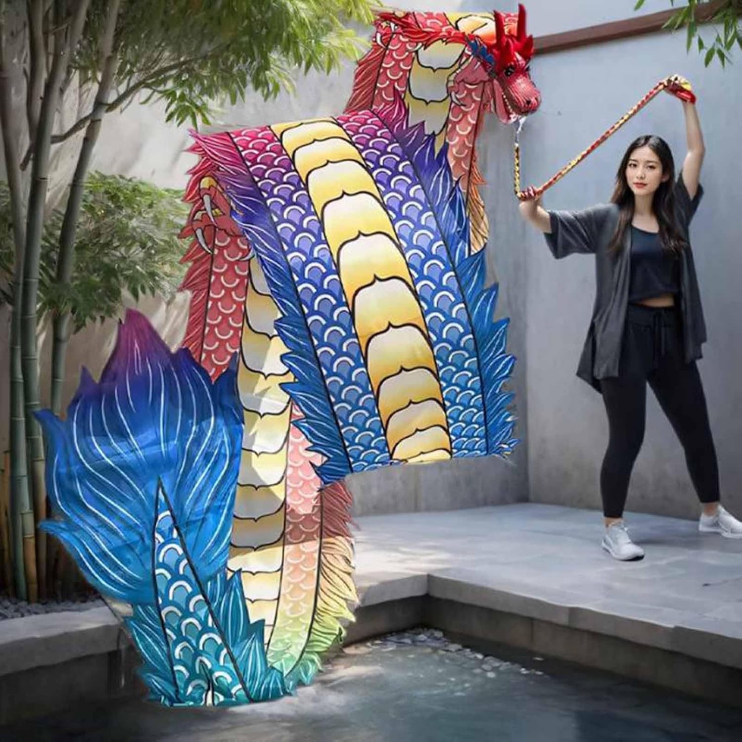 Allenamento completo del corpo: il nastro per fitness all'aperto offre un esercizio dinamico per tutto il corpo, coinvolgendo spalle, collo e colonna lombare migliorando la forza generale. È anche un modo divertente per te e il tuo bambino di divertirti con il gioco attivo. Design realistico: realizzato con seta lavabile per il corpo del drago e plastica resistente per la testa, questa ballerina a nastro mostra una straordinaria fluidità e fascino visivo, rendendolo un'aggiunta attraente alle tue attività all'aperto. Aree di gioco versatili: ideale per luoghi spaziosi come prati, cortili, parchi, piazze, spiagge o feste all'aperto, questa versatile ballerina a nastro è adatta a tutte le età, promuovendo divertimento e fitness per tutti. Accessorio colorato per la danza: il vivace nastro a forma di drago aggiunge eccitazione a varie attività come danza, giochi, allenamento di ginnastica o danza tradizionale cinese, originariamente progettato per celebrare il capodanno cinese e promuovere la gioia festiva. Montaggio e utilizzo semplici: collegare facilmente la corda alla testa del drago e fissarla al nastro. I principianti possono iniziare agitando le braccia e creando un