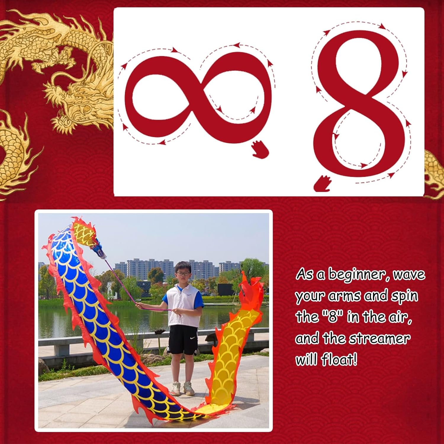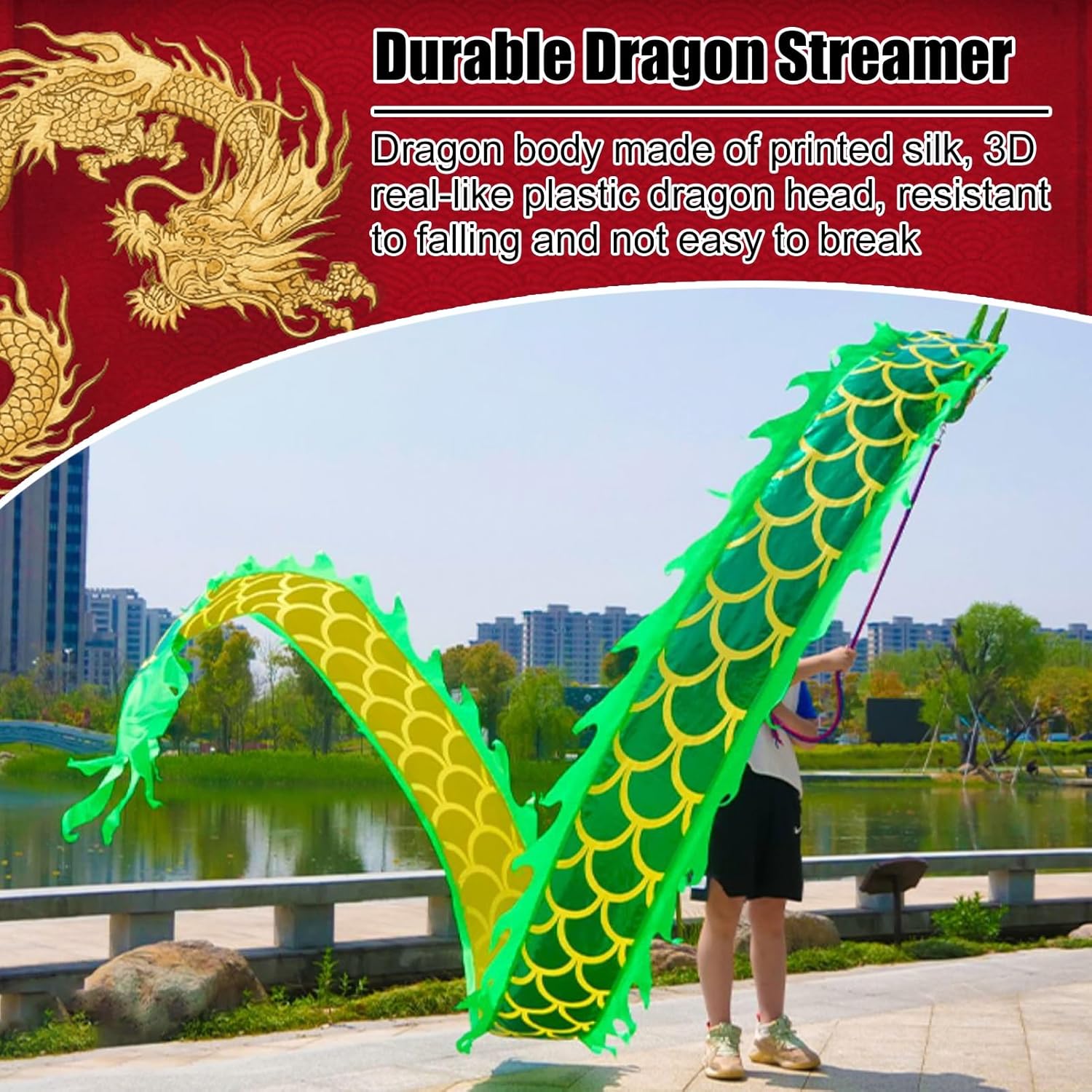 【Danza del drago del nastro Poi】: la danza del drago è un intrattenimento tradizionale cinese. I nastri fluttuanti sono molto decorativi. Porteranno molto divertimento alla tua famiglia. Tengono le persone lontane dagli schermi, ti permettono di divertirti giocando e arricchiscono la tua vita. 【Nastro colorato e resistente del drago】: corpo del drago in tessuto stampato, non raccomandato per il lavaggio, testa di drago 3D in plastica realistica, resistente alle cadute e non facile da rompere, corda lunga e robusta e zaino portatile. 【Nastro da ballo fitness all'aperto】: oscillare i nastri della danza del drago aiuta ad allungare il corpo. Esercita le spalle, il collo e la colonna lombare, migliora la flessibilità articolare e allevia lo stress e l'ansia. 【Regalo creativo e artistico】: i nastri della danza del drago sono il regalo perfetto per adolescenti, adulti e anziani che amano i draghi cinesi! Puoi fare esercizi di fitness, balli, giocolerie e spettacoli di talenti in giardini, parchi, spiagge e altri spazi spaziosi. Facile da montare e utilizzare: lega la corda alla testa del drago, quindi incolla insieme la testa e il nastro. Infine, stringi la corda attorno al drago. Per i principianti, agita le braccia e gira l'"8" in aria in modo che la bobina galleggi.