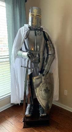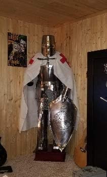 Completamente indossabile e per adulti, ideale per giochi di ruolo dal vivo (gioco di ruolo dal vivo), cosplay, Halloween, travestimenti, oggetti di scena teatrali e rievocazioni storiche. Si tratta di un'armatura a grandezza naturale e l'altezza completa di questa armatura è di circa 195 cm. Dimensioni della base in legno 65 x 60 x 17 cm Realizzato in acciaio: 18 G finitura argento Tutti i prodotti Armor sono realizzati con i migliori materiali Costume medievale indossabile cavaliere crociato completo di armatura da collezione